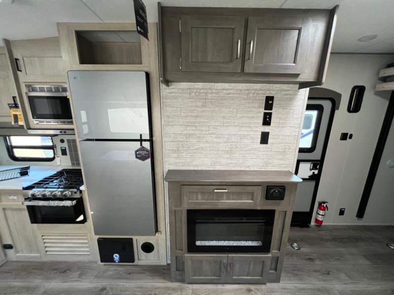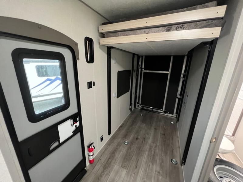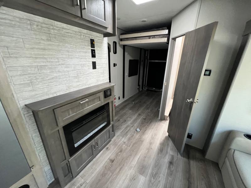 This toy hauler has lots of room for toys and guests! You will love the retreat of the front private bedroom with a queen bed, dual wardrobes and its own entry door. Additional guests can sleep in the double-size bunks with an electric trac bed lift in the cargo area, also with its own entry door. A rear corner bath makes efficient use of space and includes a 24" x 32" shower and a medicine cabinet. The main living area features an entertainment center that can be upgraded with an optional fireplace for maximum coziness. Relax on the sofa or the U-shaped dinette. You'll also appreciate the kitchen with its L-shaped counter, corner sink, microwave, GE stainless 10.7 cu. ft. 12V refrigerator, and three-burner range. Or step outside and use the camper kitchen with a griddle and mini refrigerator!