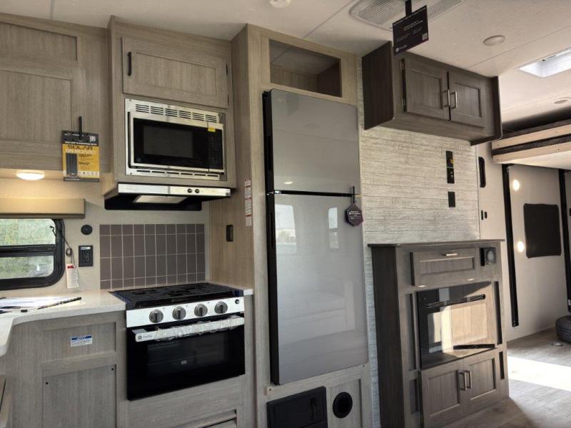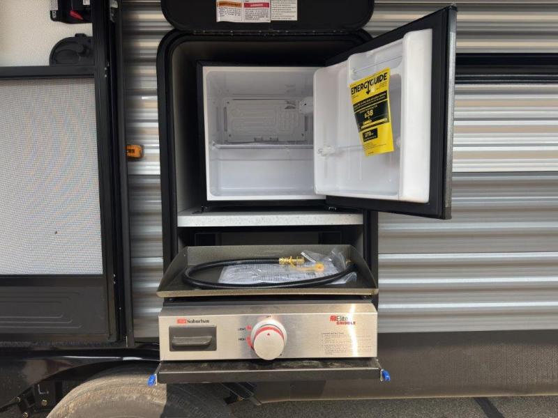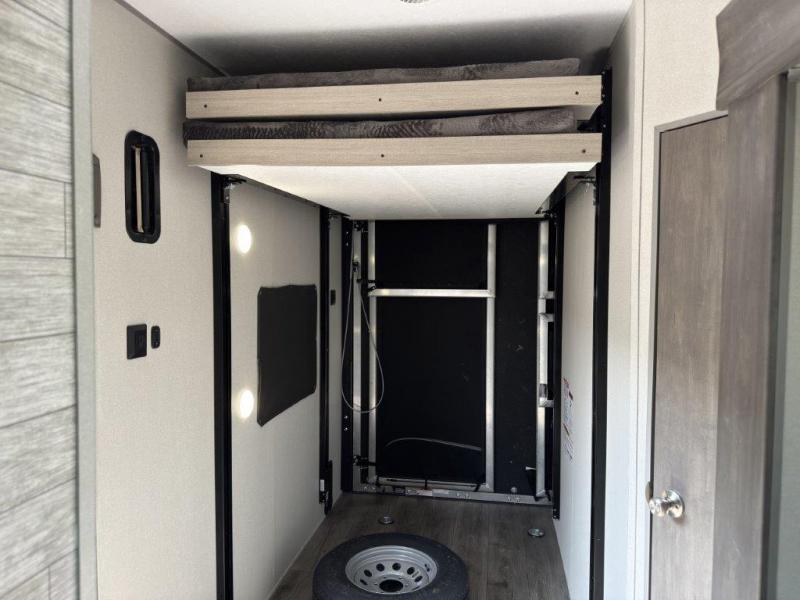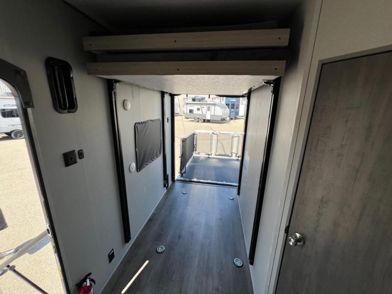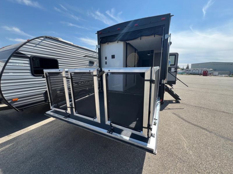 This toy hauler has lots of room for toys and guests! You will love the retreat of the front private bedroom with a queen bed, dual wardrobes and its own entry door. Additional guests can sleep in the double-size bunks with an electric trac bed lift in the cargo area, also with its own entry door. A rear corner bath makes efficient use of space and includes a 24" x 32" shower and a medicine cabinet. The main living area features an entertainment center that can be upgraded with an optional fireplace for maximum coziness. Relax on the sofa or the U-shaped dinette. You'll also appreciate the kitchen with its L-shaped counter, corner sink, microwave, GE stainless 10.7 cu. ft. 12V refrigerator, and three-burner range. Or step outside and use the camper kitchen with a griddle and mini refrigerator!