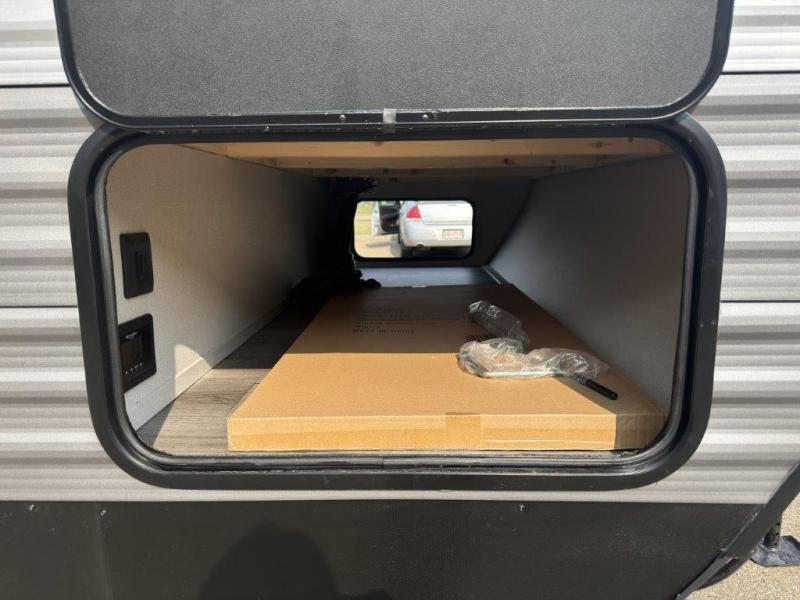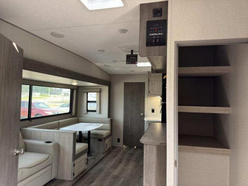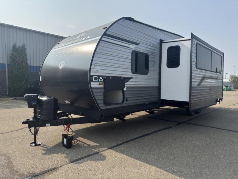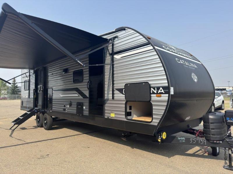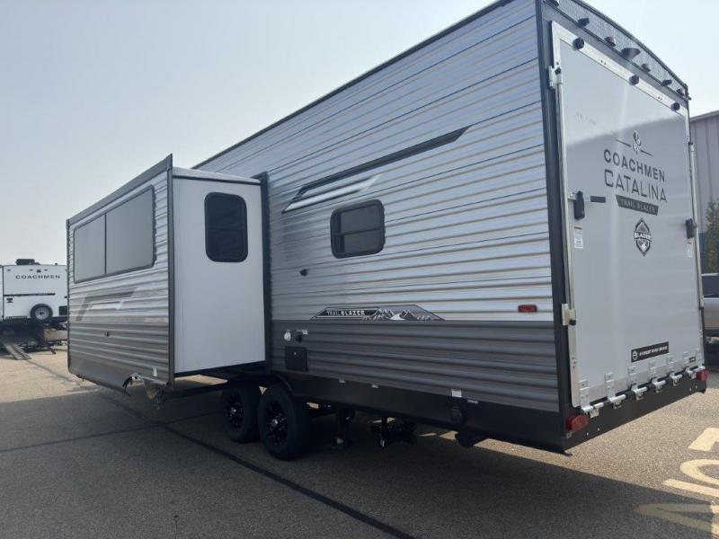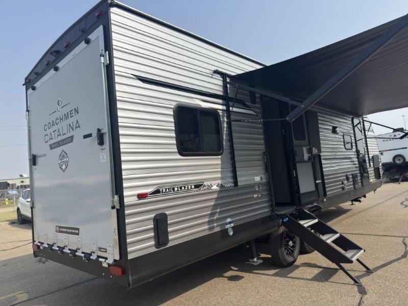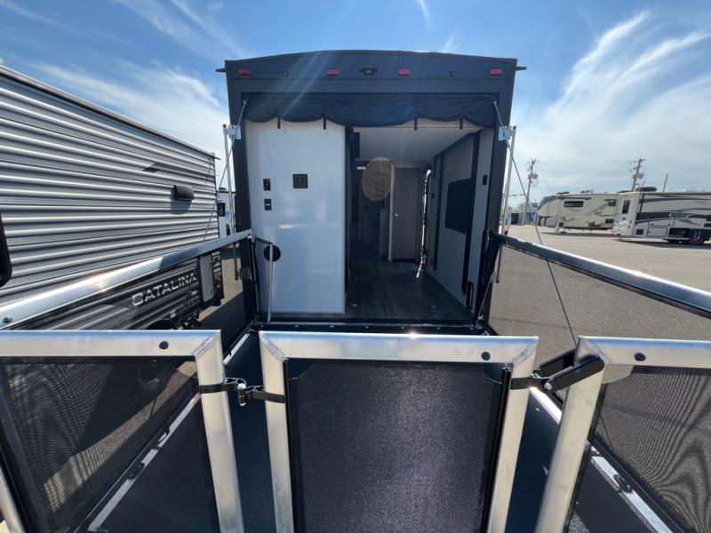The best looking, most affordable toy hauler is found in the Catalina Trailer Blazer by Coachmen. Each one is constructed with a seamless alpha roof membrane, an enclosed and fully sealed underbelly, and a cambered structural steel I-beam frame for added support. There is a rear loading cargo door with a 3,000 lb. capacity, a black out screen wall with a zip walk-thru and windows, plus 500 lb. tie-downs to secure your toys. You'll love the interior with its Congoleum woodplank linoleum flooring and LED interior lighting. Head outside to find an electric awning with multicolored LED lights and a remote, a 15' Toy Loc cable, a "Leash Link" quick hookup D-ring for pets, and upgraded aluminum wheels. The Catalina Trail Blazer also comes with RV-LINK 4G LTE connectivity with a WiFi booster and extender, a JBL Aura Cube media center, plus premium JBL interior speakers for your pleasure!