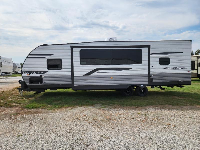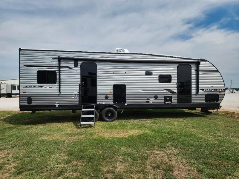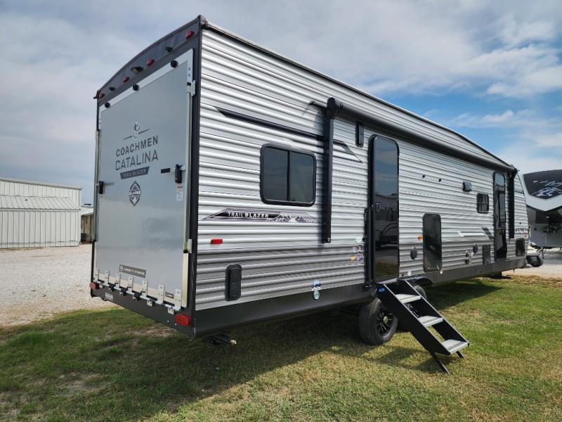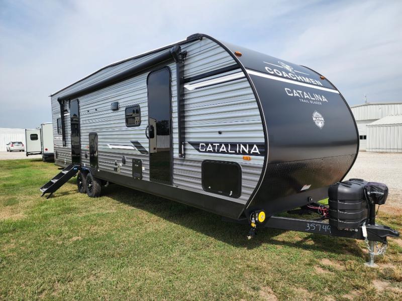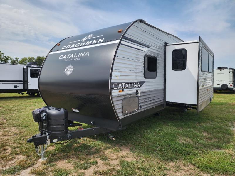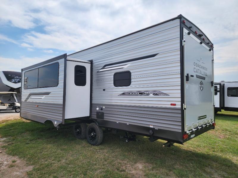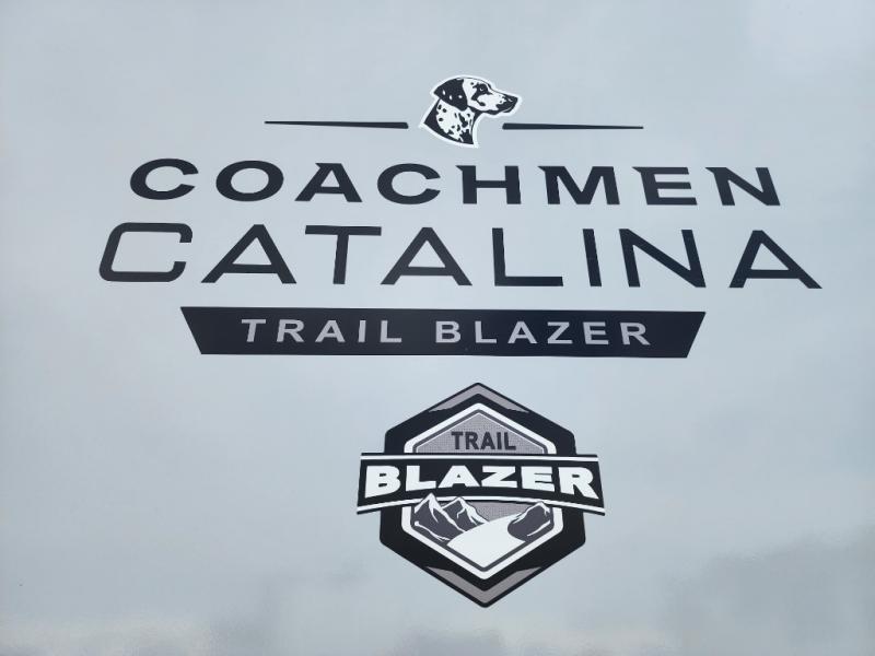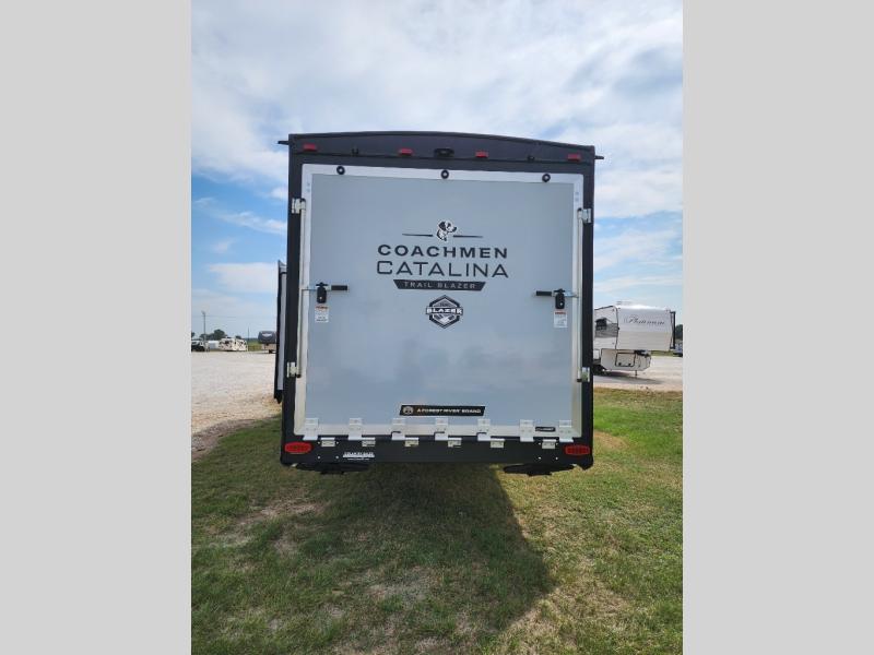 The best looking, most affordable toy hauler is found in the Catalina Trailer Blazer by Coachmen. Each one is constructed with a seamless alpha roof membrane, an enclosed and fully sealed underbelly, and a cambered structural steel I-beam frame for added support. There is a rear loading cargo door with a 3,000 lb. capacity, a black out screen wall with a zip walk-thru and windows, plus 500 lb. tie-downs to secure your toys. You'll love the interior with its Congoleum woodplank linoleum flooring and LED interior lighting. Head outside to find an electric awning with multicolored LED lights and a remote, a 15' Toy Loc cable, a "Leash Link" quick hookup D-ring for pets, and upgraded aluminum wheels. The Catalina Trail Blazer also comes with a JBL Aura Cube media center, plus premium JBL interior speakers for your pleasure!