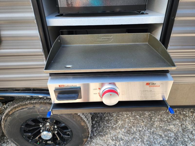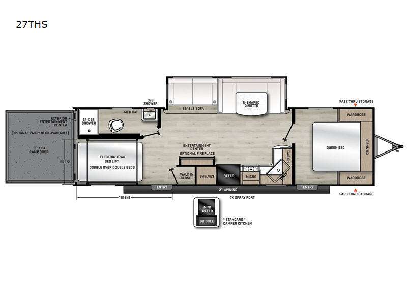 This toy hauler has lots of room for toys and guests! You will love the retreat of the front private bedroom with a queen bed, dual wardrobes and its own entry door. Additional guests can sleep in the double-size bunks with an electric trac bed lift in the cargo area, also with its own entry door. A rear corner bath makes efficient use of space and includes a 24" x 32" shower and a medicine cabinet. The main living area features an entertainment center that can be upgraded with an optional fireplace for maximum coziness. Relax on the sofa or the U-shaped dinette. You'll also appreciate the kitchen with its L-shaped counter, corner sink, microwave, GE stainless 10.7 cu. ft. 12V refrigerator, and three-burner range. Or step outside and use the camper kitchen with a griddle and mini refrigerator!