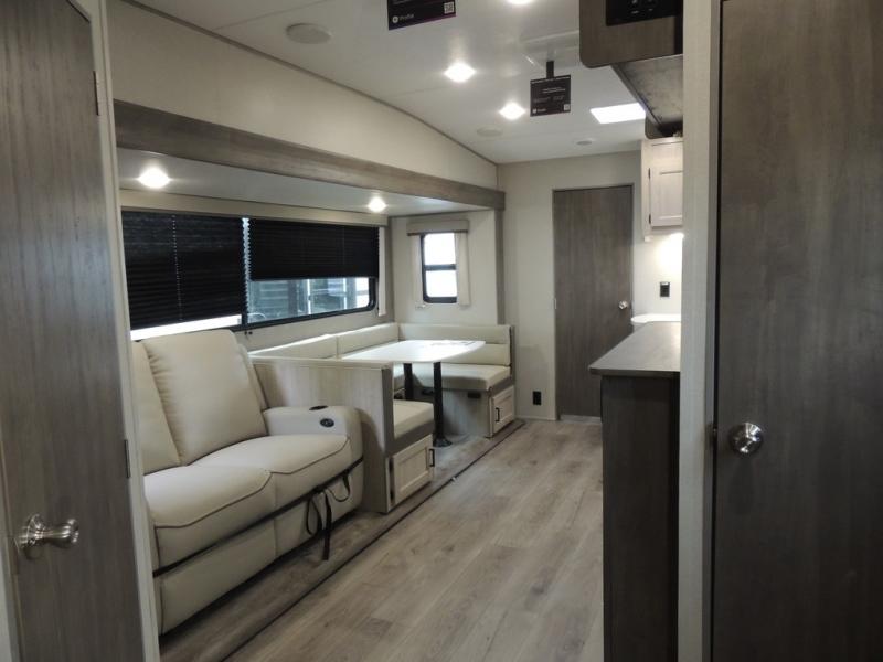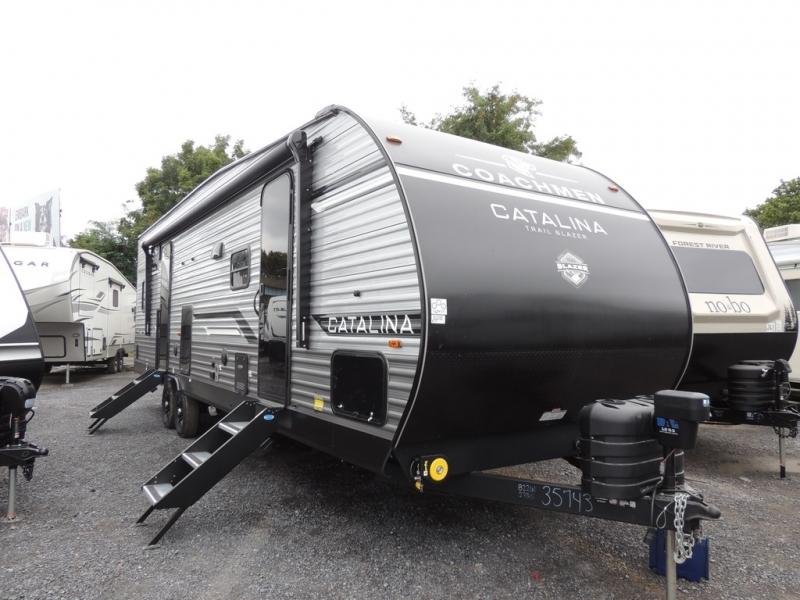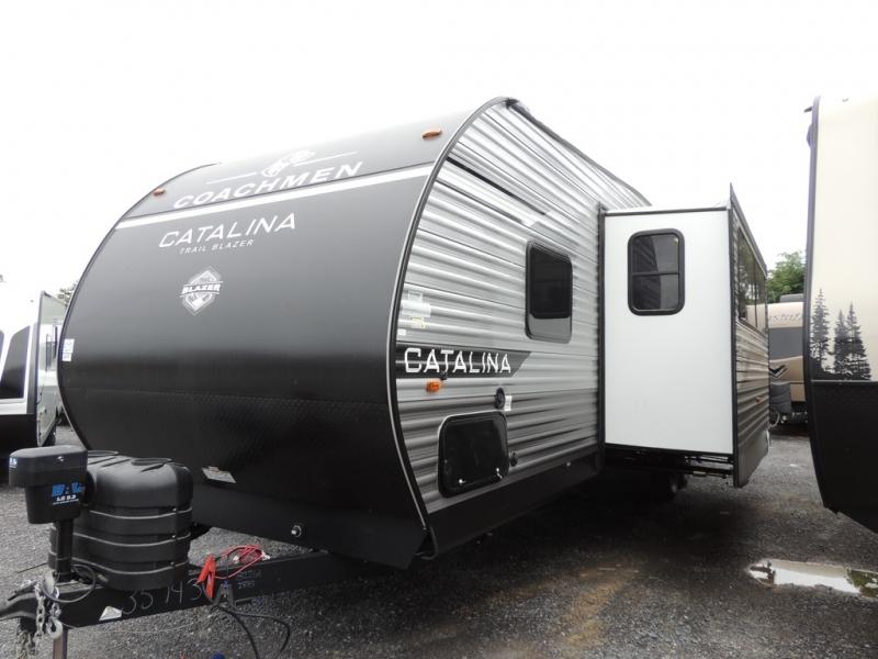 The best looking, most affordable toy hauler is found in the Catalina Trailer Blazer by Coachmen. Each one is constructed with a seamless alpha roof membrane, an enclosed and fully sealed underbelly, and a cambered structural steel I-beam frame for added support. There is a rear loading cargo door with a 3,000 lb. capacity, a black out screen wall with a zip walk-thru and windows, plus 500 lb. tie-downs to secure your toys. You'll love the interior with its Congoleum woodplank linoleum flooring and LED interior lighting. Head outside to find an electric awning with multicolored LED lights and a remote, a 15' Toy Loc cable, a "Leash Link" quick hookup D-ring for pets, and upgraded aluminum wheels. The Catalina Trail Blazer also comes with a JBL Aura Cube media center, plus premium JBL interior speakers for your pleasure!