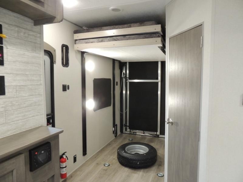 This toy hauler has lots of room for toys and guests! You will love the retreat of the front private bedroom with a queen bed, dual wardrobes and its own entry door. Additional guests can sleep in the double-size bunks with an electric trac bed lift in the cargo area, also with its own entry door. A rear corner bath makes efficient use of space and includes a 24" x 32" shower and a medicine cabinet. The main living area features an entertainment center that can be upgraded with an optional fireplace for maximum coziness. Relax on the sofa or the U-shaped dinette. You'll also appreciate the kitchen with its L-shaped counter, corner sink, microwave, GE stainless 10.7 cu. ft. 12V refrigerator, and three-burner range. Or step outside and use the camper kitchen with a griddle and mini refrigerator!