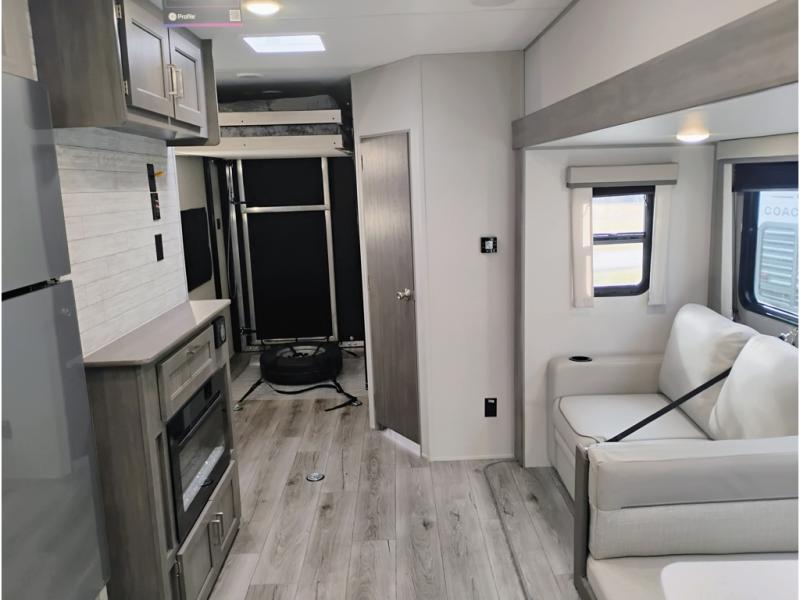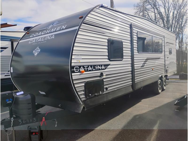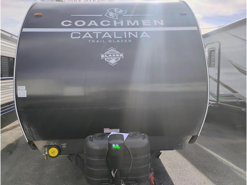 The best looking, most affordable toy hauler is found in the Catalina Trailer Blazer by Coachmen. Each one is constructed with a seamless alpha roof membrane, an enclosed and fully sealed underbelly, and a cambered structural steel I-beam frame for added support. There is a rear loading cargo door with a 3,000 lb. capacity, a black out screen wall with a zip walk-thru and windows, plus 500 lb. tie-downs to secure your toys. You'll love the interior with its Congoleum woodplank linoleum flooring and LED interior lighting. Head outside to find an electric awning with multicolored LED lights and a remote, a 15' Toy Loc cable, a "Leash Link" quick hookup D-ring for pets, and upgraded aluminum wheels. The Catalina Trail Blazer also comes with a JBL Aura Cube media center, plus premium JBL interior speakers for your pleasure!