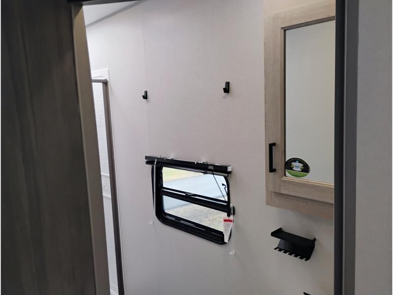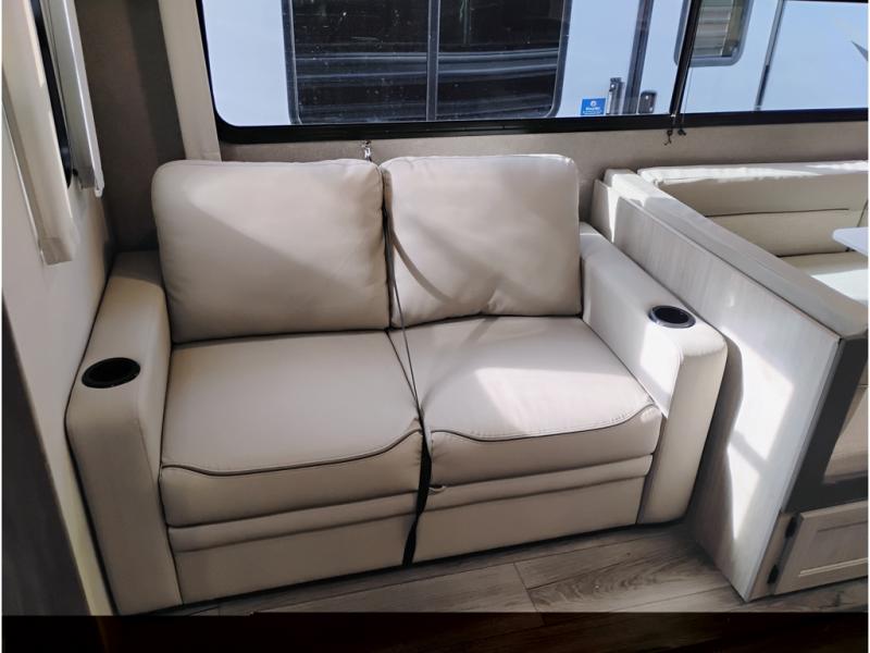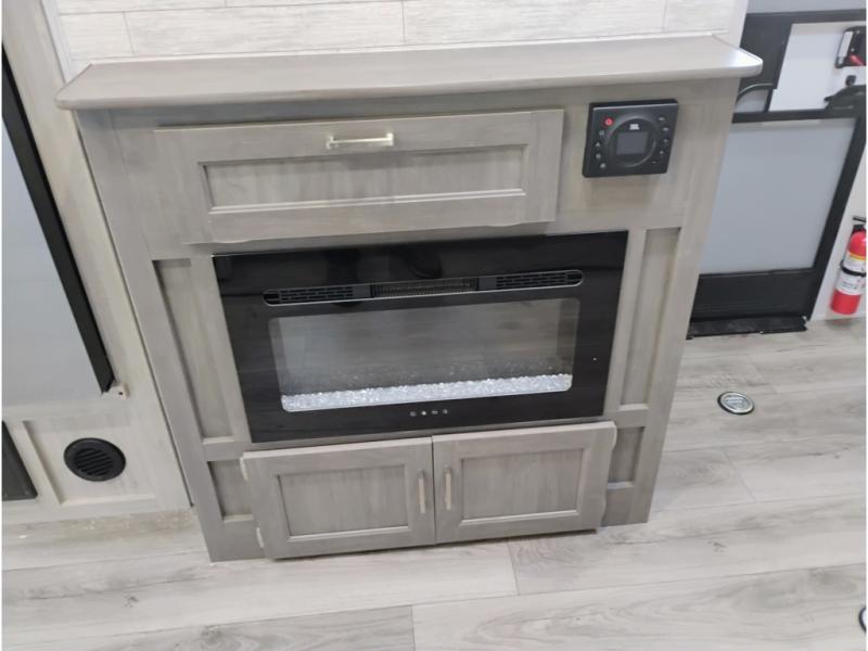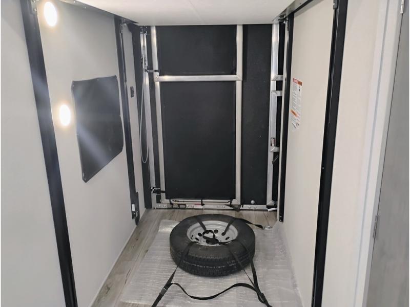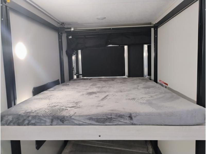 This toy hauler has lots of room for toys and guests! You will love the retreat of the front private bedroom with a queen bed, dual wardrobes and its own entry door. Additional guests can sleep in the double-size bunks with an electric trac bed lift in the cargo area, also with its own entry door. A rear corner bath makes efficient use of space and includes a 24" x 32" shower and a medicine cabinet. The main living area features an entertainment center that can be upgraded with an optional fireplace for maximum coziness. Relax on the sofa or the U-shaped dinette. You'll also appreciate the kitchen with its L-shaped counter, corner sink, microwave, GE stainless 10.7 cu. ft. 12V refrigerator, and three-burner range. Or step outside and use the camper kitchen with a griddle and mini refrigerator!