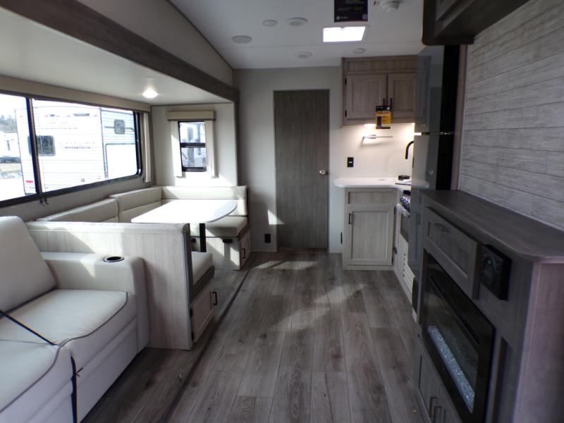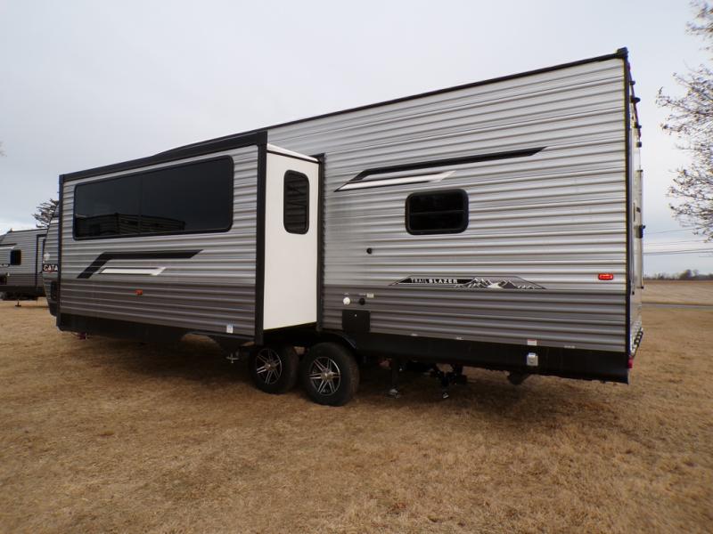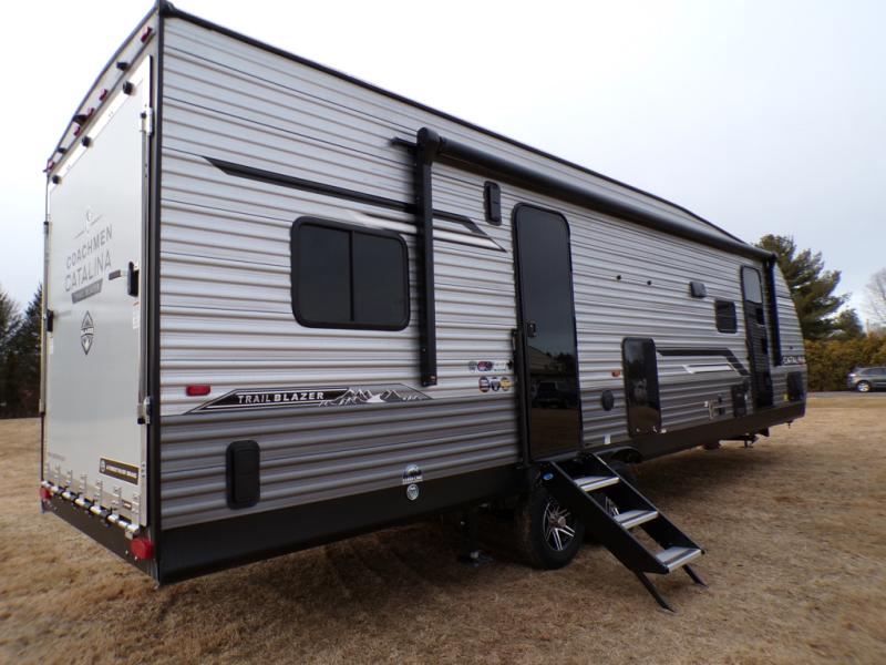 The best looking, most affordable toy hauler is found in the Catalina Trailer Blazer by Coachmen. Each one is constructed with a seamless alpha roof membrane, an enclosed and fully sealed underbelly, and a cambered structural steel I-beam frame for added support. There is a rear loading cargo door with a 3,000 lb. capacity, a black out screen wall with a zip walk-thru and windows, plus 500 lb. tie-downs to secure your toys. You'll love the interior with its Congoleum woodplank linoleum flooring and LED interior lighting. Head outside to find an electric awning with multicolored LED lights and a remote, a 15' Toy Loc cable, a "Leash Link" quick hookup D-ring for pets, and upgraded aluminum wheels. The Catalina Trail Blazer also comes with a JBL Aura Cube media center, plus premium JBL interior speakers for your pleasure!