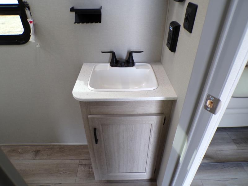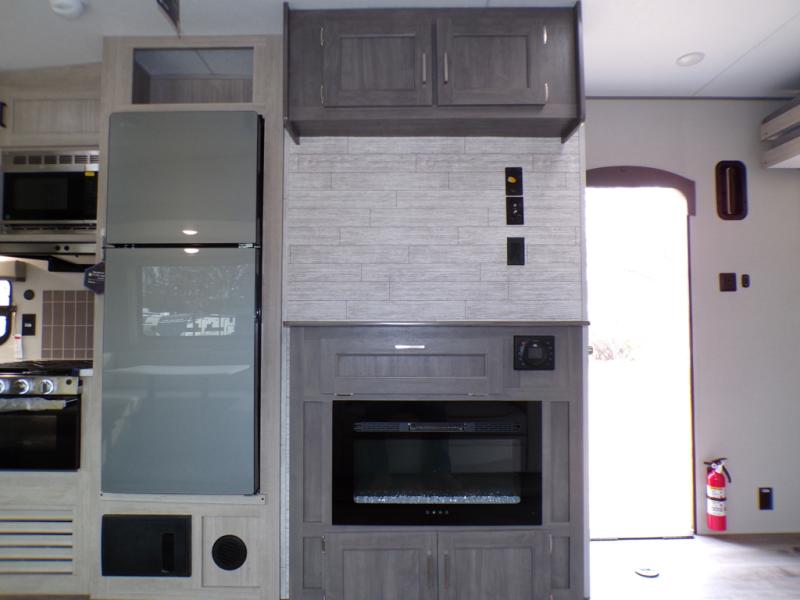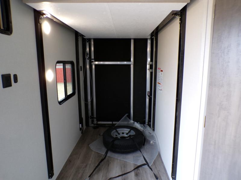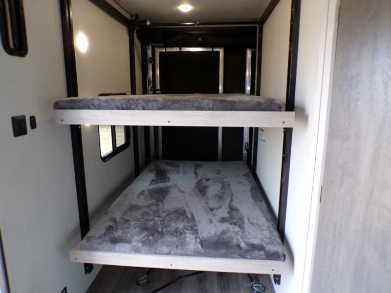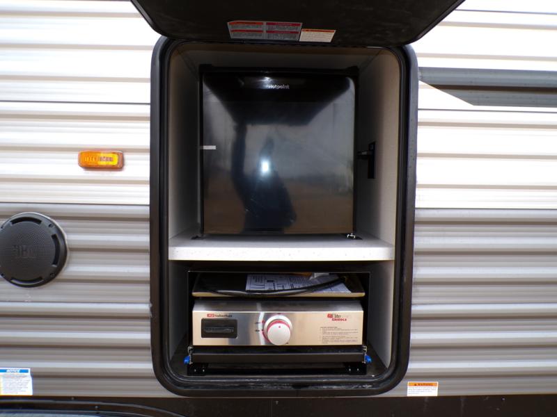 This toy hauler has lots of room for toys and guests! You will love the retreat of the front private bedroom with a queen bed, dual wardrobes and its own entry door. Additional guests can sleep in the double-size bunks with an electric trac bed lift in the cargo area, also with its own entry door. A rear corner bath makes efficient use of space and includes a 24" x 32" shower and a medicine cabinet. The main living area features an entertainment center that can be upgraded with an optional fireplace for maximum coziness. Relax on the sofa or the U-shaped dinette. You'll also appreciate the kitchen with its L-shaped counter, corner sink, microwave, GE stainless 10.7 cu. ft. 12V refrigerator, and three-burner range. Or step outside and use the camper kitchen with a griddle and mini refrigerator!