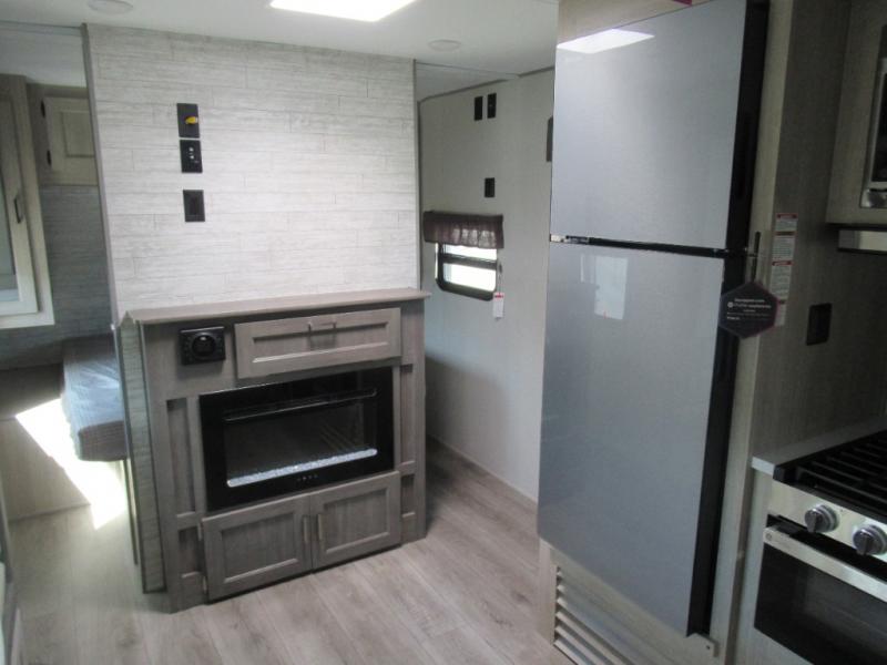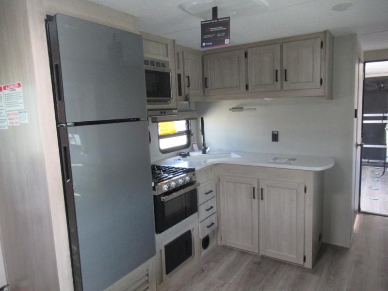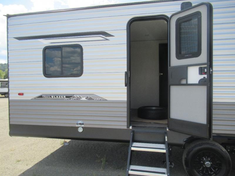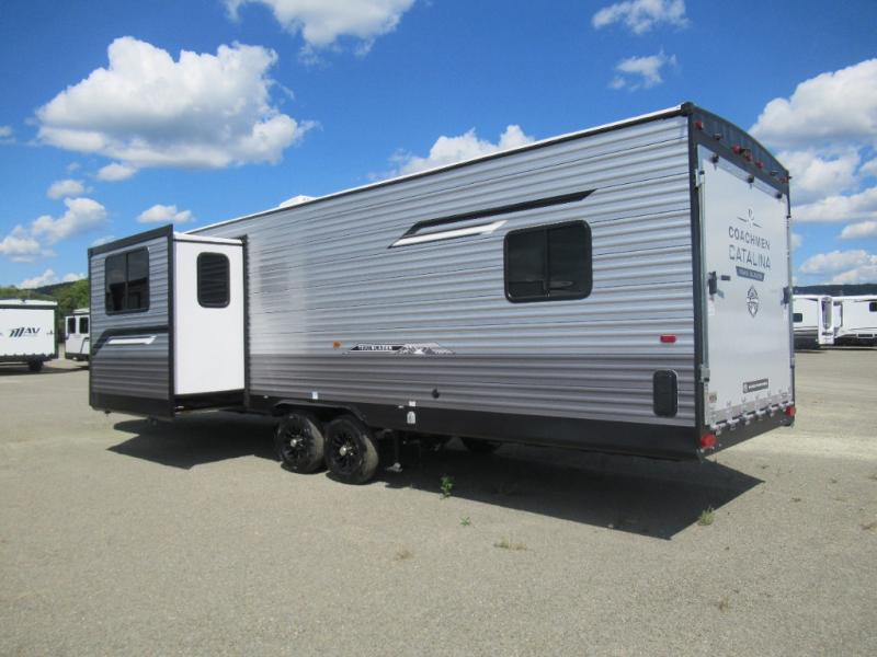 The best looking, most affordable toy hauler is found in the Catalina Trailer Blazer by Coachmen. Each one is constructed with a seamless alpha roof membrane, an enclosed and fully sealed underbelly, and a cambered structural steel I-beam frame for added support. There is a rear loading cargo door with a 3,000 lb. capacity, a black out screen wall with a zip walk-thru and windows, plus 500 lb. tie-downs to secure your toys. You'll love the interior with its Congoleum woodplank linoleum flooring and LED interior lighting. Head outside to find an electric awning with multicolored LED lights and a remote, a 15' Toy Loc cable, a "Leash Link" quick hookup D-ring for pets, and upgraded aluminum wheels. The Catalina Trail Blazer also comes with a JBL Aura Cube media center, plus premium JBL interior speakers for your pleasure!