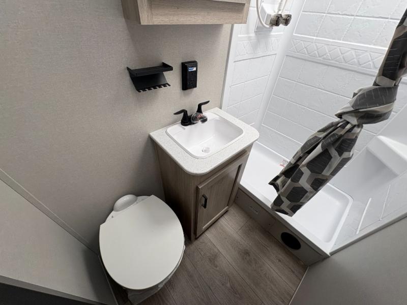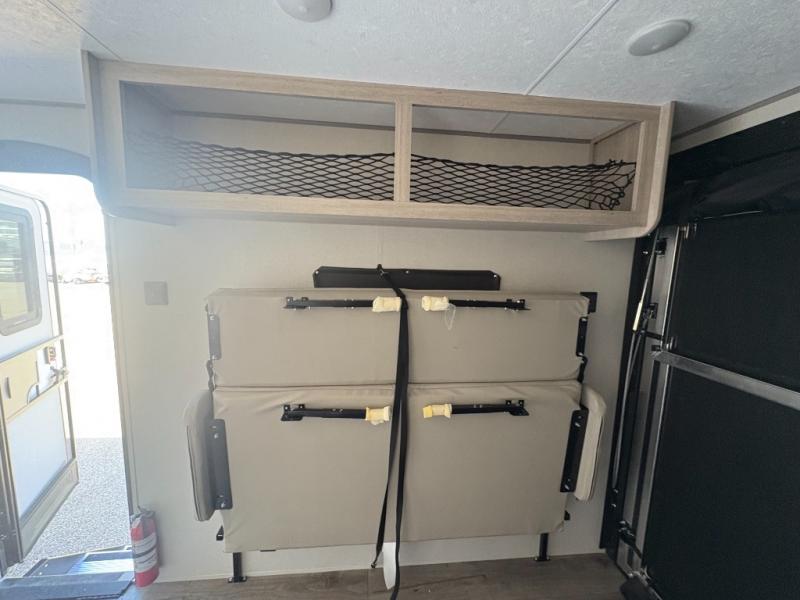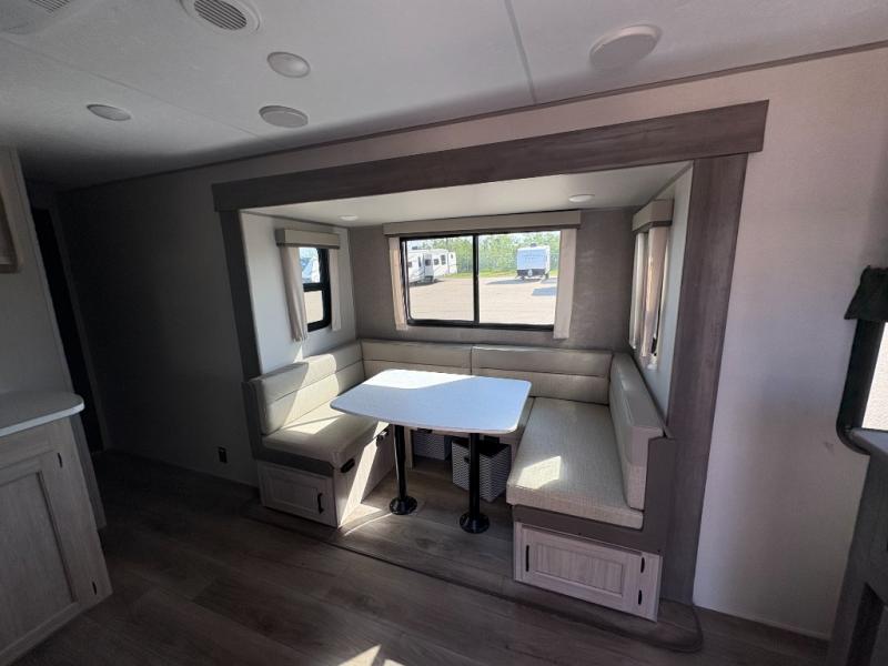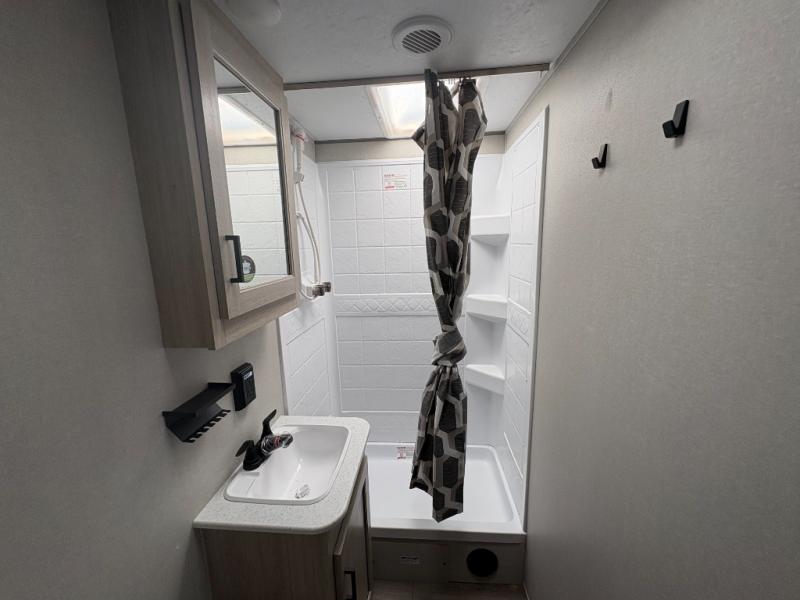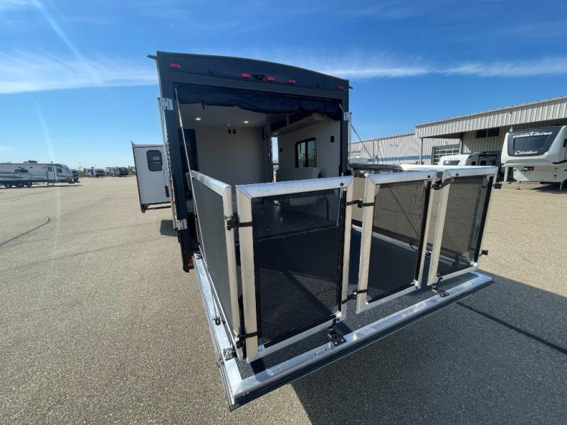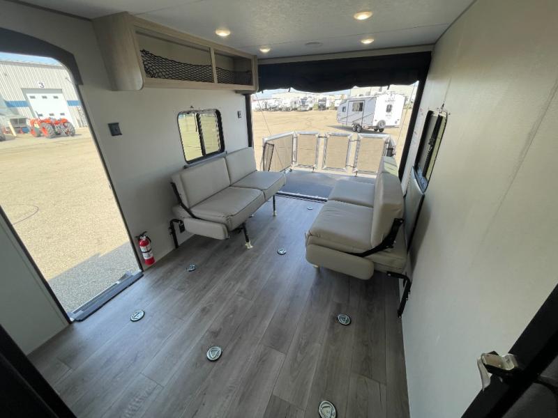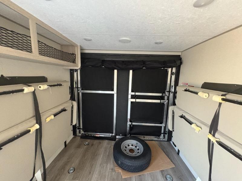 You're going to love camping in this dual entry toy hauler! The 11' garage can be shut off from the rest of the unit if your guests want a little privacy, and you can choose the optional party deck to the ramp door for more living space. The full bath includes a tub/shower, a medicine cabinet, plus a shower skylight to let natural light in. Head to the main living area to dine around the U-shaped dinette slide, or call it a night in the front bedroom with a queen bed. And you'll find plenty of storage space for your belongings, including overhead cabinets, dual bedroom wardrobes, plus exterior storage!