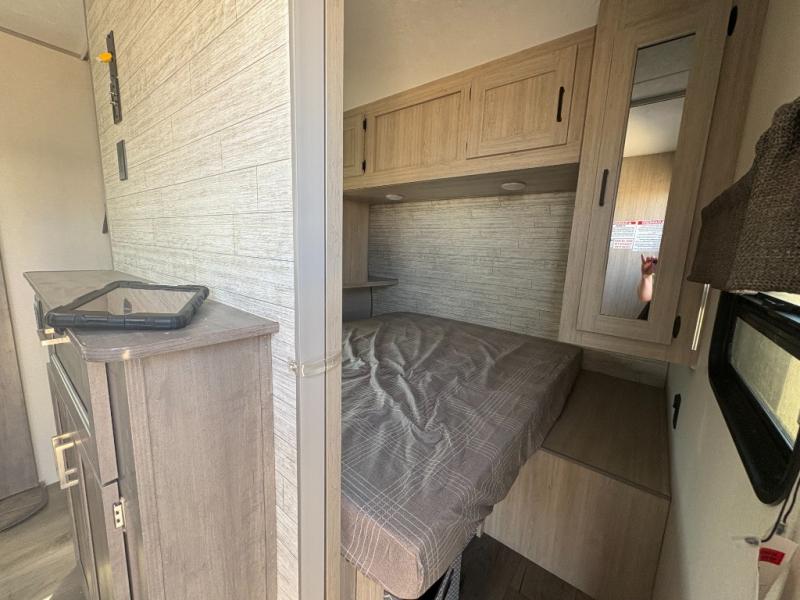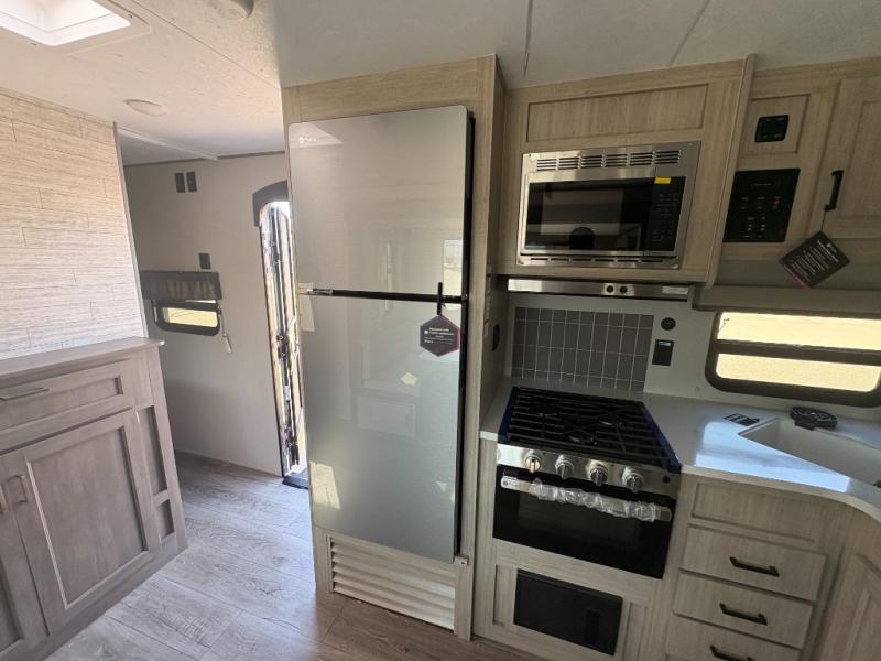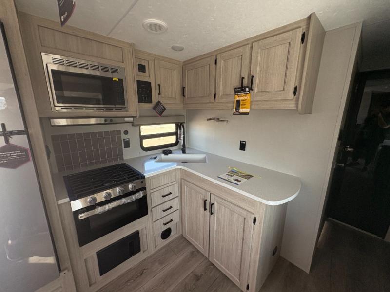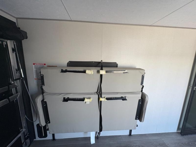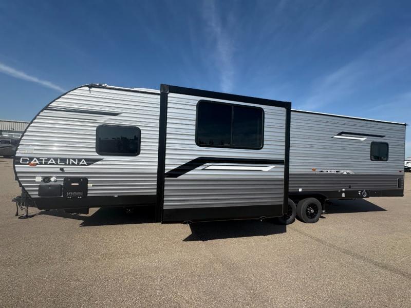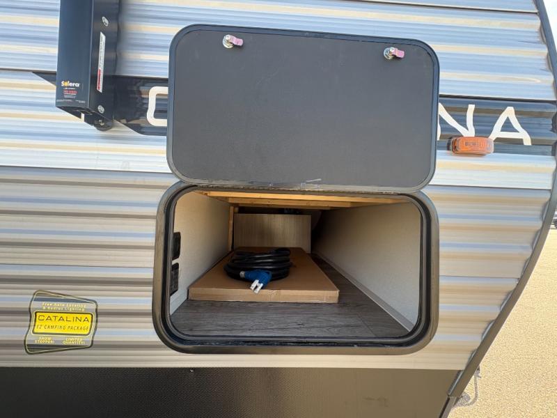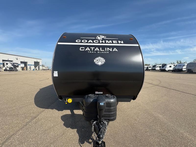 The best looking, most affordable toy hauler is found in the Catalina Trailer Blazer by Coachmen. Each one is constructed with a seamless alpha roof membrane, an enclosed and fully sealed underbelly, and a cambered structural steel I-beam frame for added support. There is a rear loading cargo door with a 3,000 lb. capacity, a black out screen wall with a zip walk-thru and windows, plus 500 lb. tie-downs to secure your toys. You'll love the interior with its Congoleum woodplank linoleum flooring and LED interior lighting. Head outside to find an electric awning with multicolored LED lights and a remote, a 15' Toy Loc cable, a "Leash Link" quick hookup D-ring for pets, and upgraded aluminum wheels. The Catalina Trail Blazer also comes with RV-LINK 4G LTE connectivity with a WiFi booster and extender, a JBL Aura Cube media center, plus premium JBL interior speakers for your pleasure!