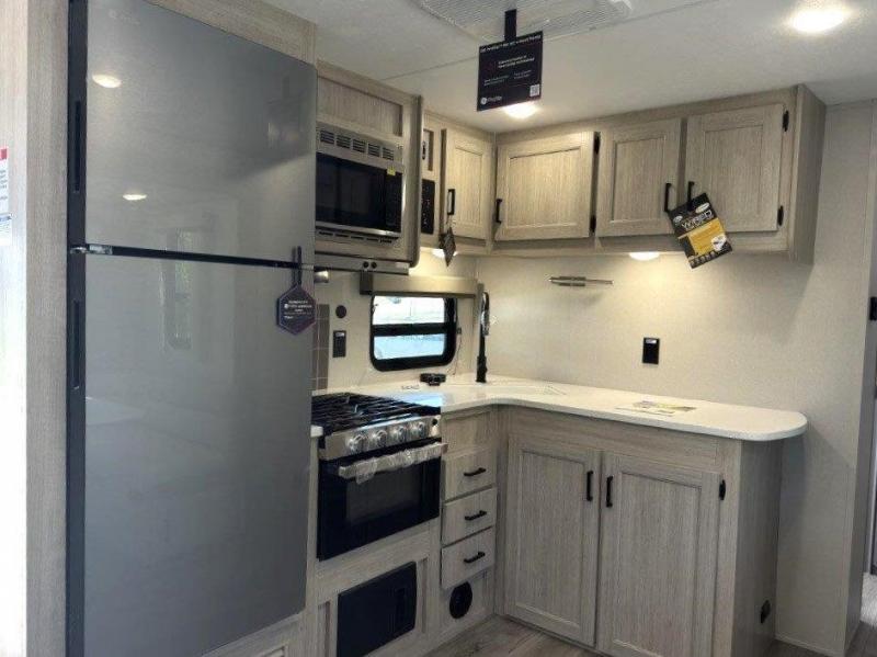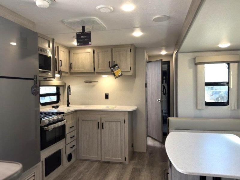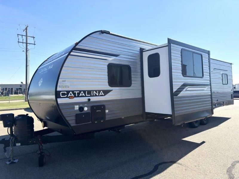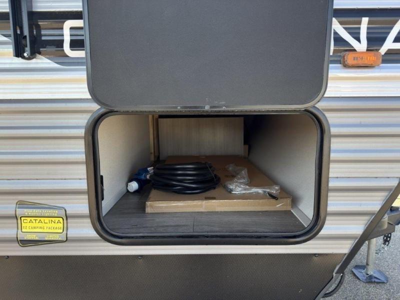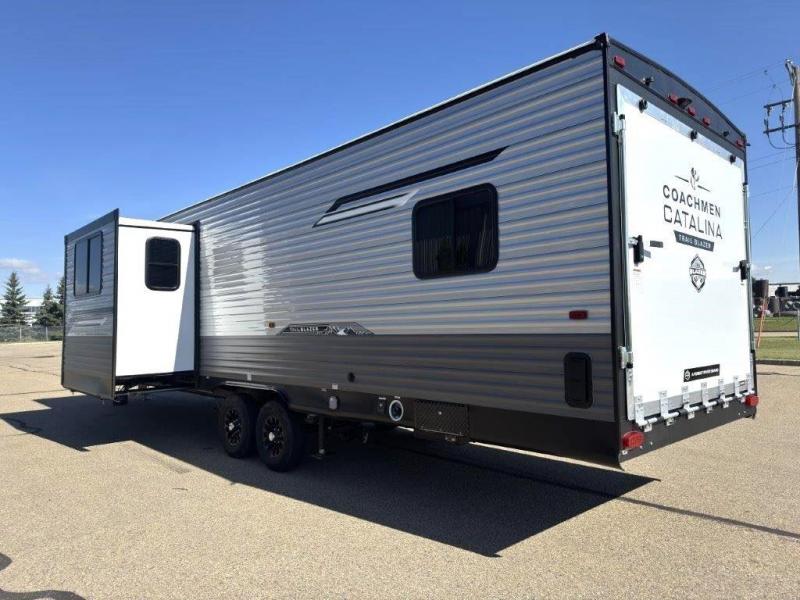 The best looking, most affordable toy hauler is found in the Catalina Trailer Blazer by Coachmen. Each one is constructed with a seamless alpha roof membrane, an enclosed and fully sealed underbelly, and a cambered structural steel I-beam frame for added support. There is a rear loading cargo door with a 3,000 lb. capacity, a black out screen wall with a zip walk-thru and windows, plus 500 lb. tie-downs to secure your toys. You'll love the interior with its Congoleum woodplank linoleum flooring and LED interior lighting. Head outside to find an electric awning with multicolored LED lights and a remote, a 15' Toy Loc cable, a "Leash Link" quick hookup D-ring for pets, and upgraded aluminum wheels. The Catalina Trail Blazer also comes with RV-LINK 4G LTE connectivity with a WiFi booster and extender, a JBL Aura Cube media center, plus premium JBL interior speakers for your pleasure!