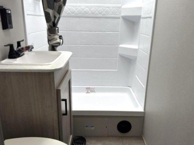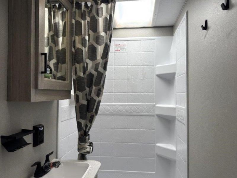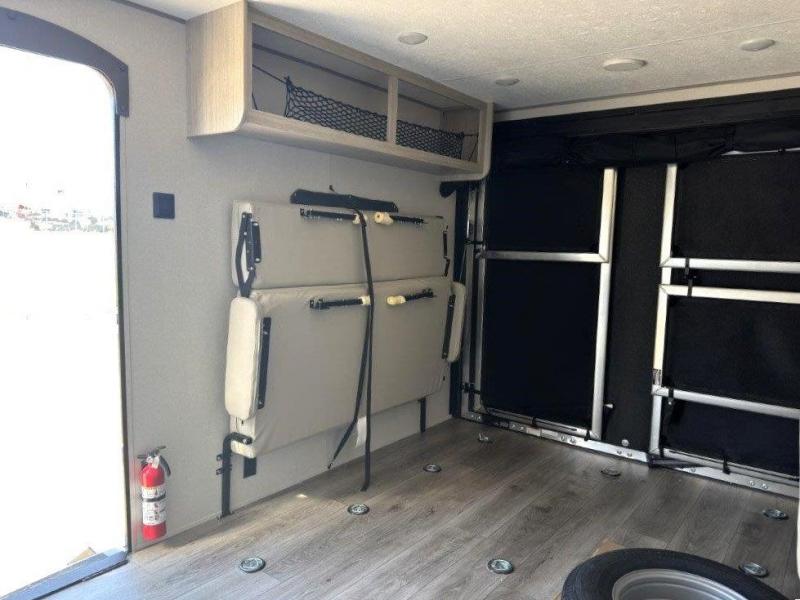 You're going to love camping in this dual entry toy hauler! The 11' garage can be shut off from the rest of the unit if your guests want a little privacy, and you can choose the optional party deck to the ramp door for more living space. The full bath includes a tub/shower, a medicine cabinet, plus a shower skylight to let natural light in. Head to the main living area to dine around the U-shaped dinette slide, or call it a night in the front bedroom with a queen bed. And you'll find plenty of storage space for your belongings, including overhead cabinets, dual bedroom wardrobes, plus exterior storage!