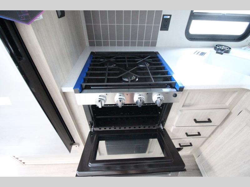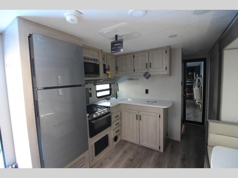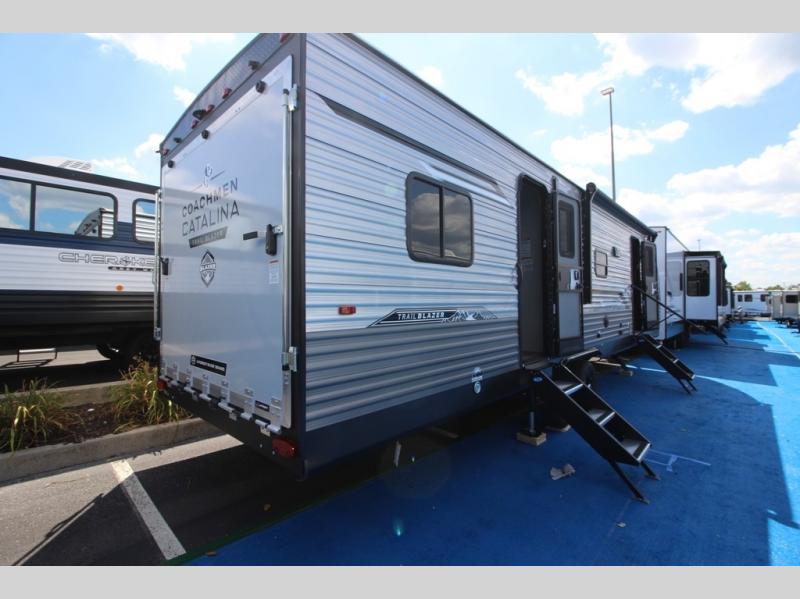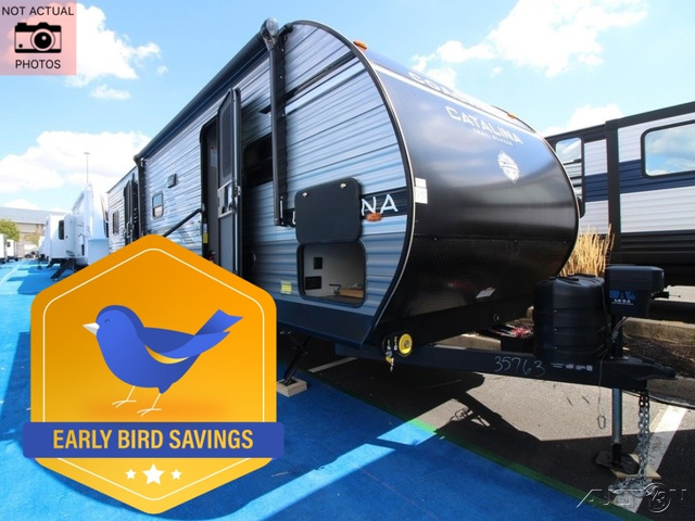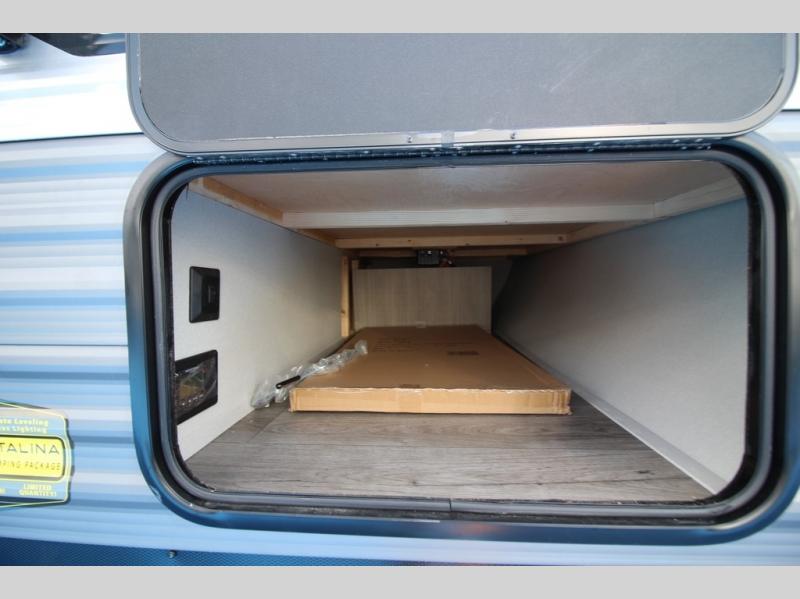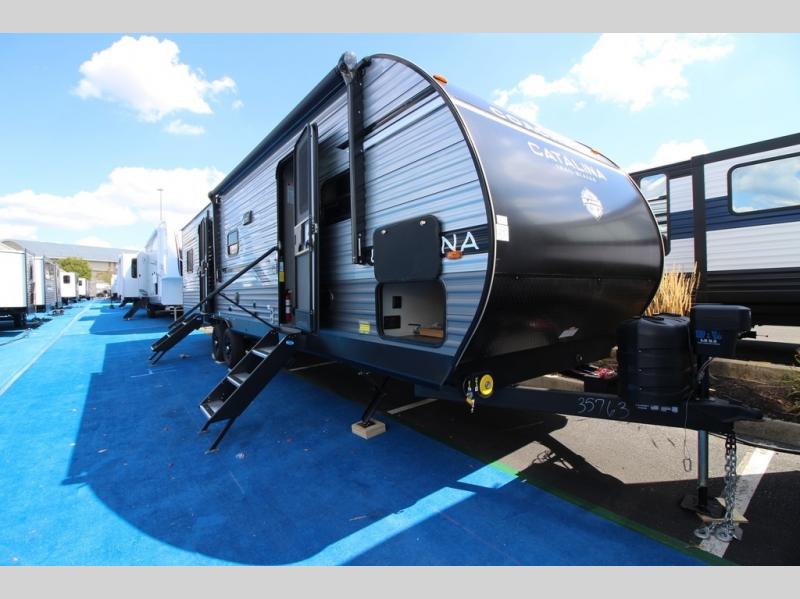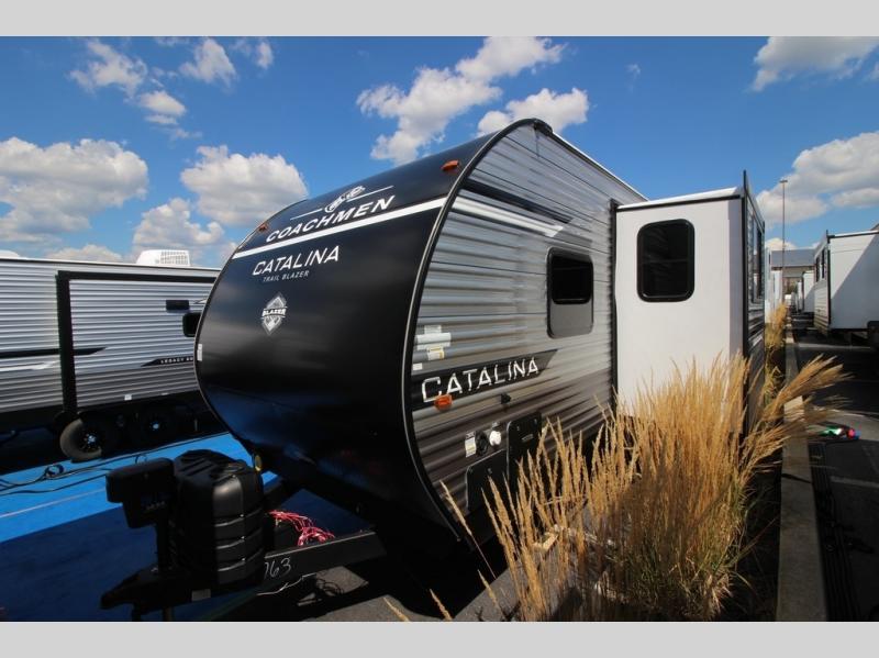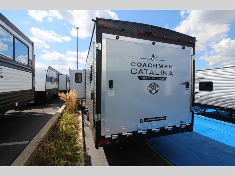 The best looking, most affordable toy hauler is found in the Catalina Trailer Blazer by Coachmen. Each one is constructed with a seamless alpha roof membrane, an enclosed and fully sealed underbelly, and a cambered structural steel I-beam frame for added support. There is a rear loading cargo door with a 3,000 lb. capacity, a black out screen wall with a zip walk-thru and windows, plus 500 lb. tie-downs to secure your toys. You'll love the interior with its Congoleum woodplank linoleum flooring and LED interior lighting. Head outside to find an electric awning with multicolored LED lights and a remote, a 15' Toy Loc cable, a "Leash Link" quick hookup D-ring for pets, and upgraded aluminum wheels. The Catalina Trail Blazer also comes with a JBL Aura Cube media center, plus premium JBL interior speakers for your pleasure!