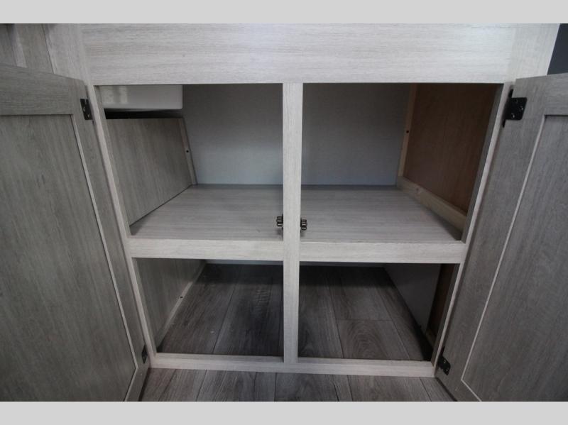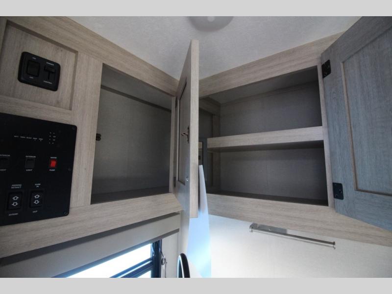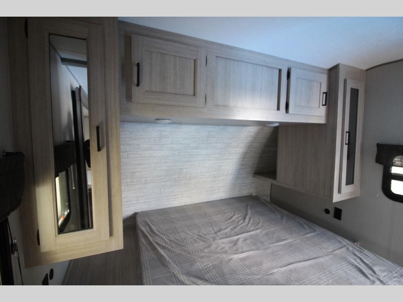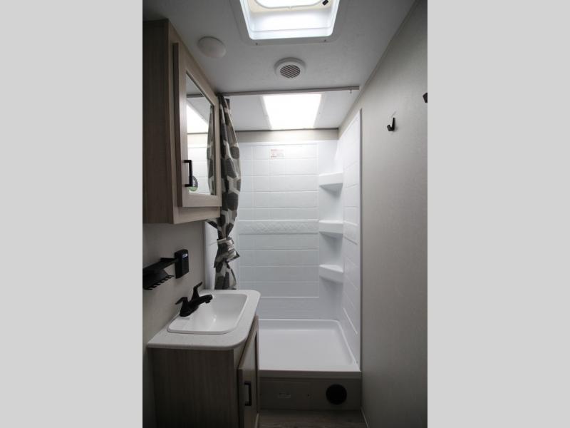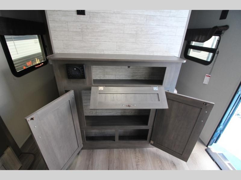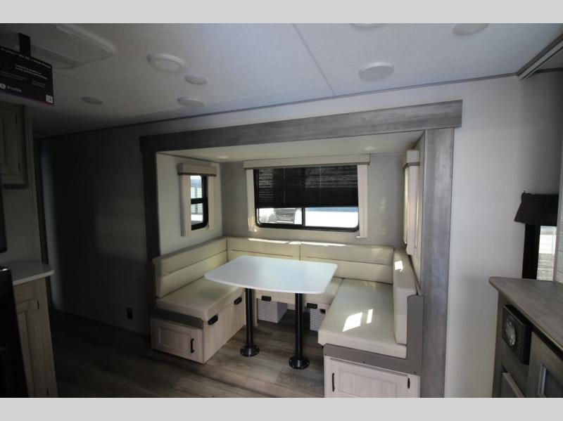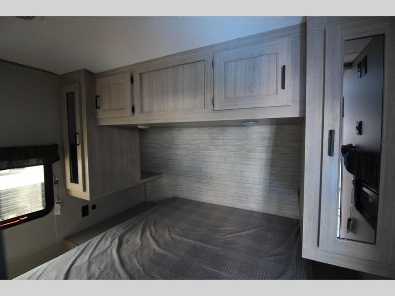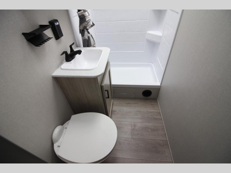 You're going to love camping in this dual entry toy hauler! The 11' garage can be shut off from the rest of the unit if your guests want a little privacy, and you can choose the optional party deck to the ramp door for more living space. The full bath includes a tub/shower, a medicine cabinet, plus a shower skylight to let natural light in. Head to the main living area to dine around the U-shaped dinette slide, or call it a night in the front bedroom with a queen bed. And you'll find plenty of storage space for your belongings, including overhead cabinets, dual bedroom wardrobes, plus exterior storage!