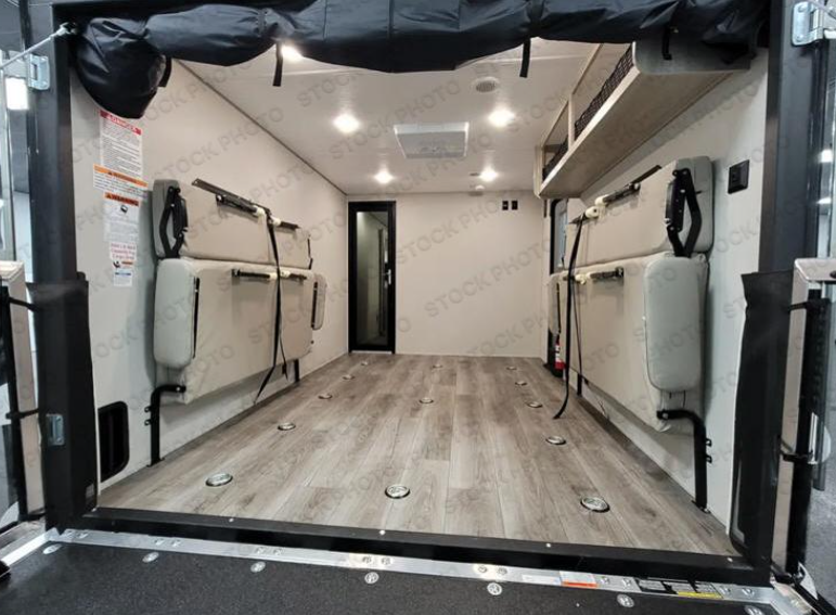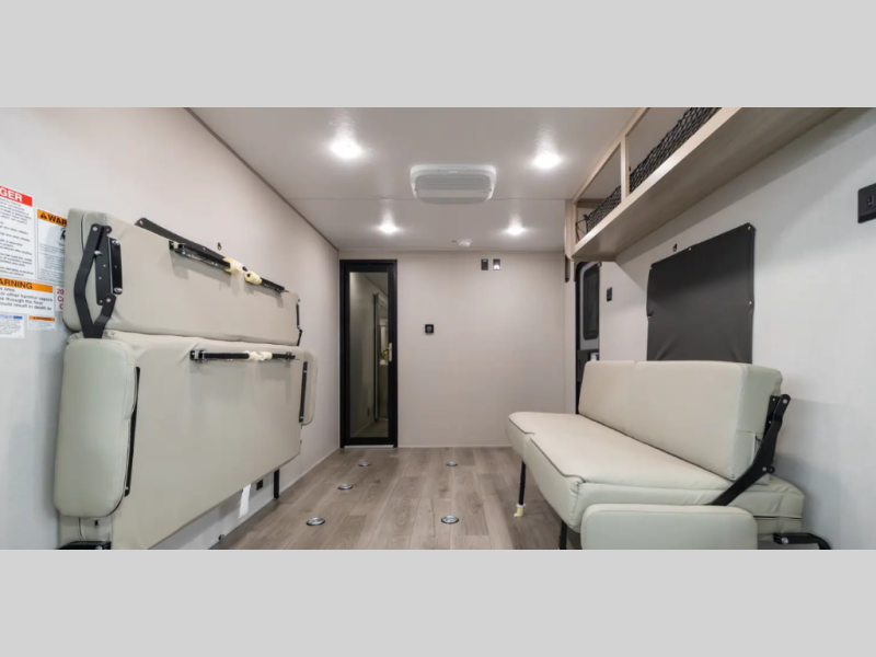 Includes an electric awning with multicolored LED lighting and remote, Toy Loc cable, Leash Link pet hookup, upgraded aluminum wheels, and generous exterior storage.