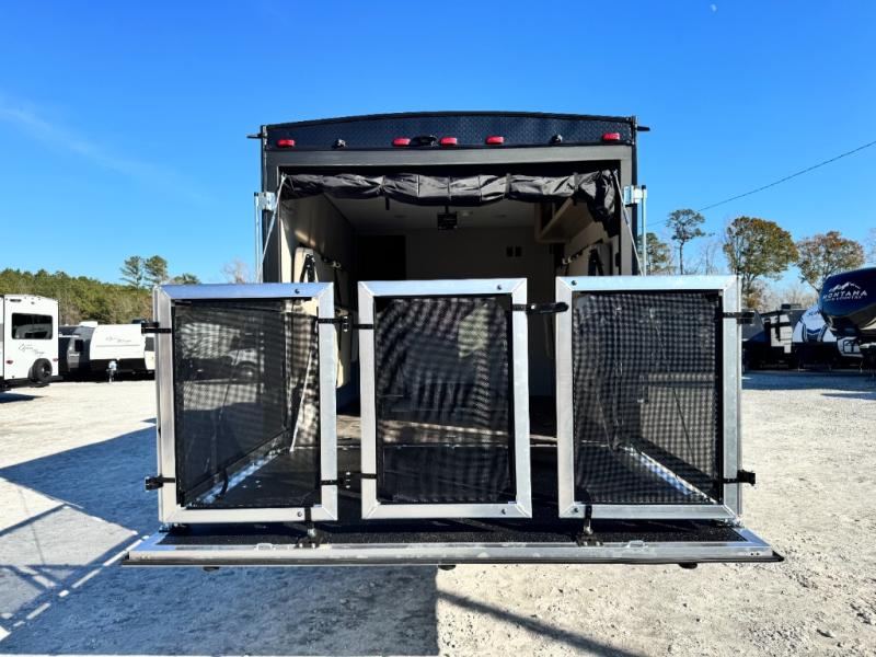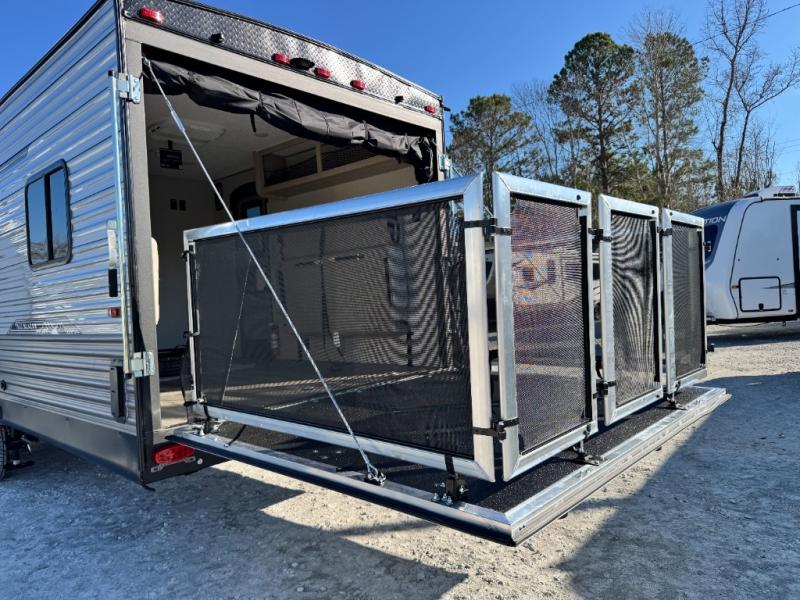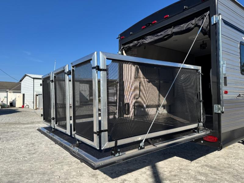 What is the garage size of the Catalina Trail Blazer 29THS? It boasts a massive 11-foot separate garage with 3,000 lb. capacity ramp door and 500 lb. tie-downs to secure your ATVs, motorcycles, or golf carts.