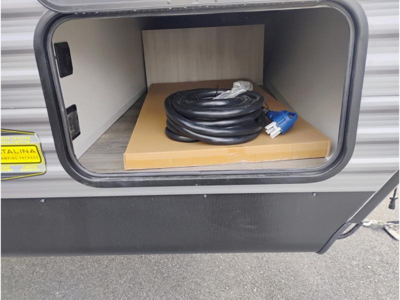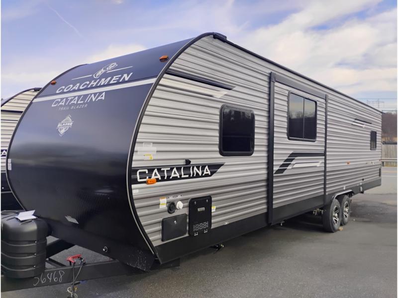 The best looking, most affordable toy hauler is found in the Catalina Trailer Blazer by Coachmen. Each one is constructed with a seamless alpha roof membrane, an enclosed and fully sealed underbelly, and a cambered structural steel I-beam frame for added support. There is a rear loading cargo door with a 3,000 lb. capacity, a black out screen wall with a zip walk-thru and windows, plus 500 lb. tie-downs to secure your toys. You'll love the interior with its Congoleum woodplank linoleum flooring and LED interior lighting. Head outside to find an electric awning with multicolored LED lights and a remote, a 15' Toy Loc cable, a "Leash Link" quick hookup D-ring for pets, and upgraded aluminum wheels. The Catalina Trail Blazer also comes with a JBL Aura Cube media center, plus premium JBL interior speakers for your pleasure!