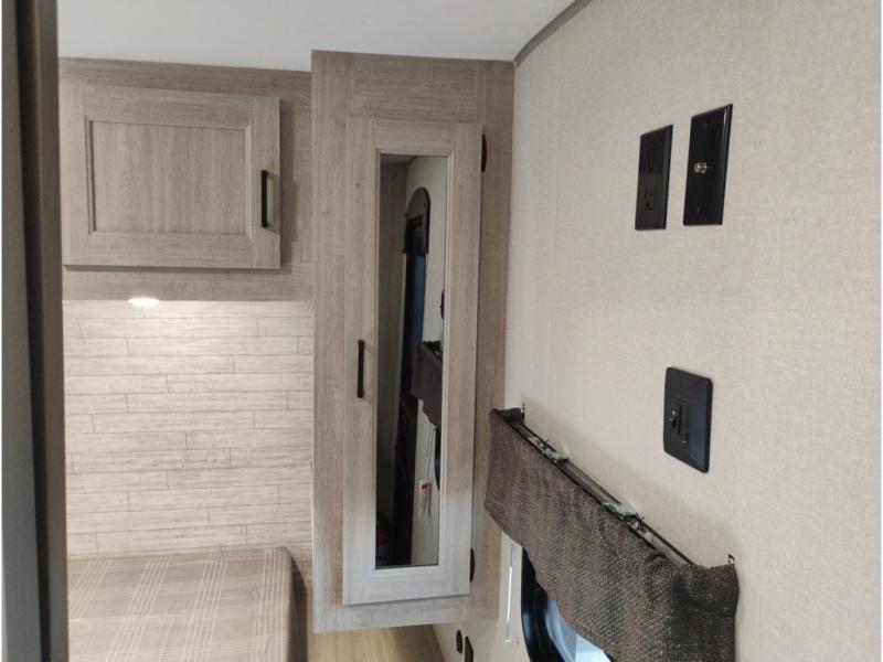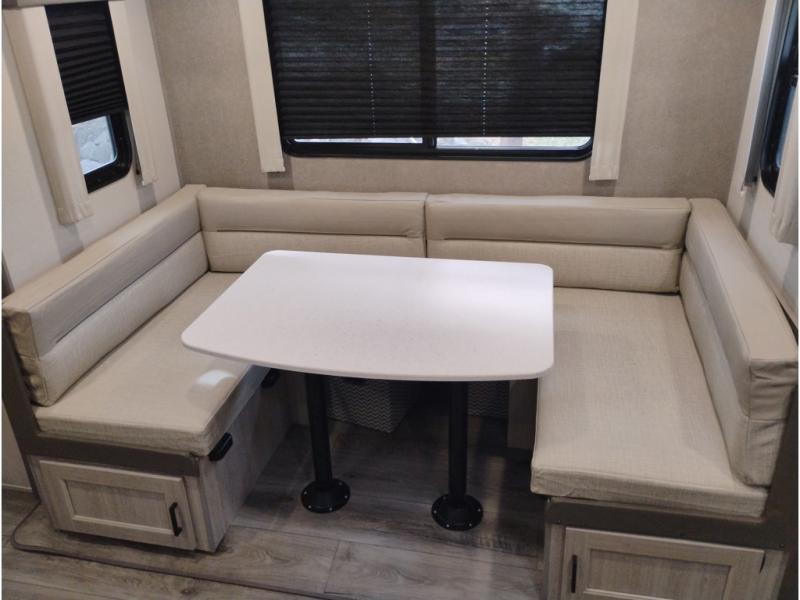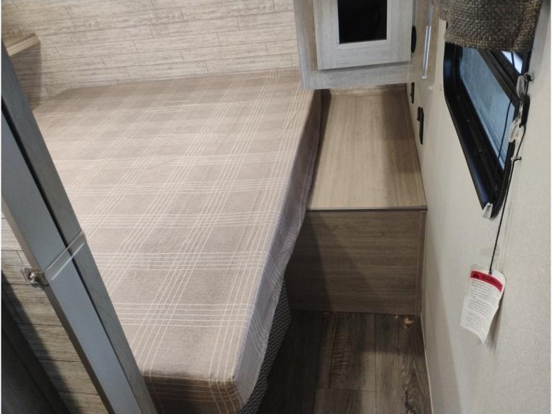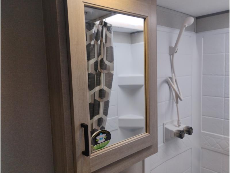 You're going to love camping in this dual entry toy hauler! The 11' garage can be shut off from the rest of the unit if your guests want a little privacy, and you can choose the optional party deck to the ramp door for more living space. The full bath includes a tub/shower, a medicine cabinet, plus a shower skylight to let natural light in. Head to the main living area to dine around the U-shaped dinette slide, or call it a night in the front bedroom with a queen bed. And you'll find plenty of storage space for your belongings, including overhead cabinets, dual bedroom wardrobes, plus exterior storage!