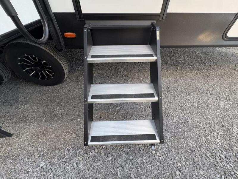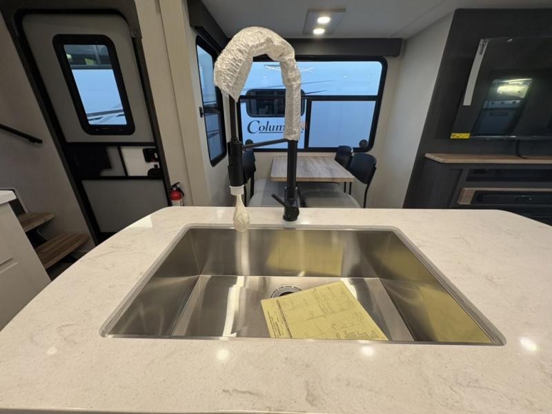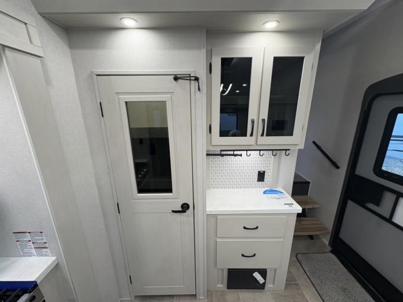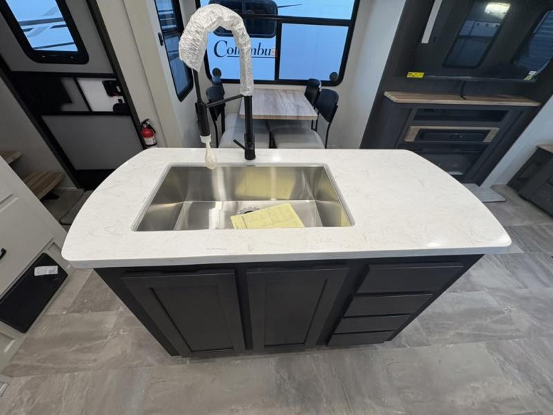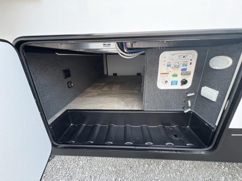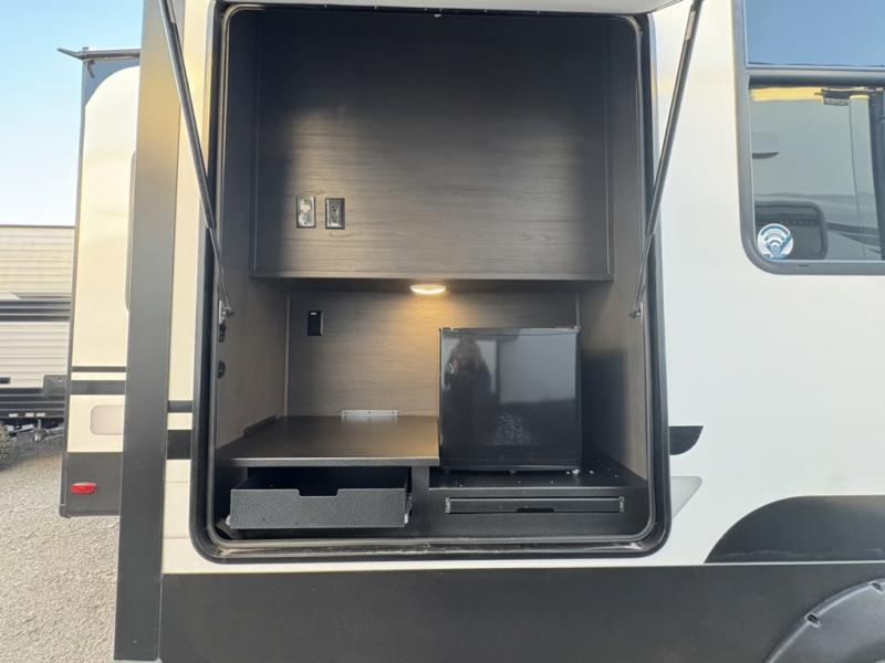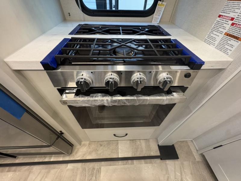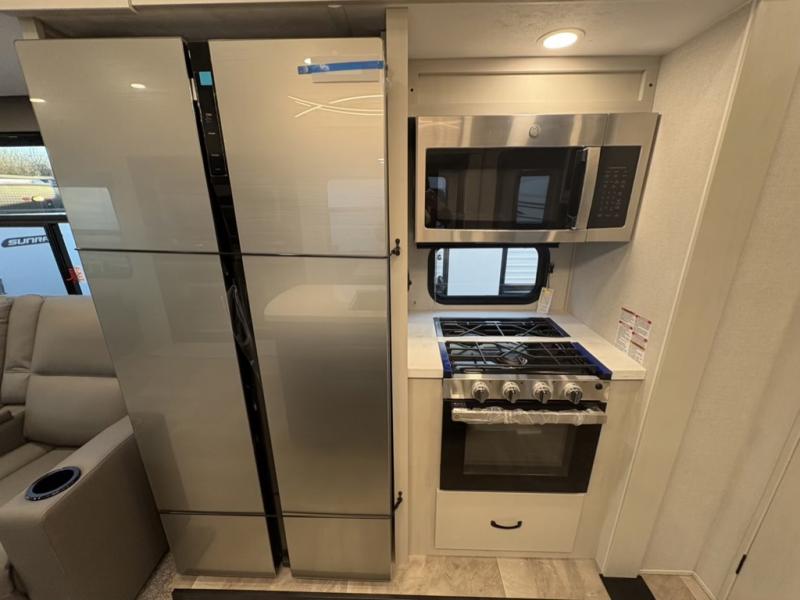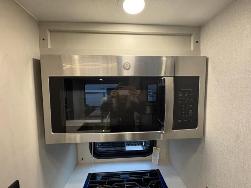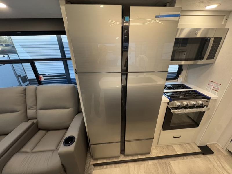 This lightest fifth wheel in the Chaparral line-up will provide hassle-free towing and camping. You will find dual opposing slides in the main living area for tons of space to stretch out, plus a kitchen island that will make this area feel more like home. There is theatre seating across from the entertainment center, and you can enjoy the 50" 4K Smart LED TV for movies. The fully-equipped kitchen includes a GE Profile stainless steel 30" residential microwave, a GE Profile 21" oven with a residential cooktop, and a overhead storage to keep kitchen necessities close by. And don't overlook the front private bedroom with a queen bed, dresser, plus a large wardrobe with washer and dryer prep!