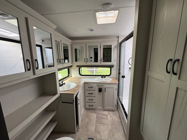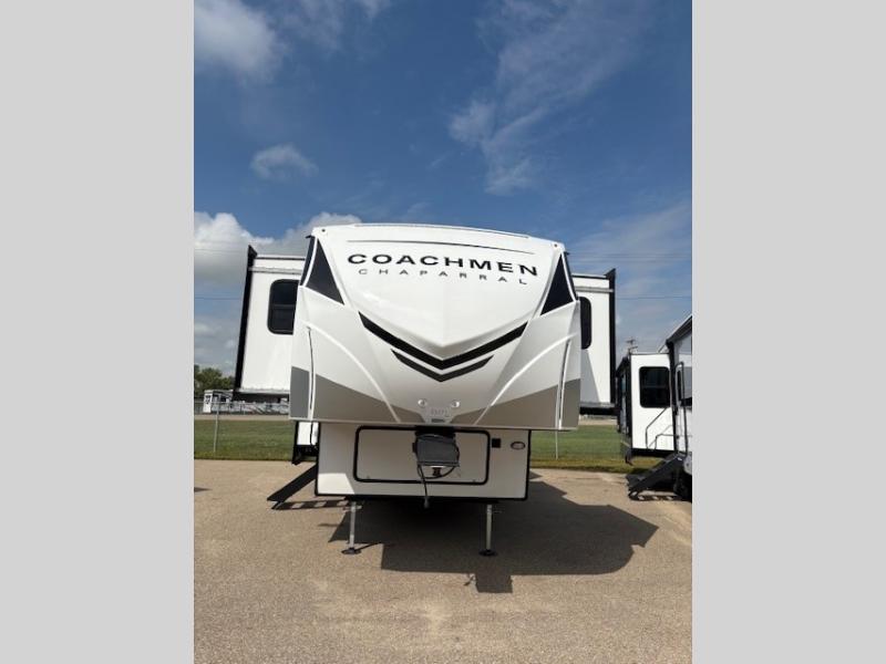 Each Chaparral mid-profile fifth wheel by Coachmen is designed with residential features, loads of storage space, and roomy bedroom suites to make you feel right at home. The durable construction means you can enjoy your RV for years to come. There's 6X double Azdel aluminum cage sidewall system, Weather Shield+ technology, and Tri-Tex powder coated frame technology that will allow you to camp year around. Each model includes a Winegard Air 360+ HDTV/radio dome antenna to help keep you connected as you camp, slow rise blackout roller night shades, a new 16 cu. ft. side-by-side stainless glass 12V refrigerator, and a modern electric fireplace to make your space cozy. There is also a large transom window in the kitchen, a modern high-rise faucet, LED motion sensor lights in the bathroom, plus a full-size shower with glass doors and a seat. Now that's what I call luxury! Choose a Chaparral fifth wheel today!