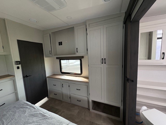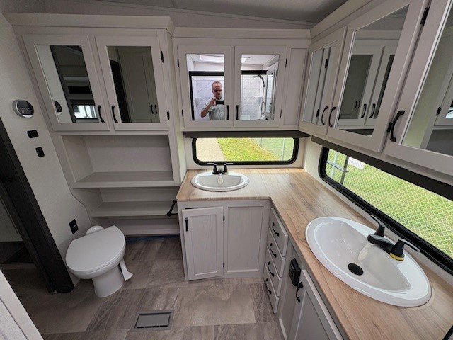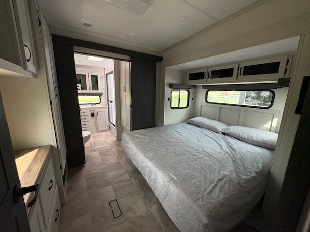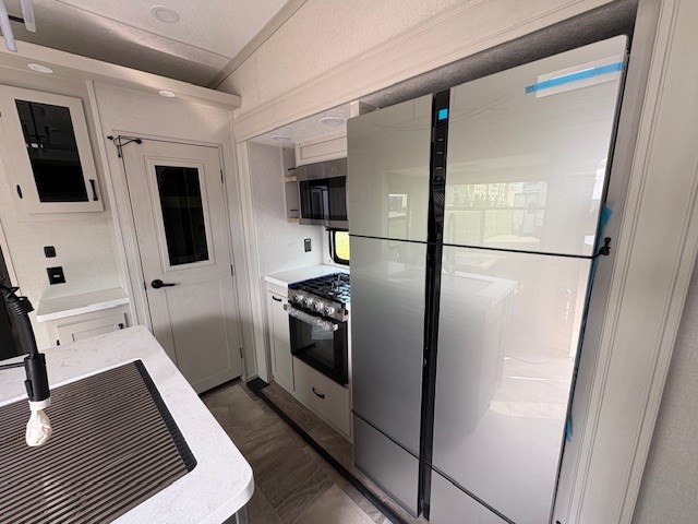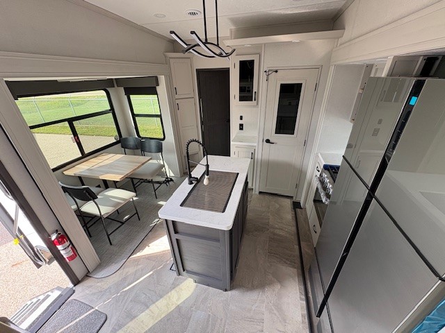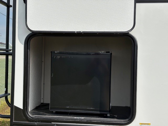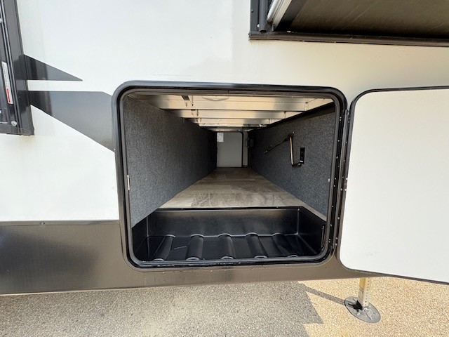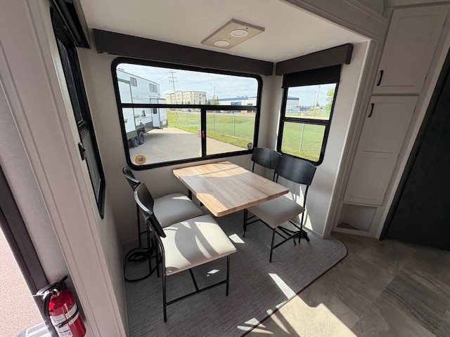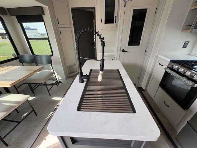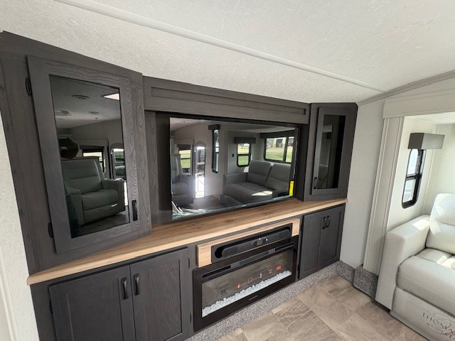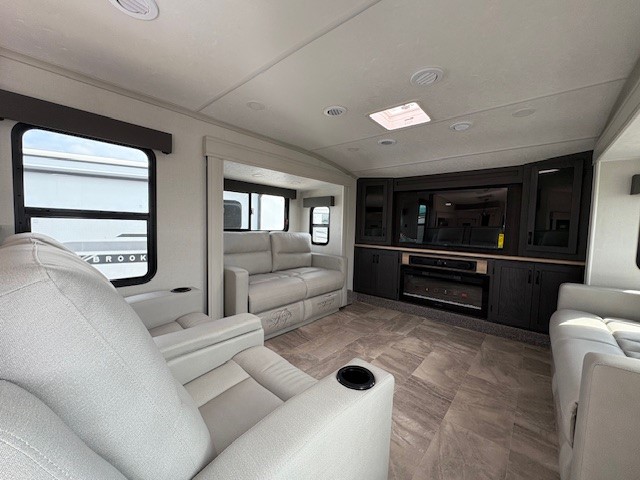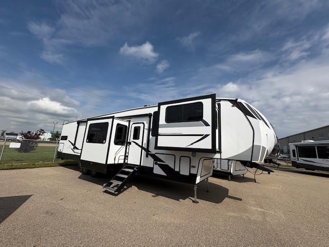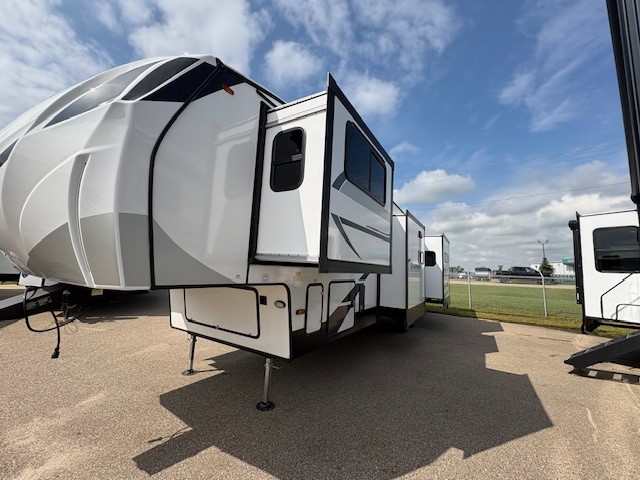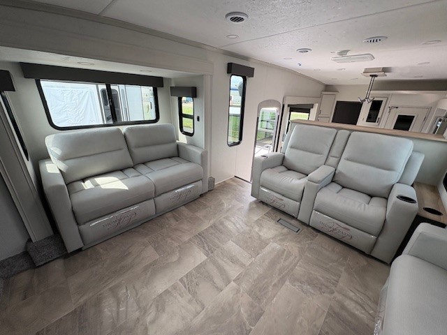 Camping or full-timing in this spacious fifth wheel will make the whole family happy. Your crew will love to visit in the front living area that included two tri-fold hide-a-bed sofas, theatre seating with a side table, plus an entertainment center for a 50" 4K Smart LED TV. The kitchen is any chef's dream with its kitchen island, large pantry, plus a hutch to store nice dishes, and stainless steel appliances. And the free-spanning table will allow you to dine just like you do at home. Head to the master suite to find a king bed slide out, two dressers, plus a full rear bath with dual bath sinks!
