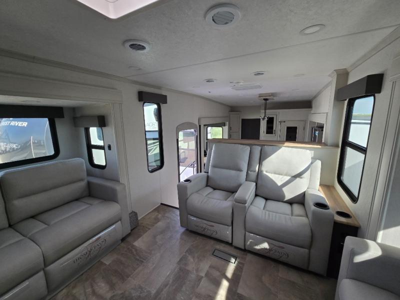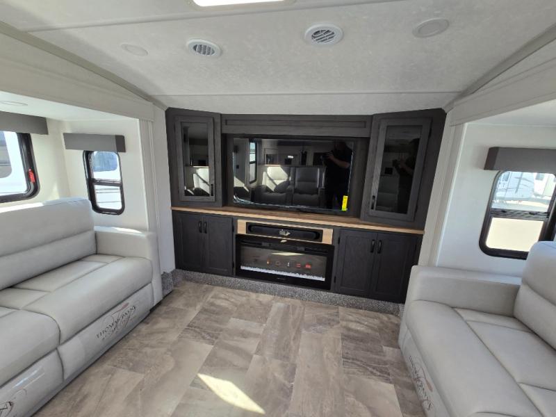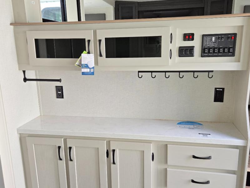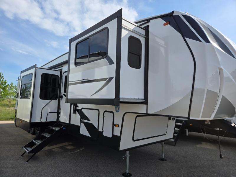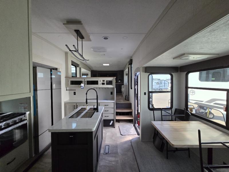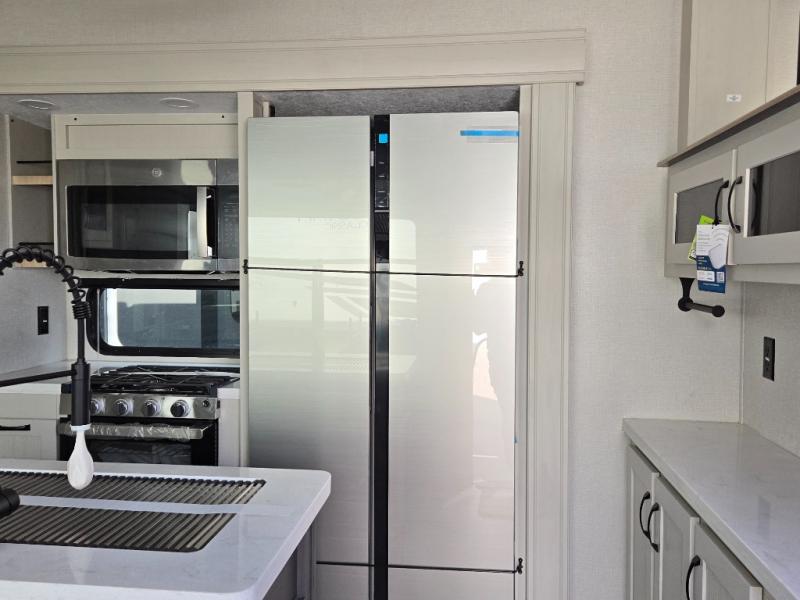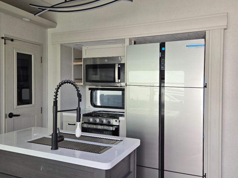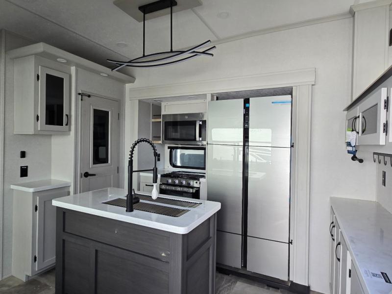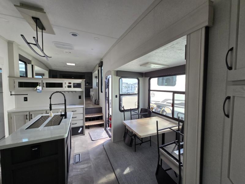 Camping or full-timing in this spacious fifth wheel will make the whole family happy. Your crew will love to visit in the front living area that included two tri-fold hide-a-bed sofas, theatre seating with a side table, plus an entertainment center for a 50" 4K Smart LED TV. The kitchen is any chef's dream with its kitchen island, large pantry, plus a hutch to store nice dishes, and stainless steel appliances. And the free-spanning table will allow you to dine just like you do at home. Head to the master suite to find a king bed slide out, two dressers, plus a full rear bath with dual bath sinks!