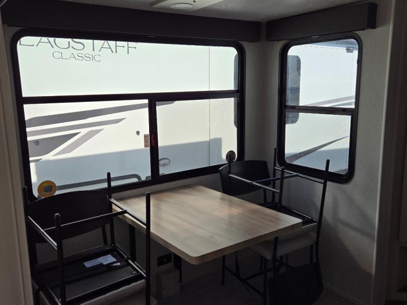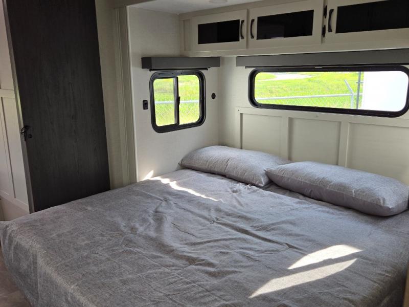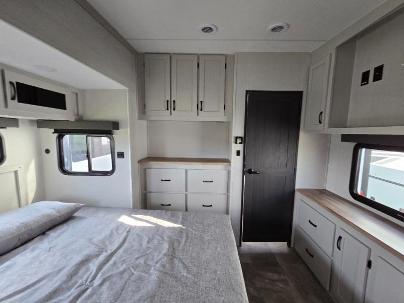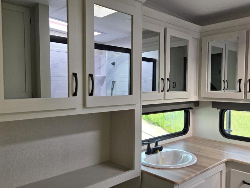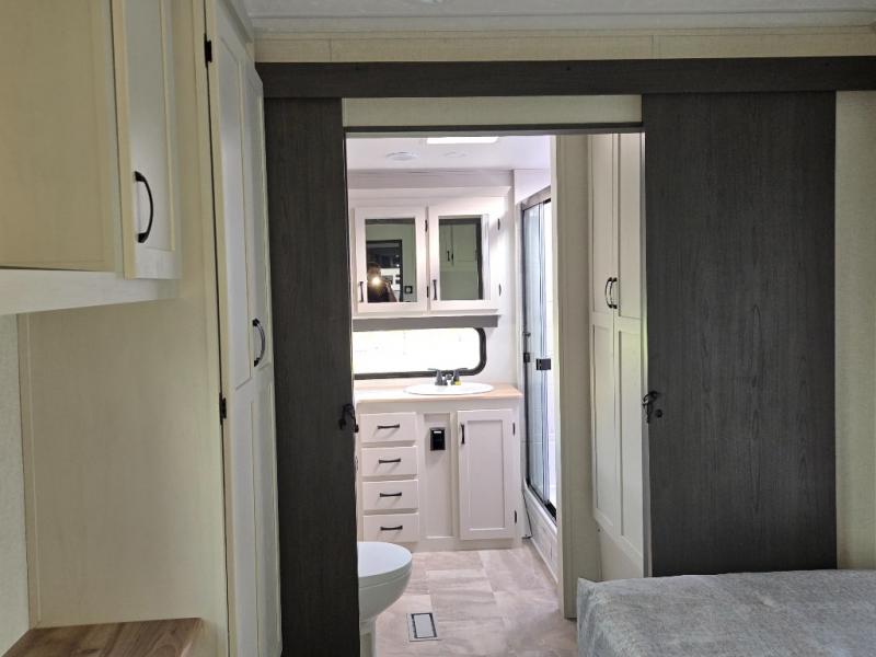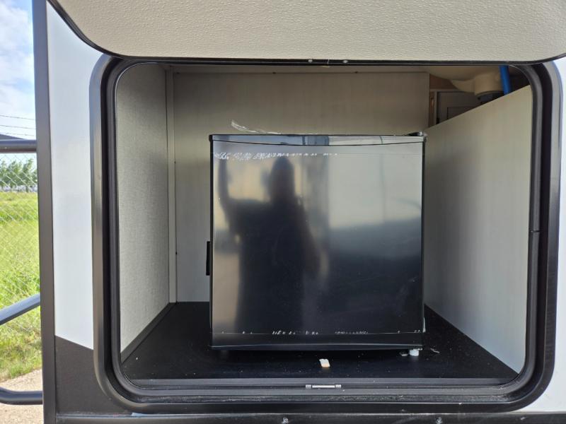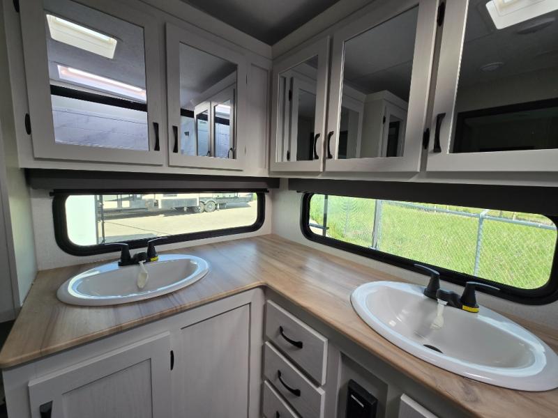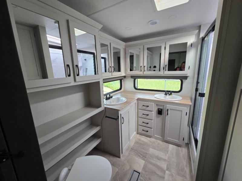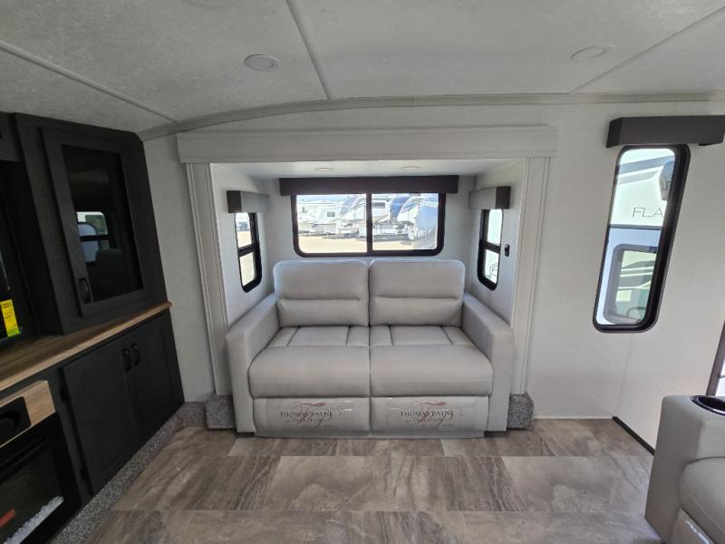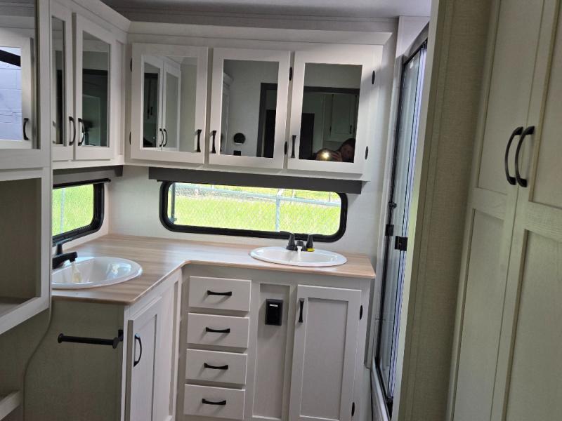 Camping or full-timing in this spacious fifth wheel will make the whole family happy. Your crew will love to visit in the front living area that included two tri-fold hide-a-bed sofas, theatre seating with a side table, plus an entertainment center for a 50" 4K Smart LED TV. The kitchen is any chef's dream with its kitchen island, large pantry, plus a hutch to store nice dishes, and stainless steel appliances. And the free-spanning table will allow you to dine just like you do at home. Head to the master suite to find a king bed slide out, two dressers, plus a full rear bath with dual bath sinks!