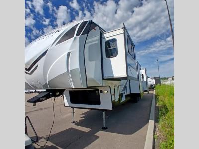 Camping or full-timing in this spacious fifth wheel will make the whole family happy. Your crew will love to visit in the front living area that included two tri-fold hide-a-bed sofas, theatre seating with a side table, plus an entertainment center for a 50" 4K Smart LED TV. The kitchen is any chef's dream with its kitchen island, large pantry, plus a hutch to store nice dishes, and stainless steel appliances. And the free-spanning table will allow you to dine just like you do at home. Head to the master suite to find a king bed slide out, two dressers, plus a full rear bath with dual bath sinks!