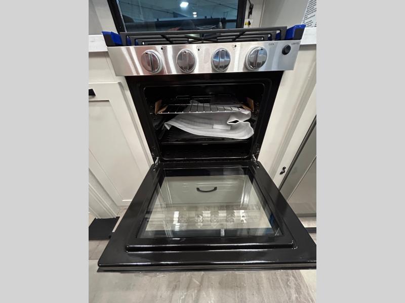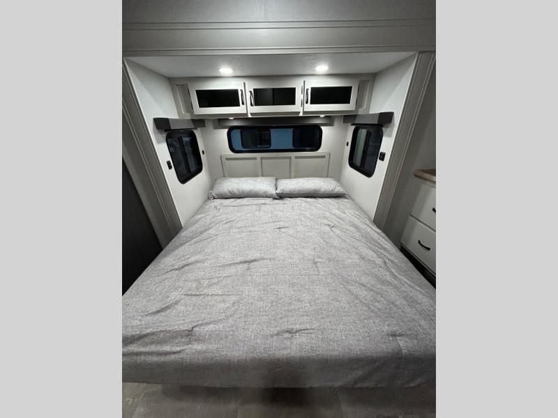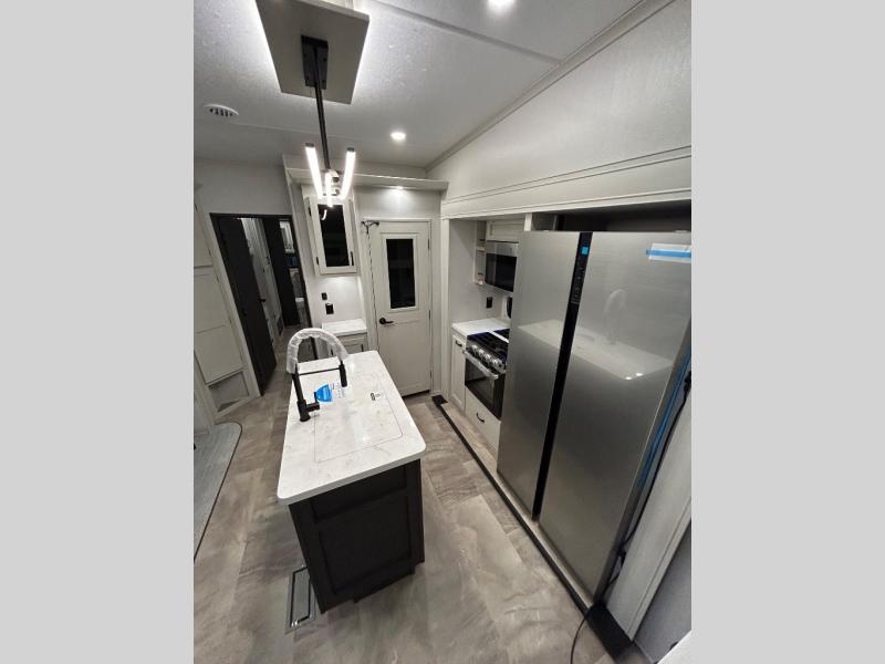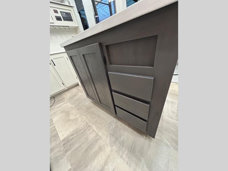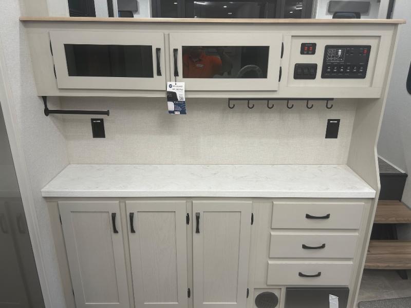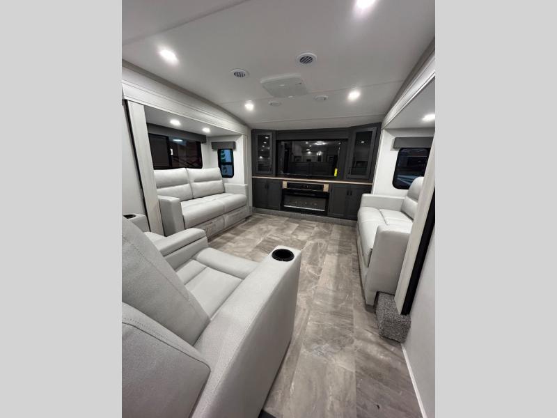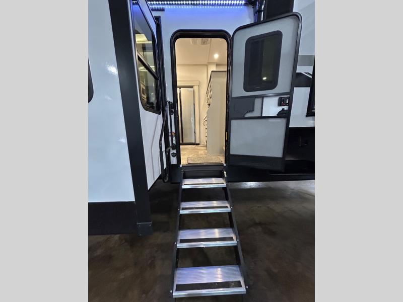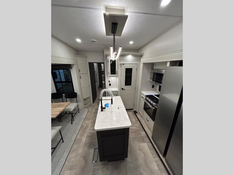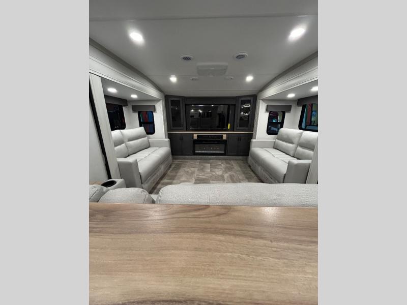 Camping or full-timing in this spacious fifth wheel will make the whole family happy. Your crew will love to visit in the front living area that included two tri-fold hide-a-bed sofas, theatre seating with a side table, plus an entertainment center for a 50" 4K Smart LED TV. The kitchen is any chef's dream with its kitchen island, large pantry, plus a hutch to store nice dishes, and stainless steel appliances. And the free-spanning table will allow you to dine just like you do at home. Head to the master suite to find a king bed slide out, two dressers, plus a full rear bath with dual bath sinks!