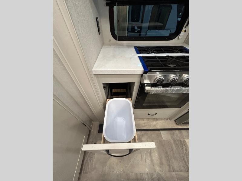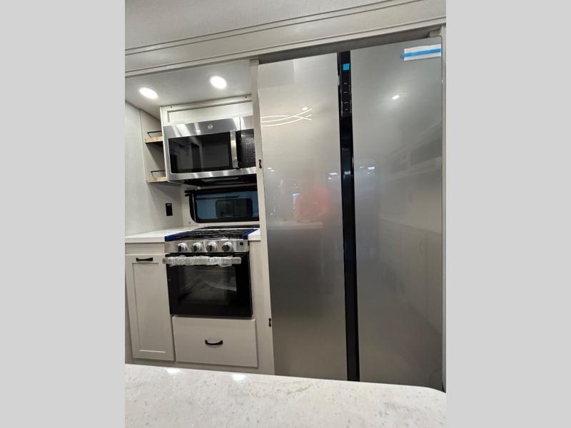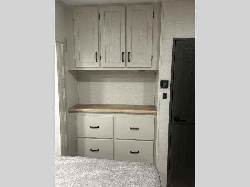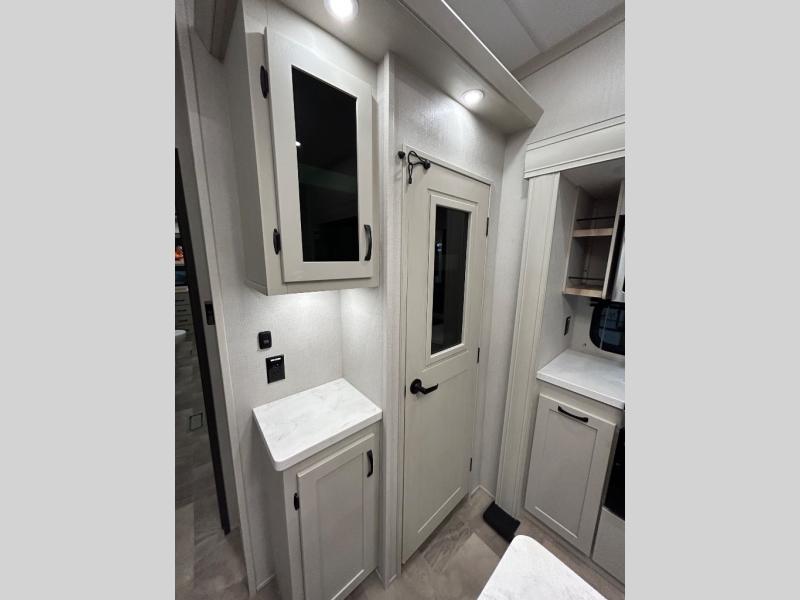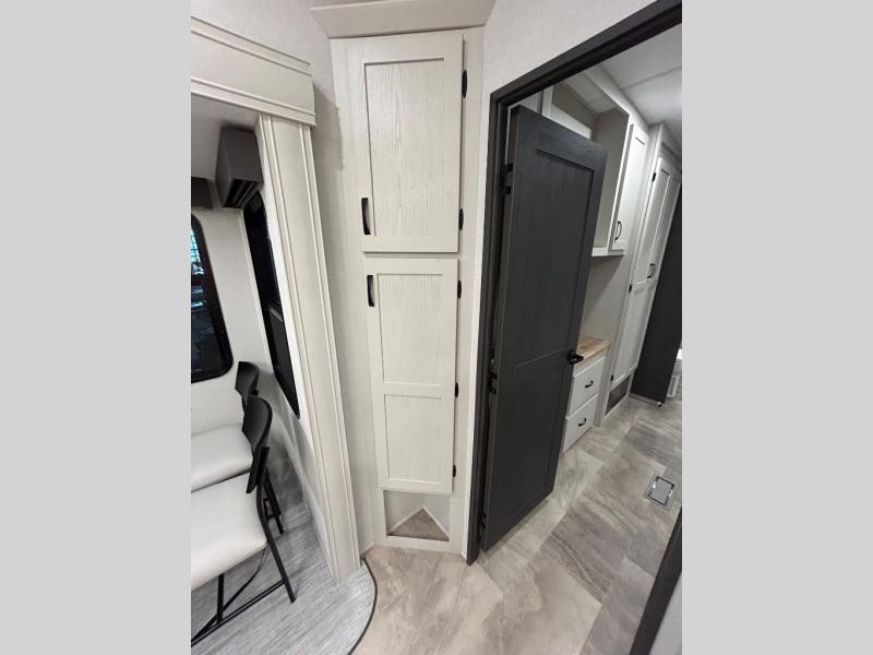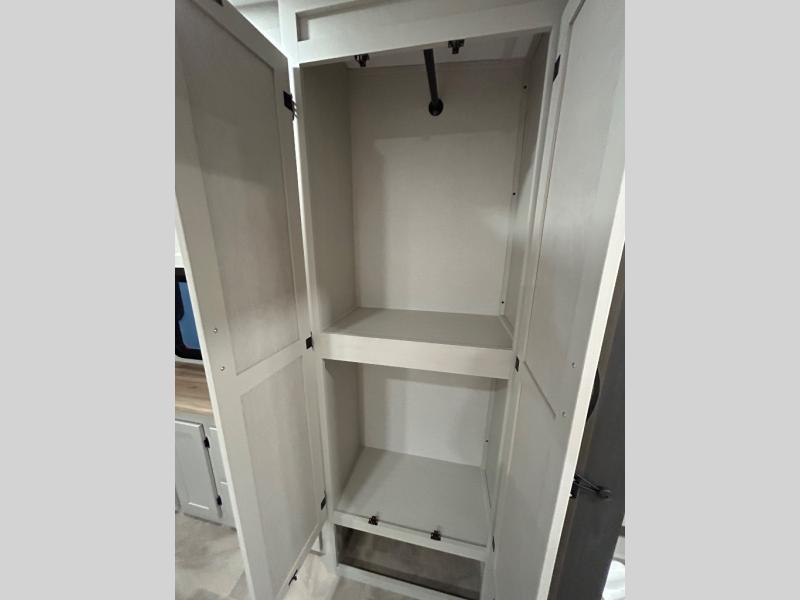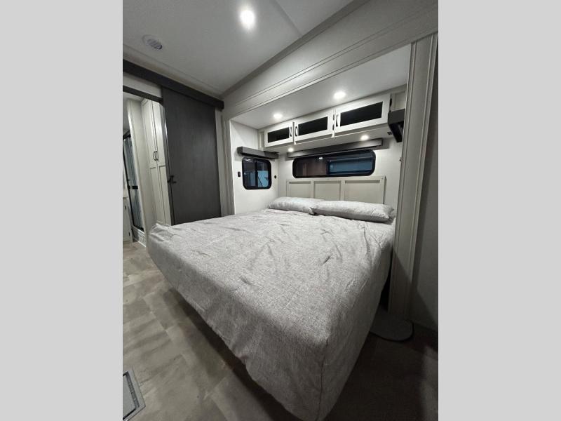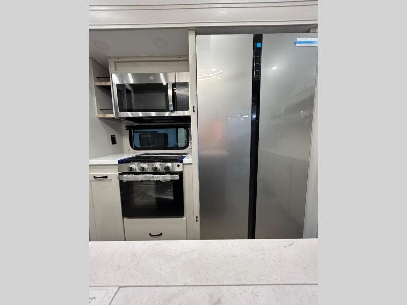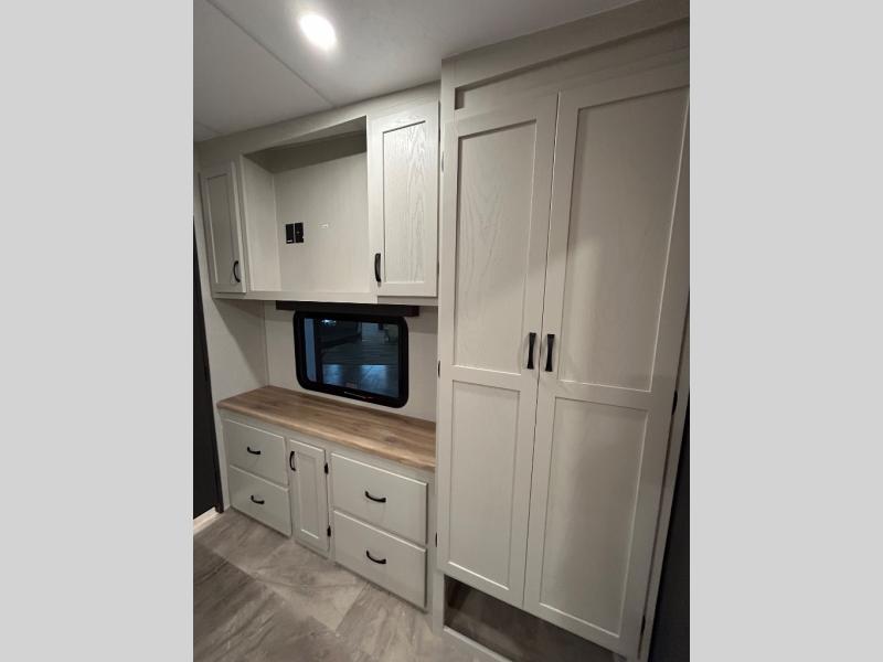 Camping or full-timing in this spacious fifth wheel will make the whole family happy. Your crew will love to visit in the front living area that included two tri-fold hide-a-bed sofas, theatre seating with a side table, plus an entertainment center for a 50" 4K Smart LED TV. The kitchen is any chef's dream with its kitchen island, large pantry, plus a hutch to store nice dishes, and stainless steel appliances. And the free-spanning table will allow you to dine just like you do at home. Head to the master suite to find a king bed slide out, two dressers, plus a full rear bath with dual bath sinks!
