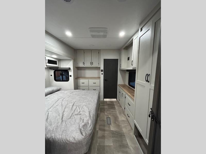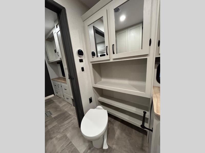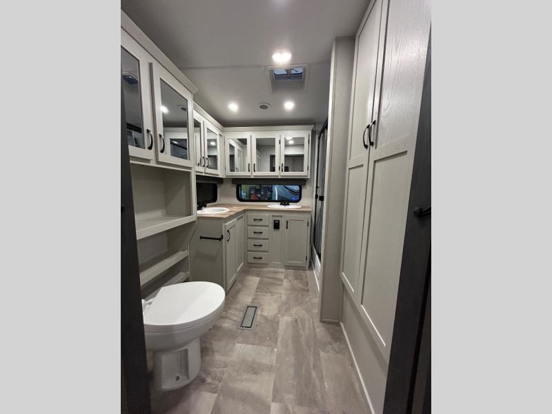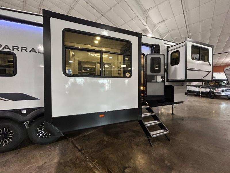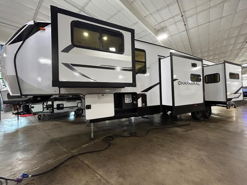 Each Chaparral mid-profile fifth wheel by Coachmen is designed with residential features, loads of storage space, and roomy bedroom suites to make you feel right at home. The durable construction means you can enjoy your RV for years to come. There's 6X double Azdel aluminum cage sidewall system, Weather Shield+ technology, and Tri-Tex powder coated frame technology that will help extend your camping season. Each model includes a Winegard Air 360+ HDTV/radio dome antenna to help keep you connected as you camp, slow rise blackout roller night shades, a new 16 cu. ft. side-by-side stainless glass 12V refrigerator, and a modern electric fireplace to make your space cozy. There is also a large transom window in the kitchen, a modern high-rise faucet, LED motion sensor lights in the bathroom, plus a full-size shower with glass doors and a seat. Now that's what I call luxury! Choose a Chaparral fifth wheel today!