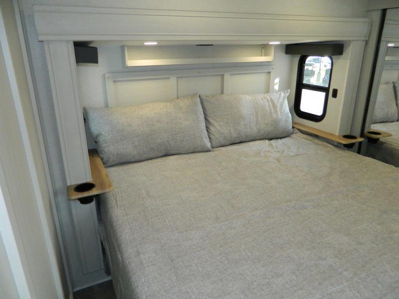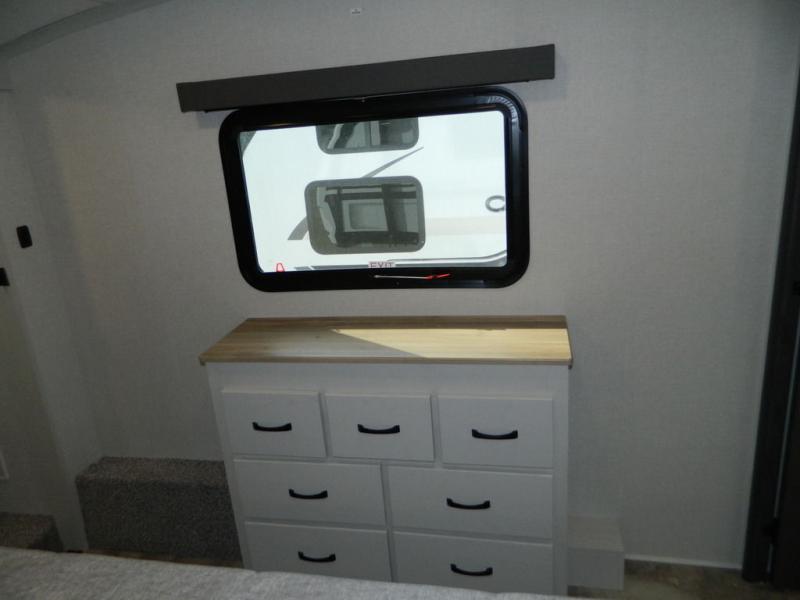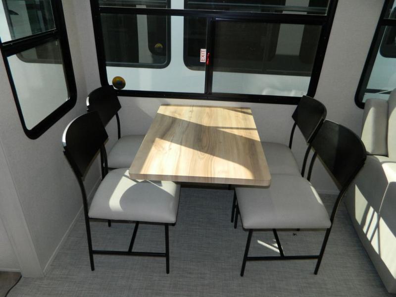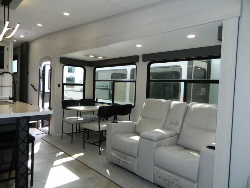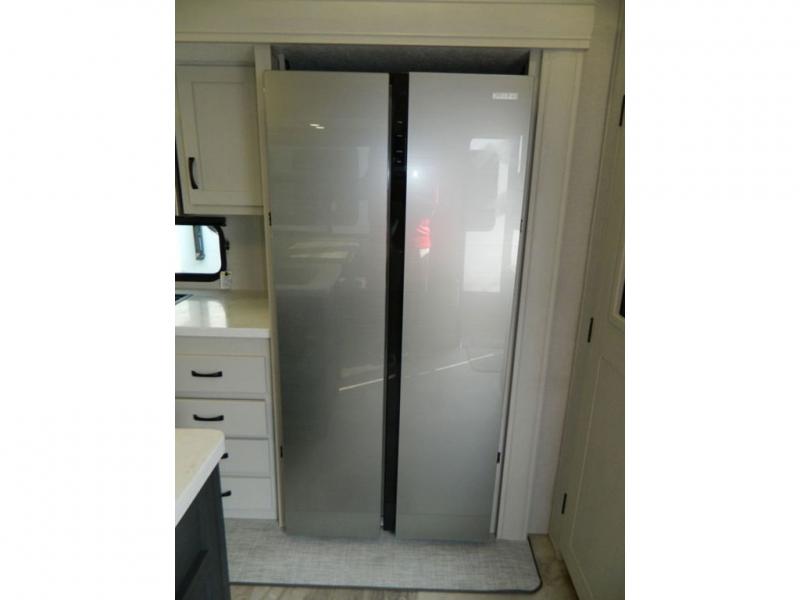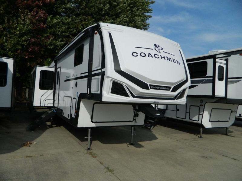Each Chaparral mid-profile fifth wheel by Coachmen is designed with residential features, loads of storage space, and roomy bedroom suites to make you feel right at home. The durable construction means you can enjoy your RV for years to come. There's 6X double Azdel aluminum cage sidewall system, Weather Shield+ technology, and Tri-Tex powder coated frame technology that will help extend your camping season. Each model includes a Winegard Air 360+ HDTV/radio dome antenna to help keep you connected as you camp, slow rise blackout roller night shades, a new 16 cu. ft. side-by-side stainless glass 12V refrigerator, and a modern electric fireplace to make your space cozy. There is also a large transom window in the kitchen, a modern high-rise faucet, LED motion sensor lights in the bathroom, plus a full-size shower with glass doors and a seat. Now that's what I call luxury! Choose a Chaparral fifth wheel today!