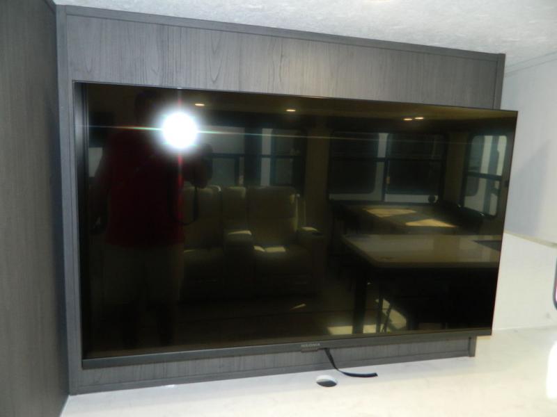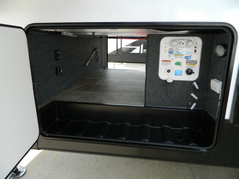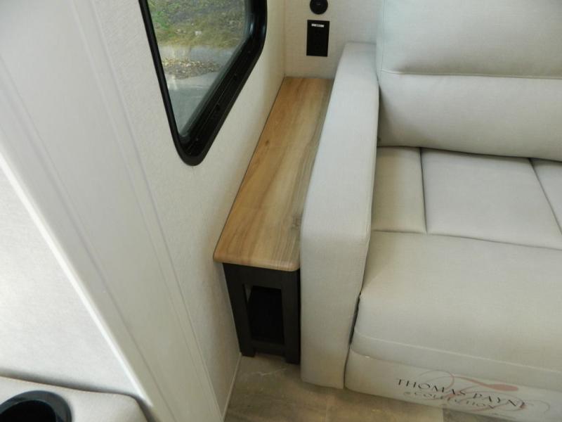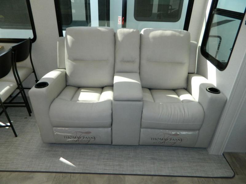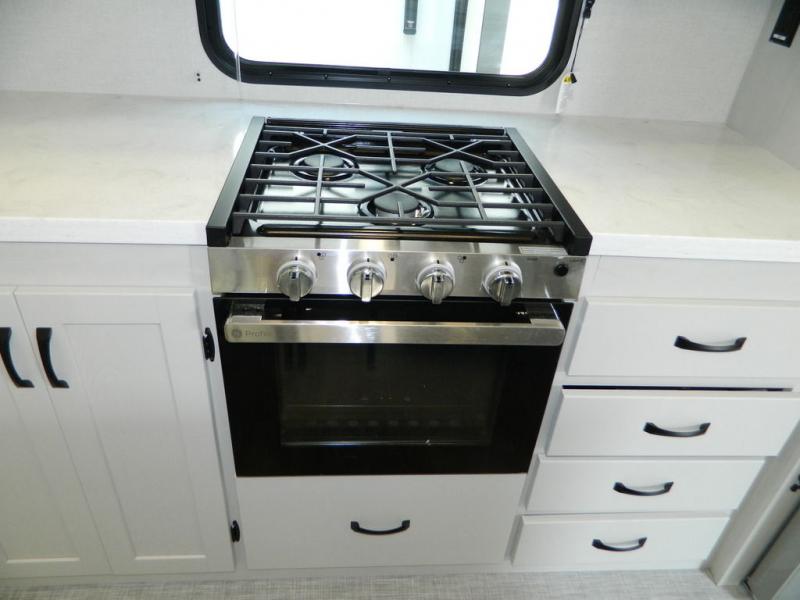 Are you wanting to trade out your busy work weeks for relaxing vacations? This fifth wheel can give you just that! Once you arrive at your destination, set up the 16' power awning with LED lights and enjoy some fresh air before you unpack your bags. The chef can start lunch on the GE Profile 21" oven with a residential cooktop, and there is an island with two barstools if the little ones want to color while they wait on their food. This model also includes a large pantry plus extra counter space with overhead storage for dishes. Everyone can take turns cleaning up in the full bath that includes a spacious shower with a seat and a linen closet to keep clean towels close by. When it's time to call it a night, you'll enjoy the king bed slide out in the front bedroom, while your guests take the rear tri-fold hide-a-bed sofa!