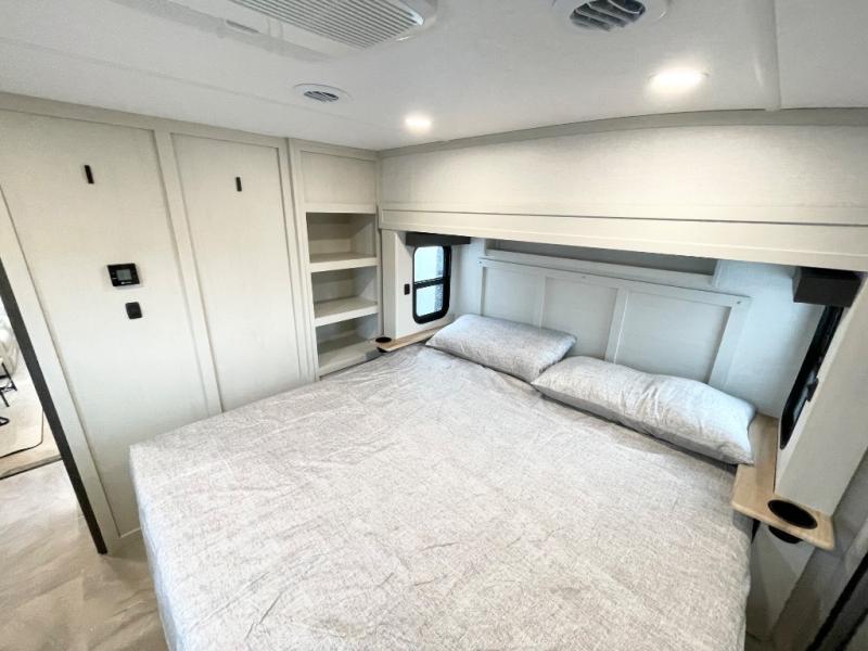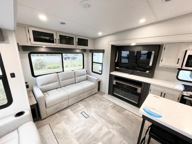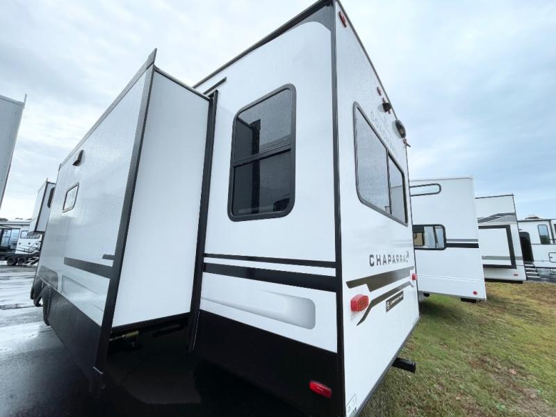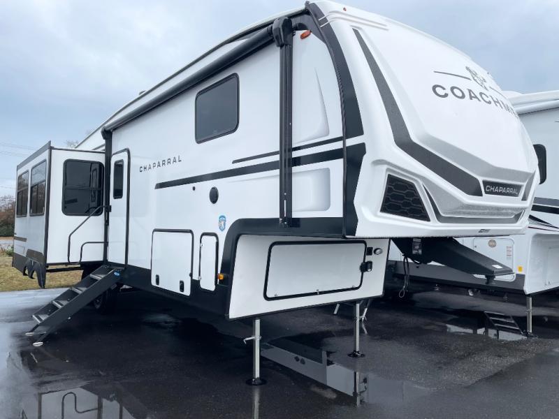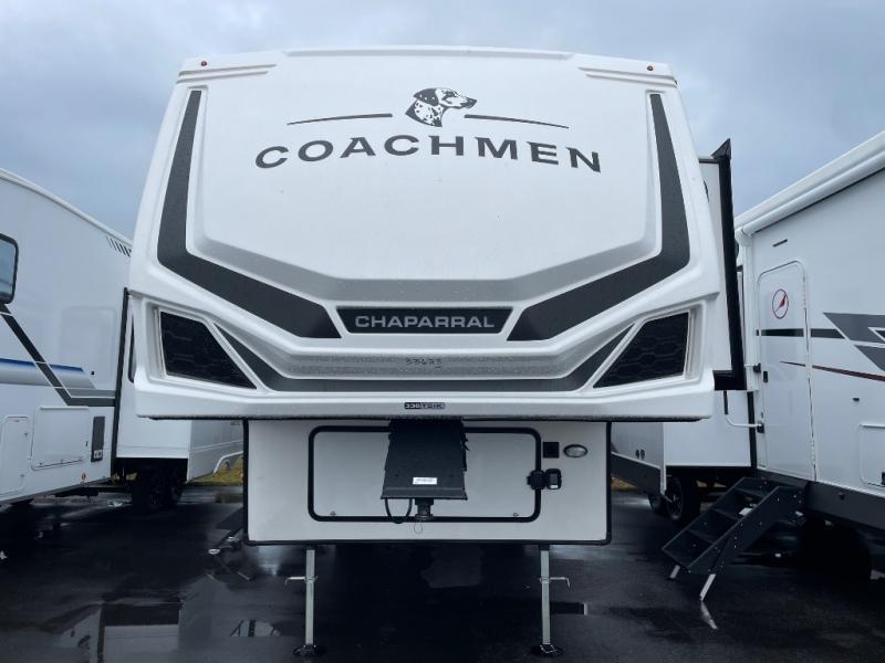 Each Chaparral mid-profile fifth wheel by Coachmen is designed with residential features, loads of storage space, and roomy bedroom suites to make you feel right at home. The durable construction means you can enjoy your RV for years to come. There's 6X double Azdel aluminum cage sidewall system, Weather Shield+ technology, and Tri-Tex powder coated frame technology that will help extend your camping season. Each model includes a Winegard Air 360+ HDTV/radio dome antenna to help keep you connected as you camp, slow rise blackout roller night shades, a new 16 cu. ft. side-by-side stainless glass 12V refrigerator, and a modern electric fireplace to make your space cozy. There is also a large transom window in the kitchen, a modern high-rise faucet, LED motion sensor lights in the bathroom, plus a full-size shower with glass doors and a seat. Now that's what I call luxury! Choose a Chaparral fifth wheel today!