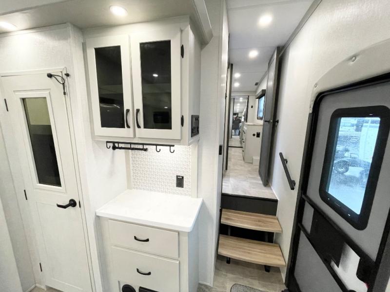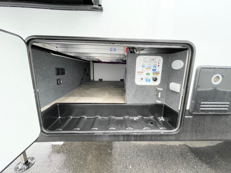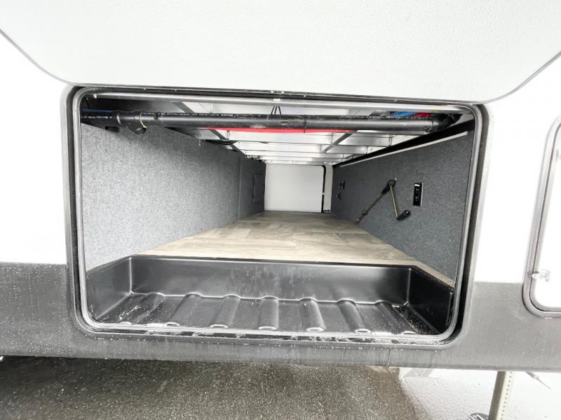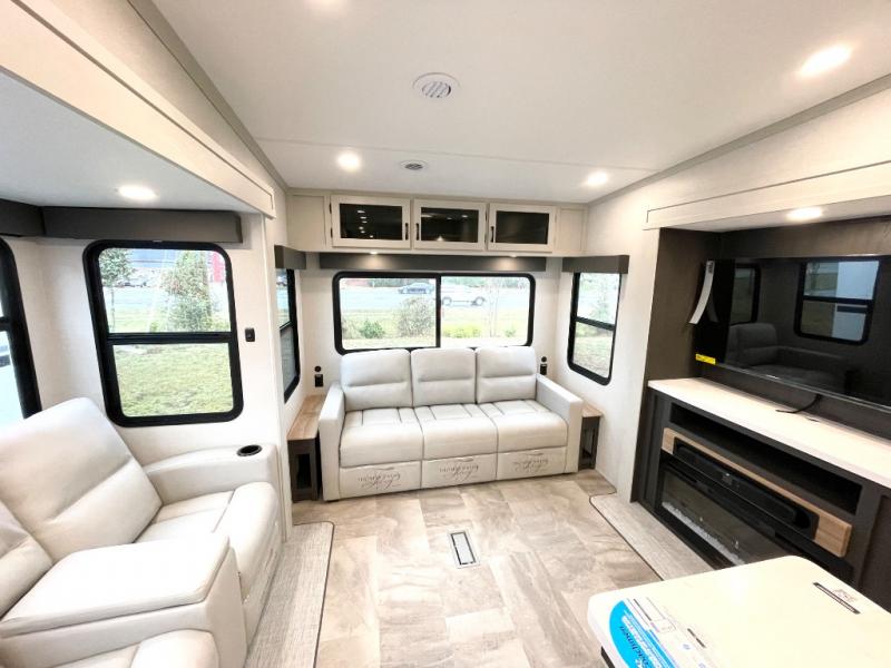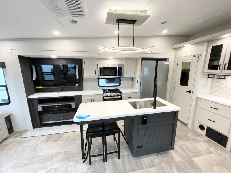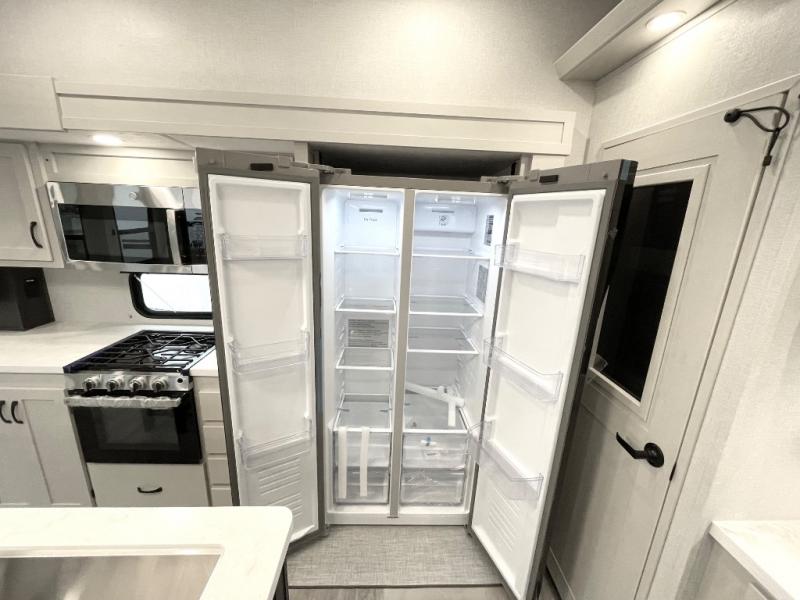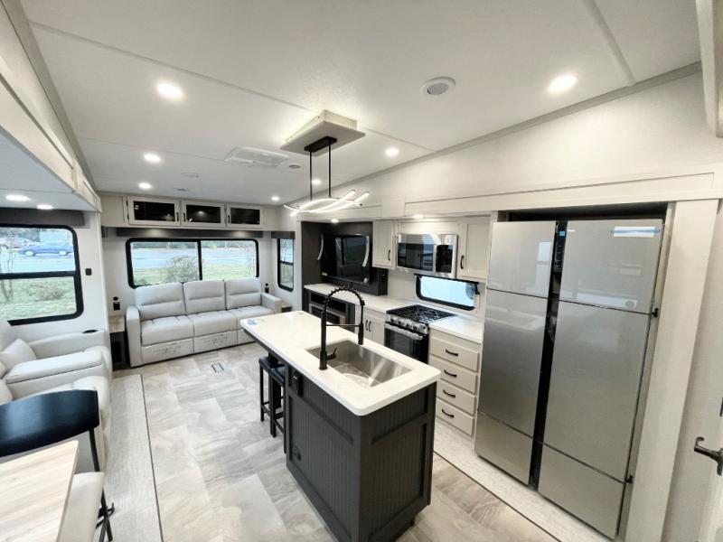 Are you wanting to trade out your busy work weeks for relaxing vacations? This fifth wheel can give you just that! Once you arrive at your destination, set up the 16' power awning with LED lights and enjoy some fresh air before you unpack your bags. The chef can start lunch on the GE Profile 21" oven with a residential cooktop, and there is an island with two barstools if the little ones want to color while they wait on their food. This model also includes a large pantry plus extra counter space with overhead storage for dishes. Everyone can take turns cleaning up in the full bath that includes a spacious shower with a seat and a linen closet to keep clean towels close by. When it's time to call it a night, you'll enjoy the king bed slide out in the front bedroom, while your guests take the rear tri-fold hide-a-bed sofa!