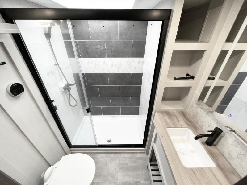What I liked most: Master bedroom has air-conditioning unit right in it for extra cooling. Large walk-in shower with seat and tile design in the surround. Large skylight in shower let's and lots of natural light. Sink has a stylish design. Kitchen has a full normal hinge door plenty of storage pantry.