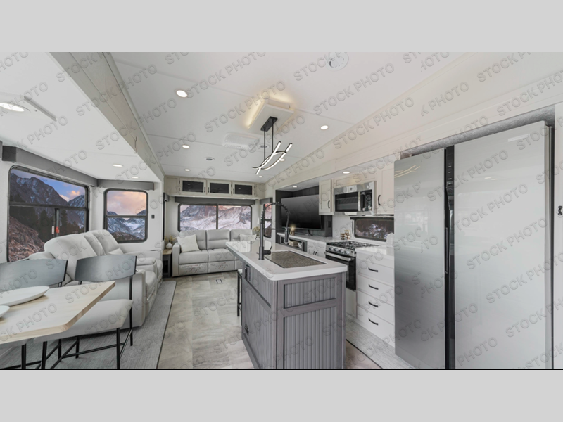 Are you wanting to trade out your busy work weeks for relaxing vacations? This fifth wheel can give you just that! Once you arrive at your destination, set up the 16' power awning with LED lights and enjoy some fresh air before you unpack your bags. The chef can start lunch on the GE Profile 21" oven with a residential cooktop, and there is an island with two barstools if the little ones want to color while they wait on their food. This model also includes a large pantry plus extra counter space with overhead storage for dishes. Everyone can take turns cleaning up in the full bath that includes a spacious shower and a linen closet to keep clean towels close by. When it's time to call it a night, you'll enjoy the king bed slide out in the front bedroom, while your guests take the rear tri-fold hide-a-bed sofa!