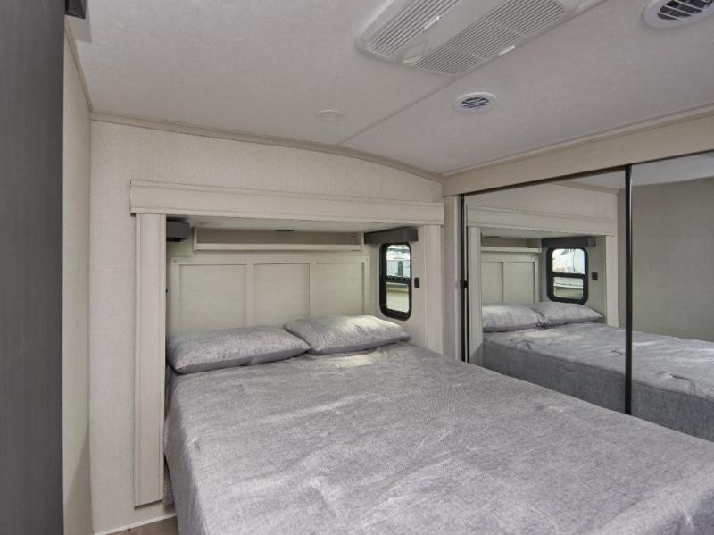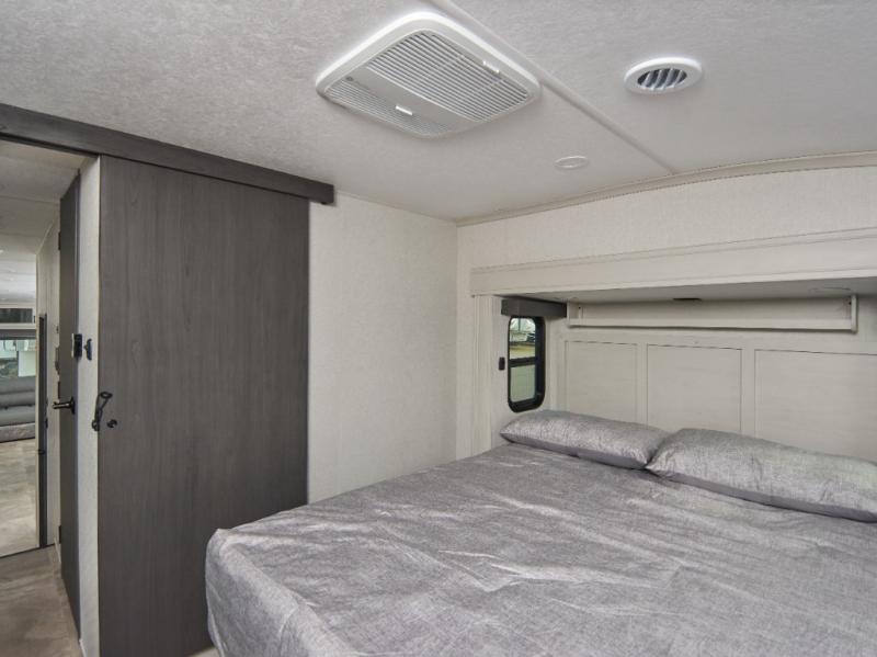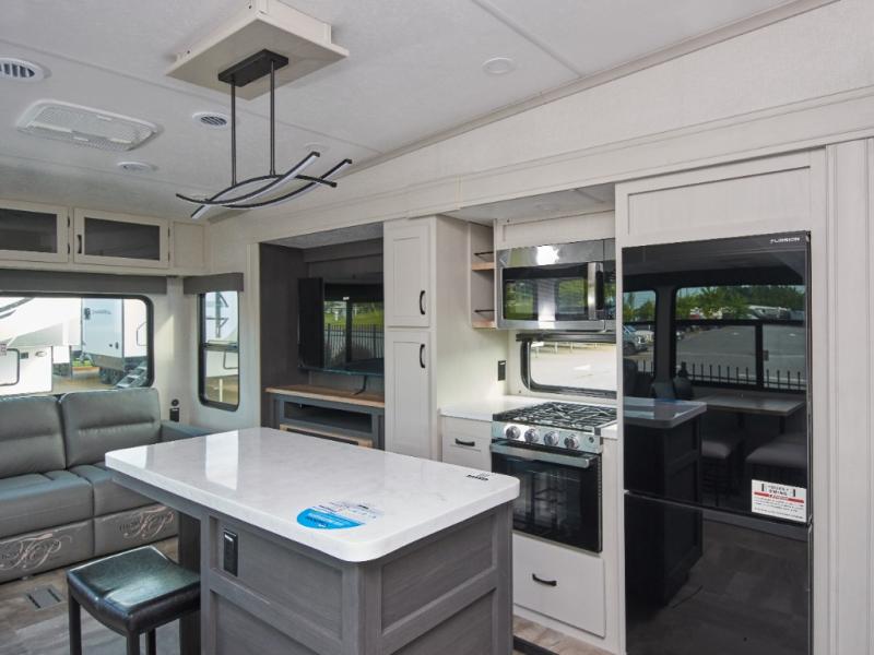 Experience residential luxury on the road with the Chaparral 360IBL, offering a spacious kitchen island with barstools and a private bunkhouse perfect for family adventures.