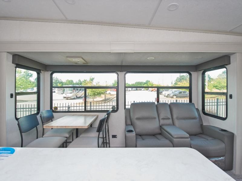 Gather in the open-concept living area, where dual opposing slides maximize space around the tri-fold hide-a-bed sofa, free-spanning dinette, and cinema-style theatre seating. The kitchen boasts stainless steel appliances, a deep single-basin sink, and an oversized island with barstools for casual dining.