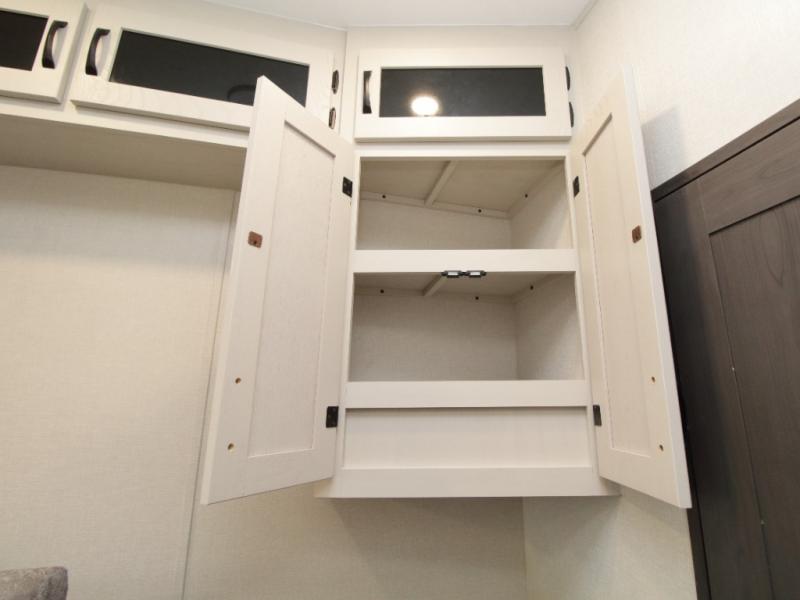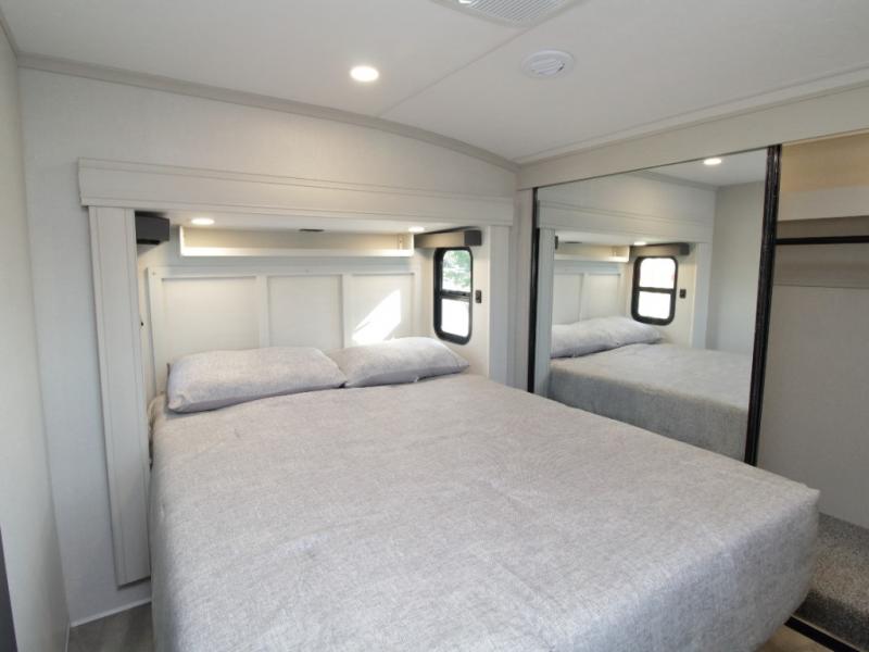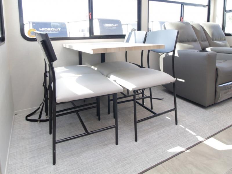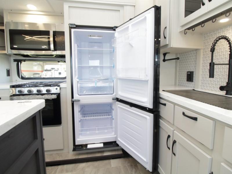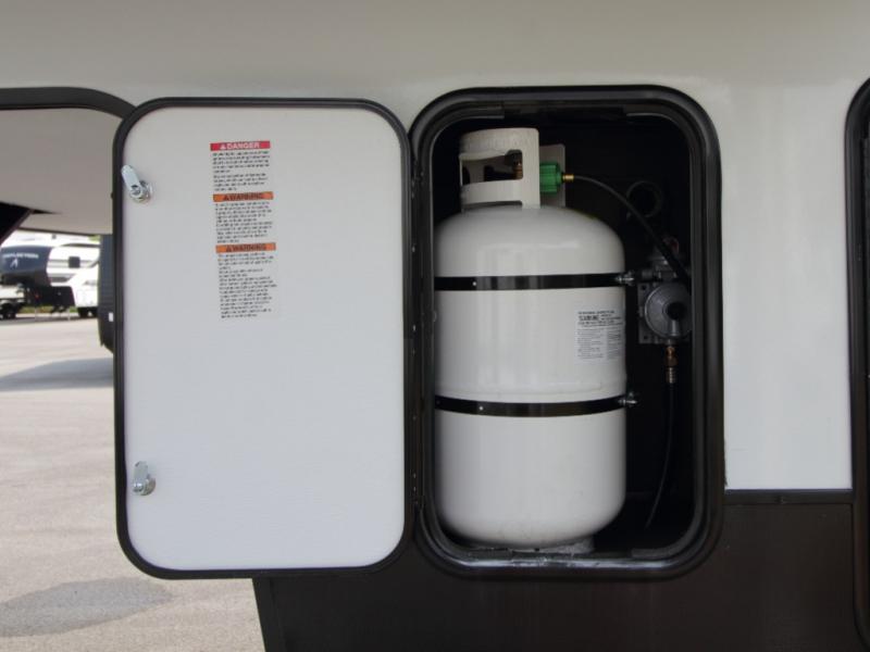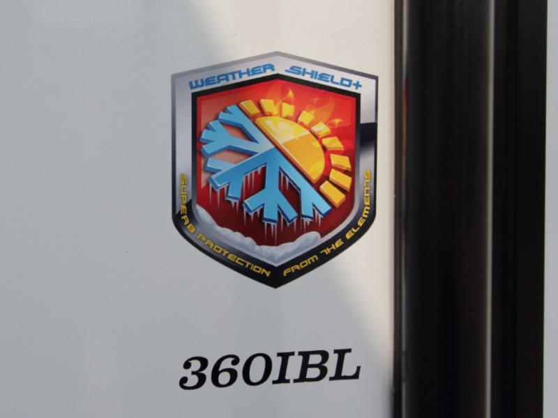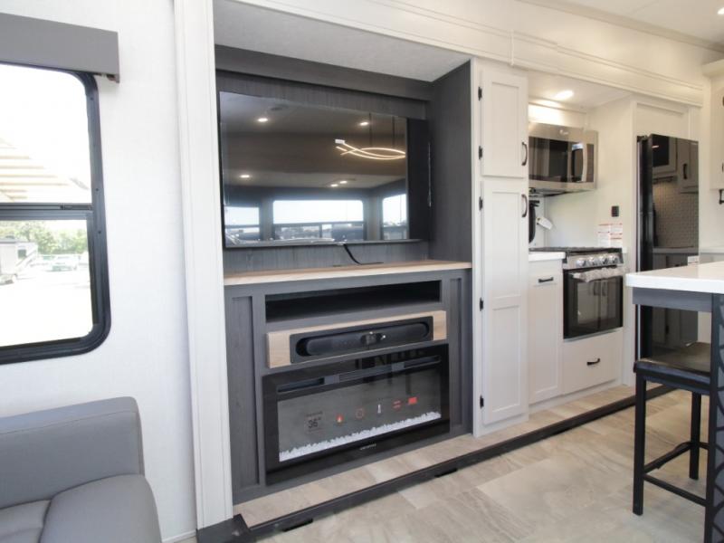 Other luxury touches include a modern fireplace, 16 cu. ft. stainless glass refrigerator, blackout roller shades, LED motion sensor lighting, and a large transom kitchen window. With the Chaparral 360IBL, you’ll enjoy the perfect balance of comfort, durability, and upscale design.