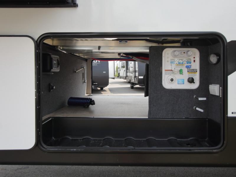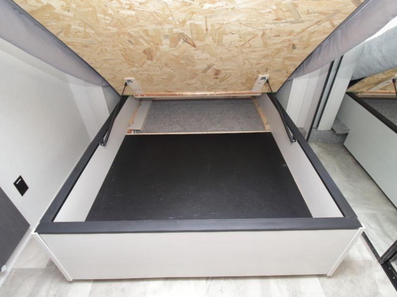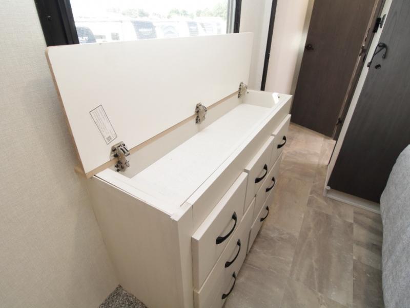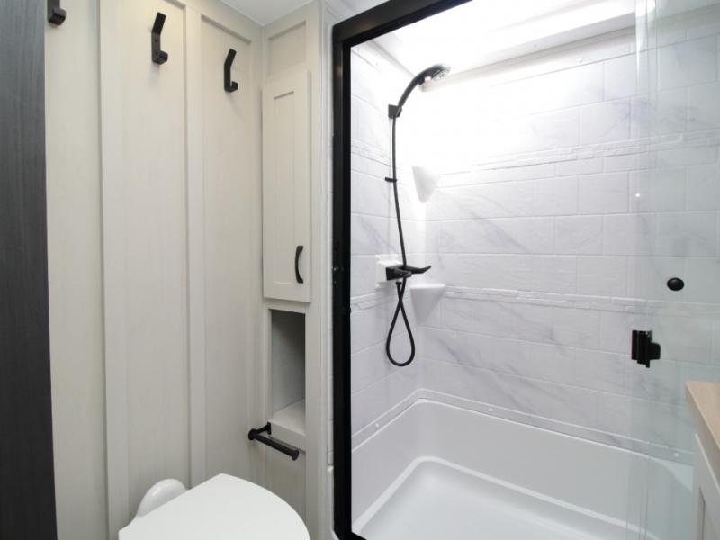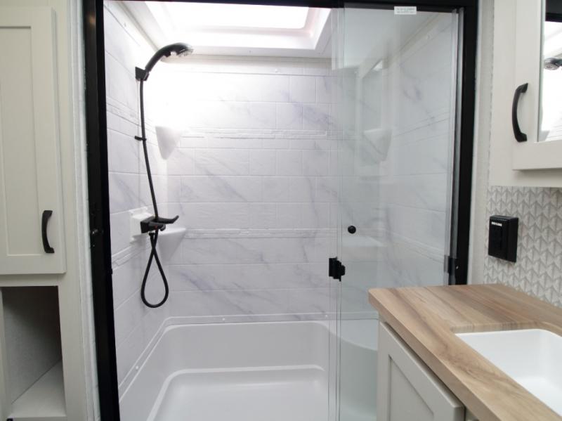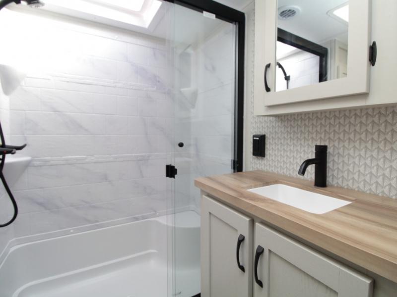 A full bath includes a residential-style shower with a seat, vanity, and storage. Outside, you’ll appreciate durable construction with the 6X double Azdel aluminum cage sidewalls, Weather Shield+ technology, and Tri-Tex powder coated frame, ensuring years of worry-free camping.