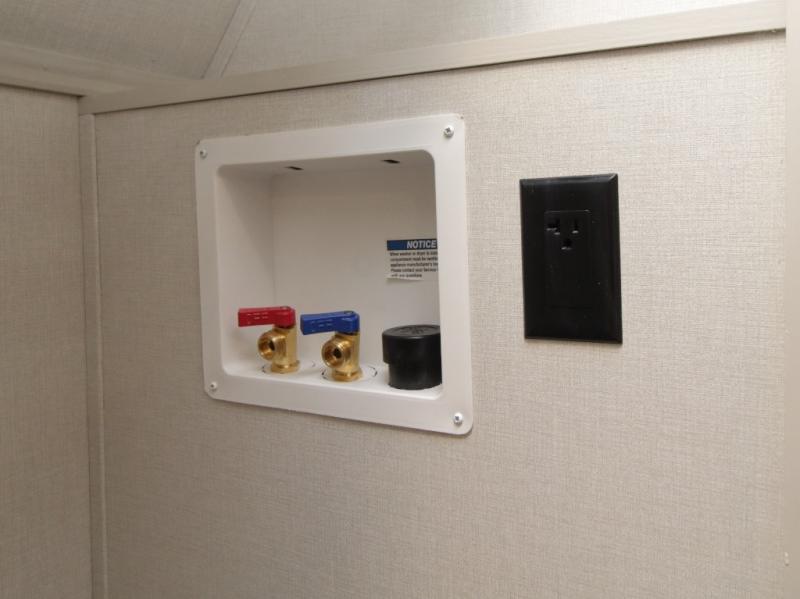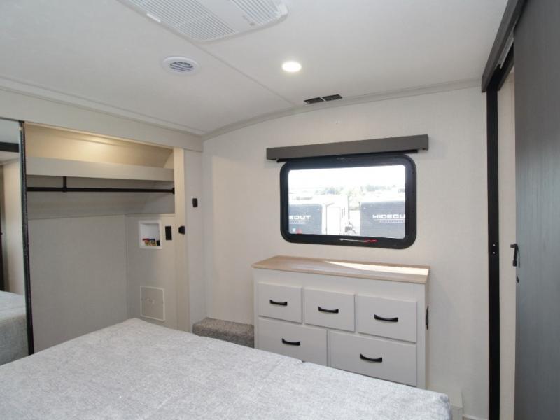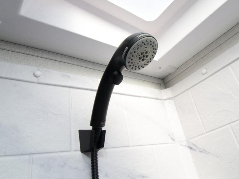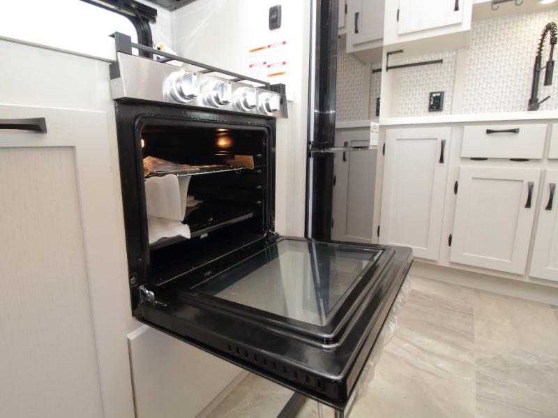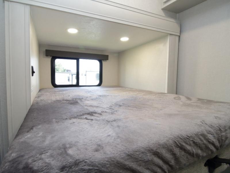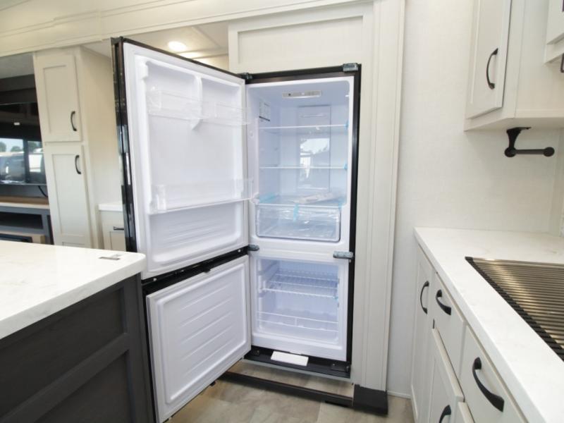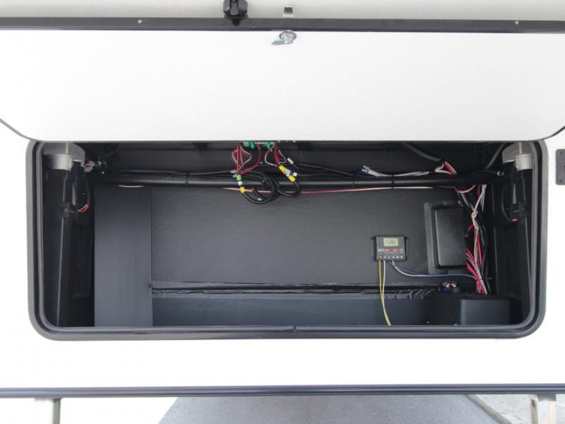 A full bath includes a residential-style shower with a seat, vanity, and storage. Outside, you’ll appreciate durable construction with the 6X double Azdel aluminum cage sidewalls, Weather Shield+ technology, and Tri-Tex powder coated frame, ensuring years of worry-free camping.