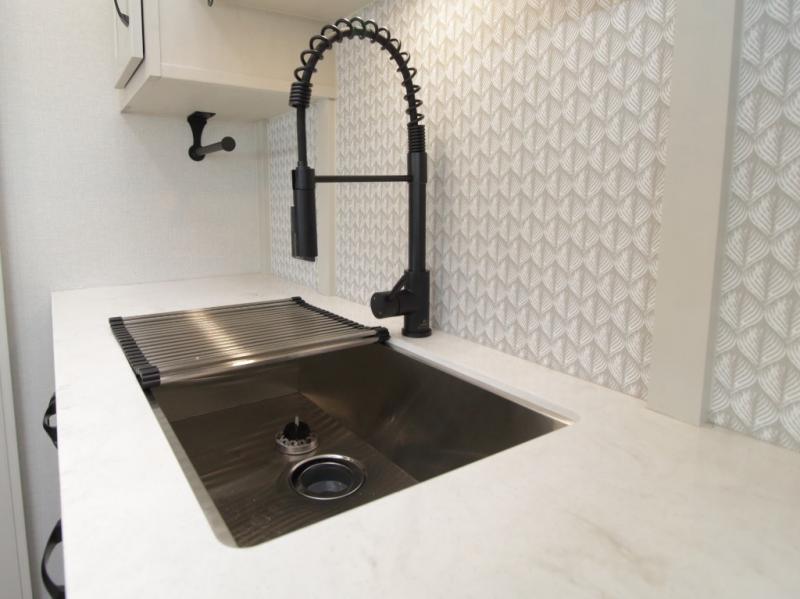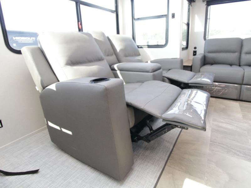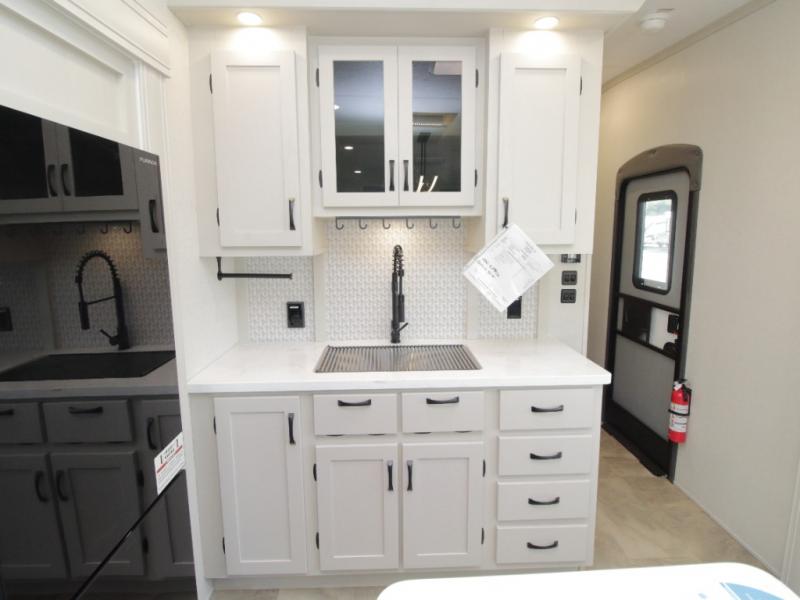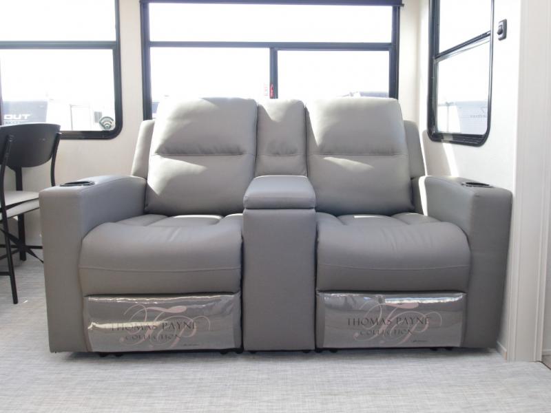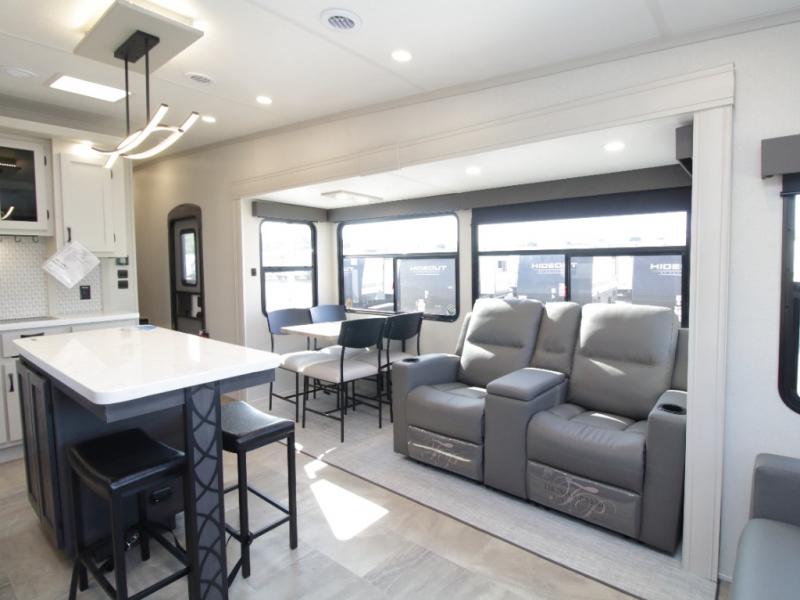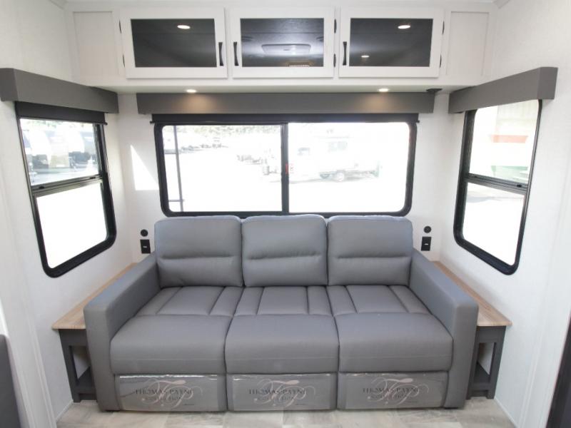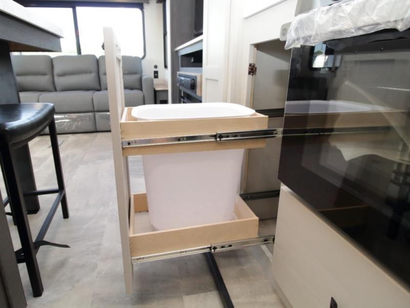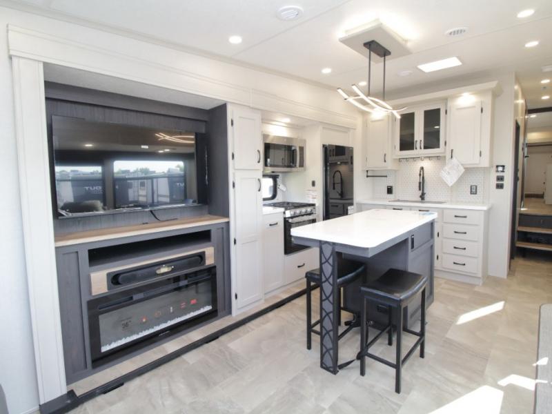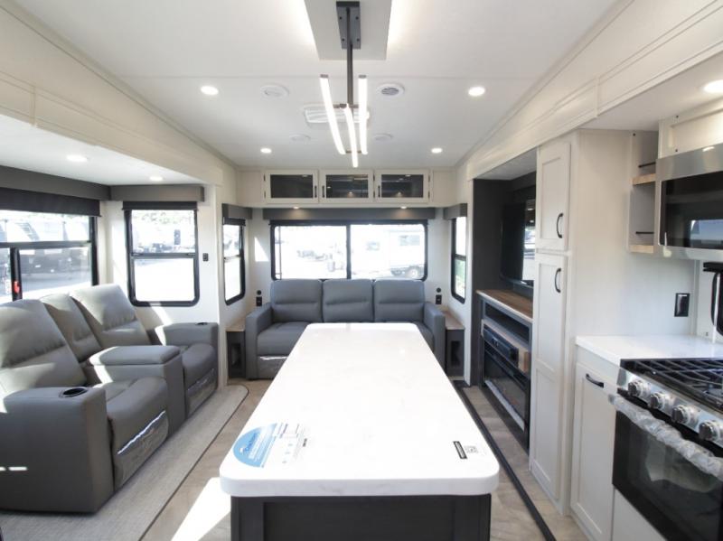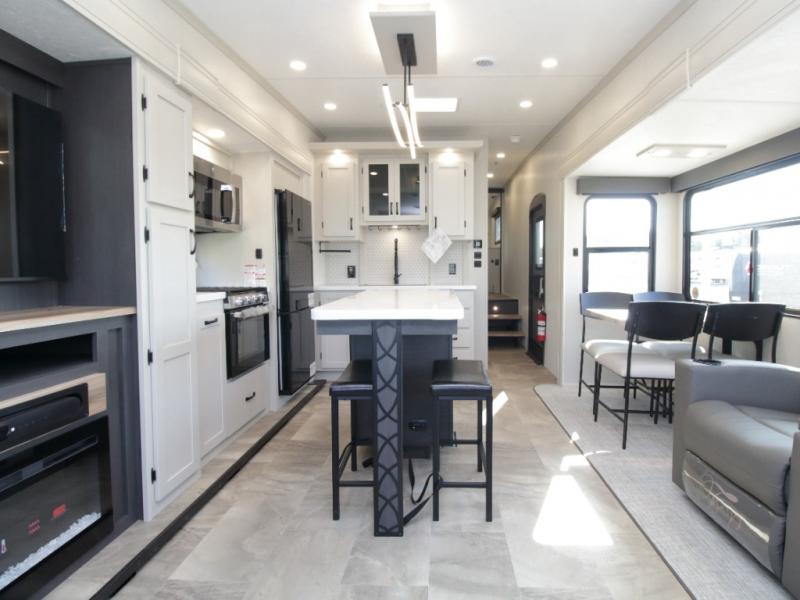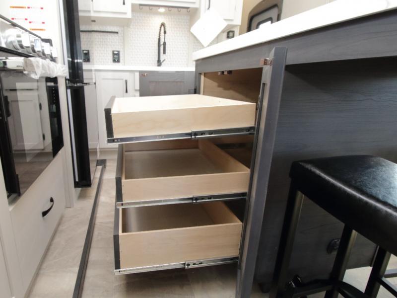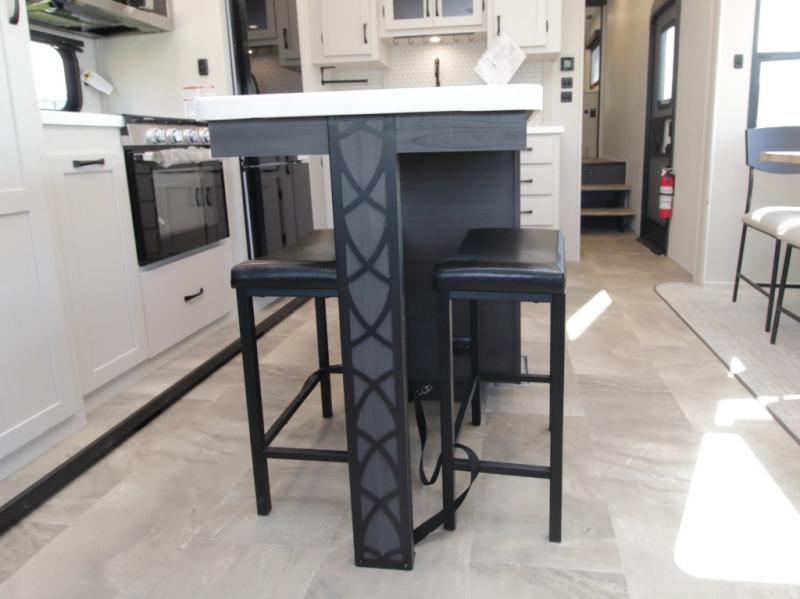 The main living area is bright and open with dual opposing slides, theatre seating, a free-standing dinette, and a tri-fold hide-a-bed sofa for extra guests. At the heart of it all, the kitchen island with barstools provides extra seating and prep space, while stainless steel appliances, a deep single basin sink, and abundant cabinetry make cooking on the road easy and enjoyable.