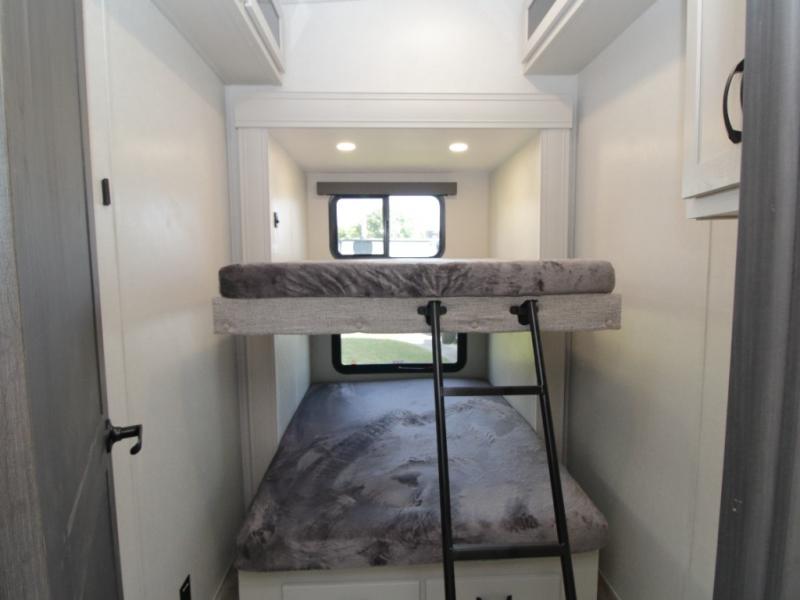 The Chaparral 360IBL by Coachmen is the perfect choice for families or groups looking for a spacious and luxurious fifth wheel. Sleeping up to eight people, this model features a private middle bunkhouse with double-size bunks and storage cabinets, along with a front private bedroom that includes a queen bed slide-out, a large wardrobe, and washer/dryer prep for extended trips.