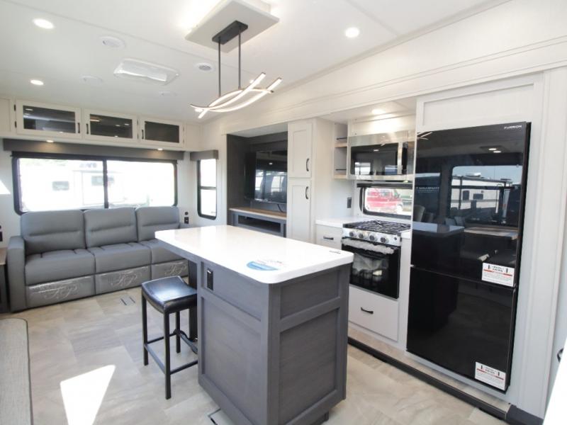 Experience residential luxury on the road with the 2026 Chaparral 360IBL, offering a spacious kitchen island with barstools and a private bunkhouse perfect for family adventures.