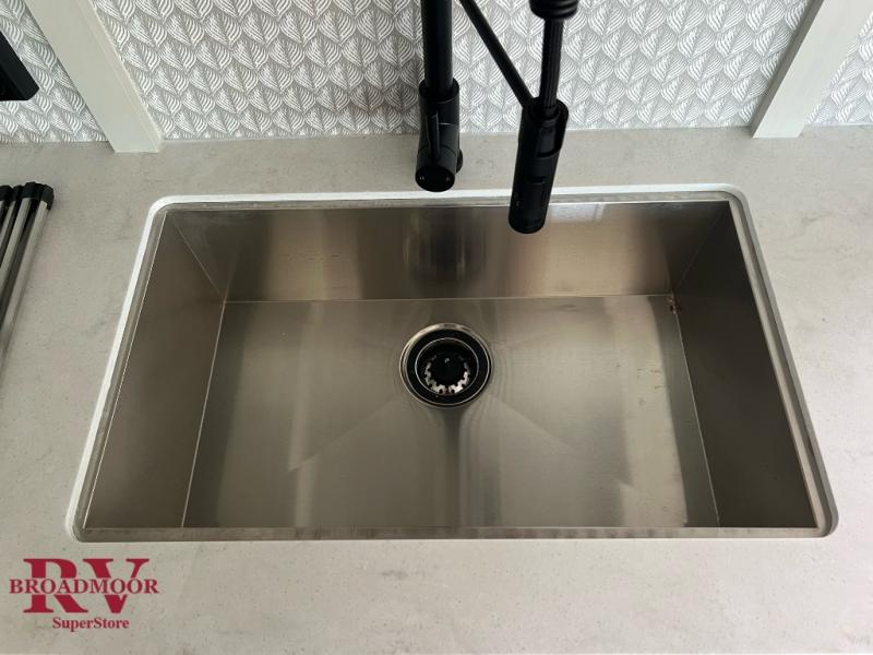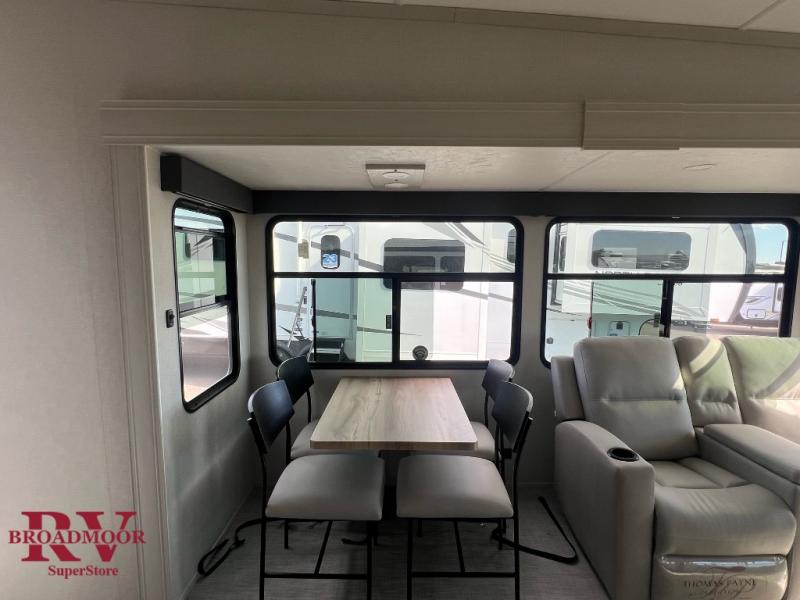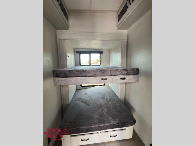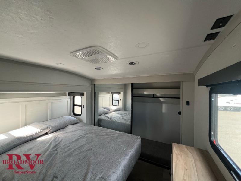 What could be better than a camping trip with family and friends? A camping trip in this spacious fifth wheel that can sleep eight people comfortably! There is a private middle bunkhouse with double-size bunks and overhead cabinets to store belongings, and a front private bedroom with a queen bed slide out. You'll find storage space in the large bedroom wardrobe that also includes washer and dryer prep if you plan to go full-time or camp for longer periods of time. Everyone can meet in the main living area that includes dual opposing slides, theatre seating, a free-spanning table, plus a tri-fold hide-a-bed sofa! And we didn't even mention the fully-equipped kitchen with stainless steel appliances, an extra deep single basin sink, plus tons of counter space with overhead cabinets for more storage!