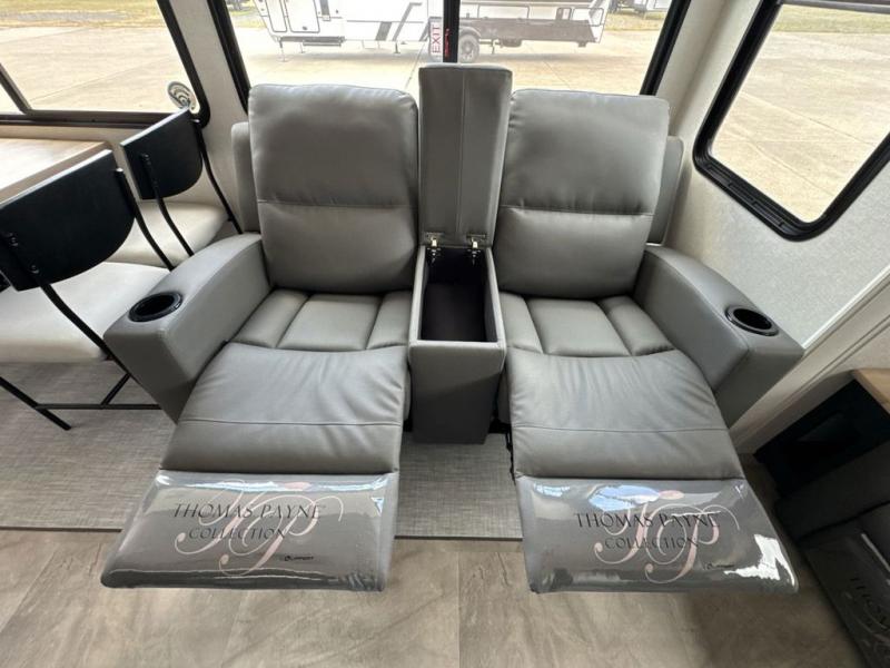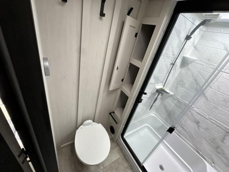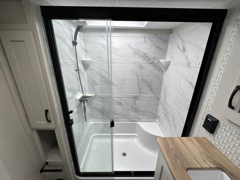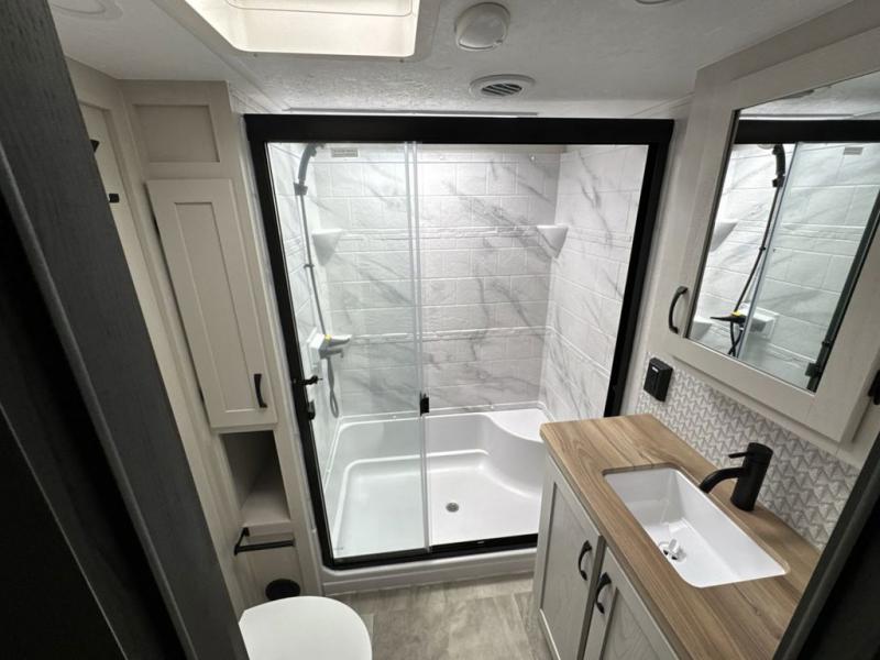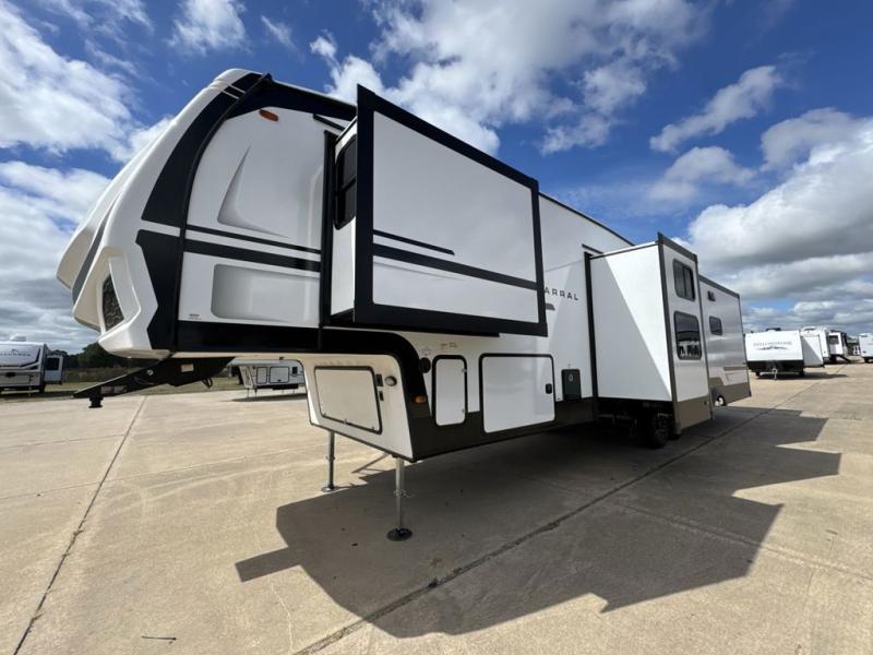 Each Chaparral mid-profile fifth wheel by Coachmen is designed with residential features, loads of storage space, and roomy bedroom suites to make you feel right at home. The durable construction means you can enjoy your RV for years to come. There's 6X double Azdel aluminum cage sidewall system, Weather Shield+ technology, and Tri-Tex powder coated frame technology that will help extend your camping season. Each model includes a Winegard Air 360+ HDTV/radio dome antenna to help keep you connected as you camp, slow rise blackout roller night shades, a new 16 cu. ft. side-by-side stainless glass 12V refrigerator, and a modern electric fireplace to make your space cozy. There is also a large transom window in the kitchen, a modern high-rise faucet, LED motion sensor lights in the bathroom, plus a full-size shower with glass doors and a seat. Now that's what I call luxury! Choose a Chaparral fifth wheel today!