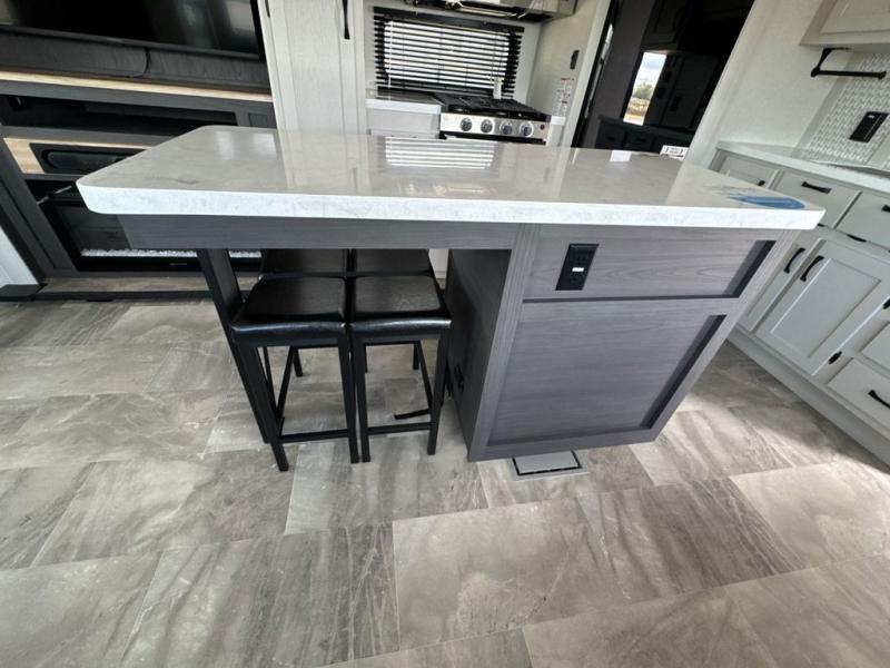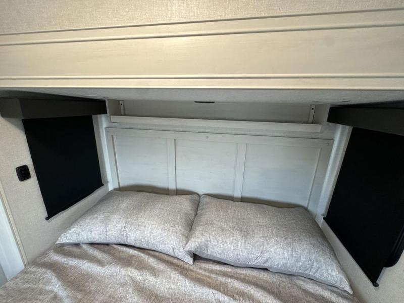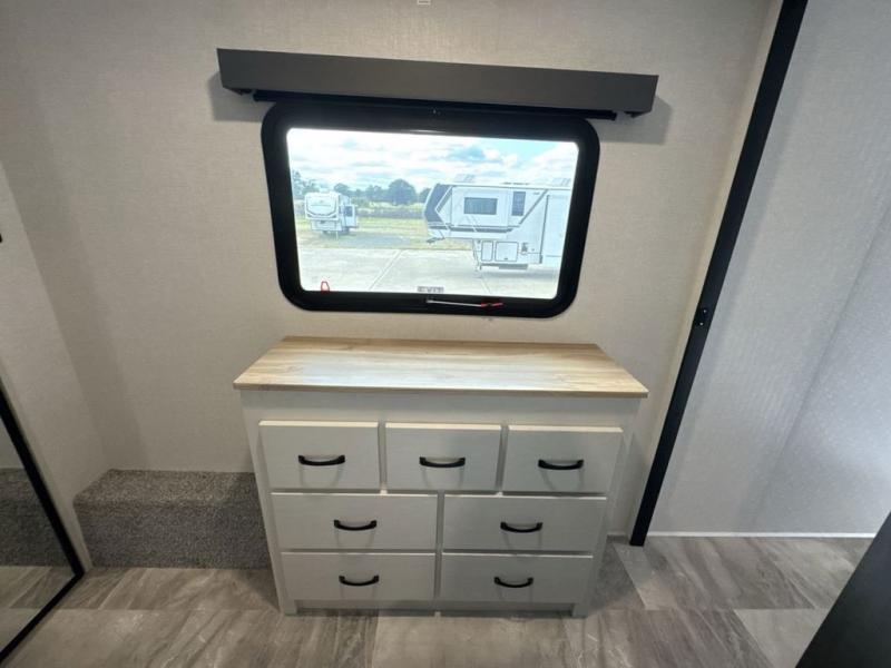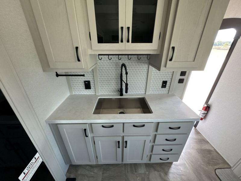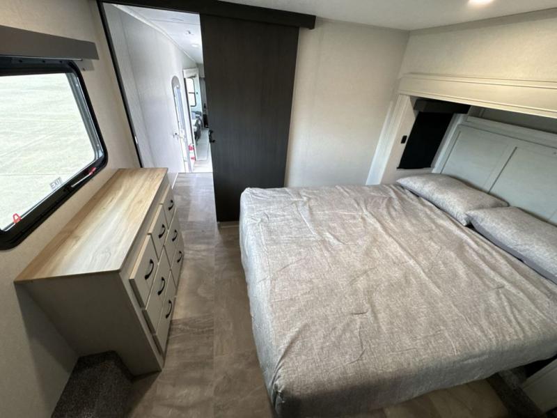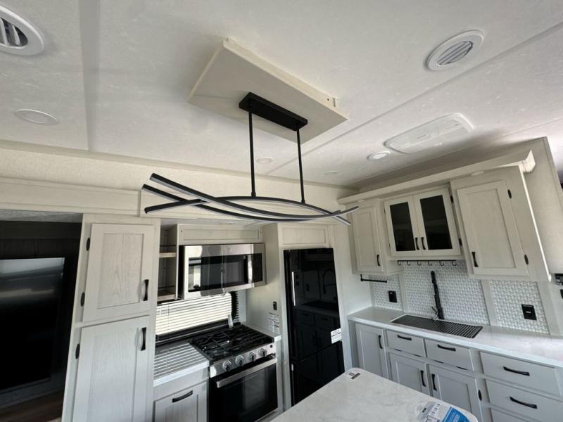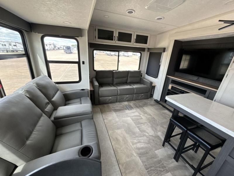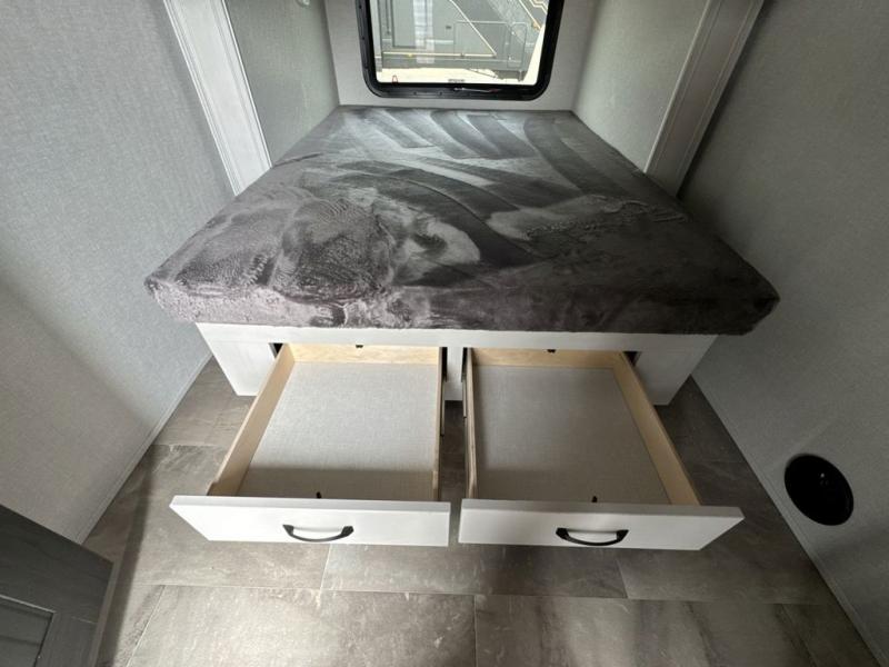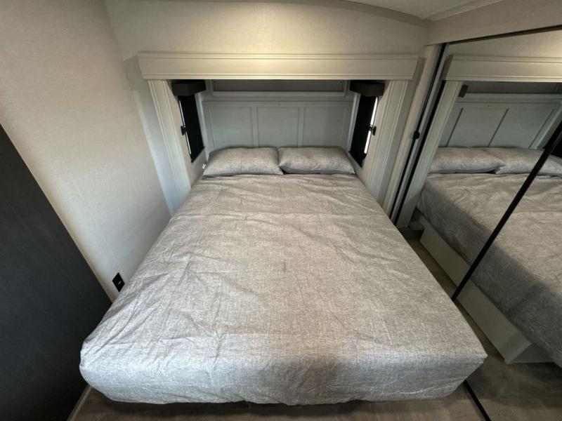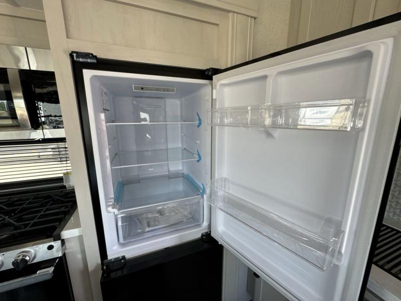 What could be better than a camping trip with family and friends? A camping trip in this spacious fifth wheel that can sleep eight people comfortably! There is a private middle bunkhouse with double-size bunks and overhead cabinets to store belongings, and a front private bedroom with a queen bed slide out. You'll find storage space in the large bedroom wardrobe that also includes washer and dryer prep if you plan to go full-time or camp for longer periods of time. Everyone can meet in the main living area that includes dual opposing slides, theatre seating, a free-spanning table, plus a tri-fold hide-a-bed sofa! And we didn't even mention the fully-equipped kitchen with stainless steel appliances, an extra deep single basin sink, plus tons of counter space with overhead cabinets for more storage!