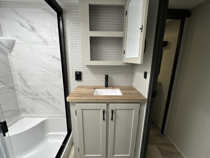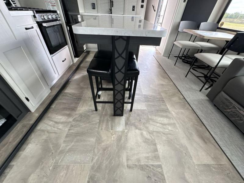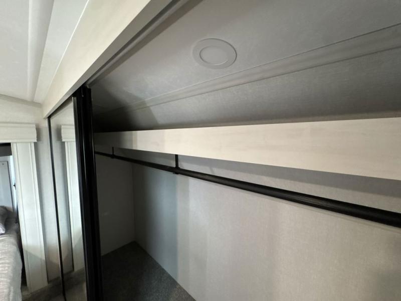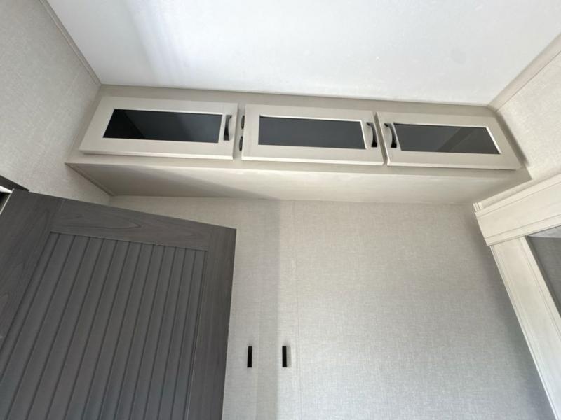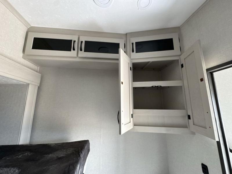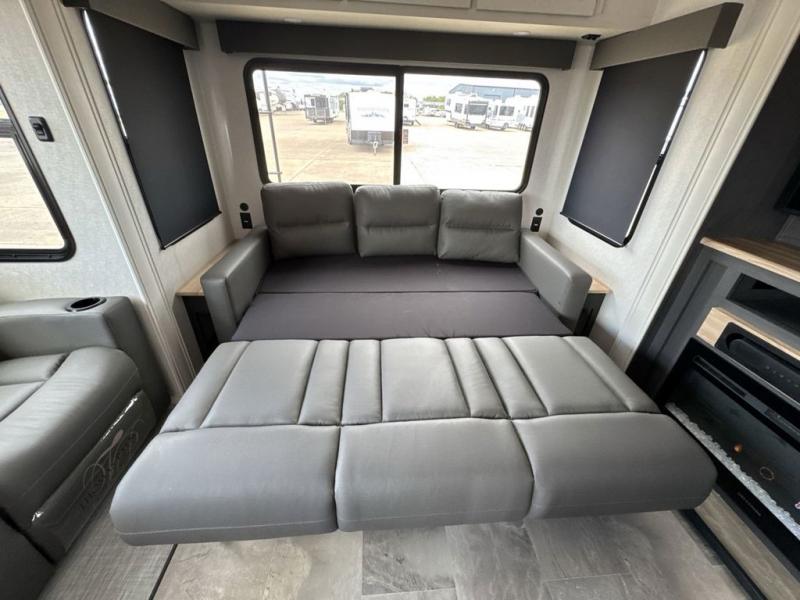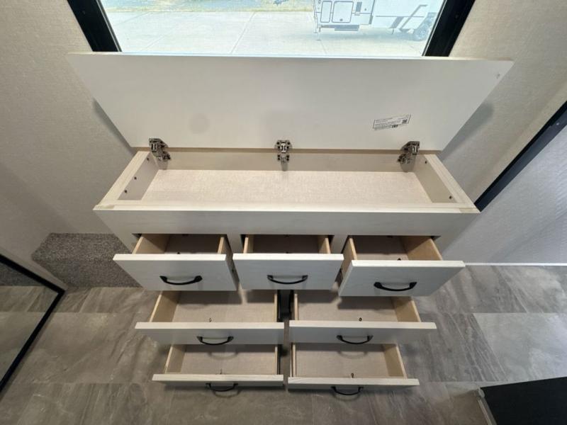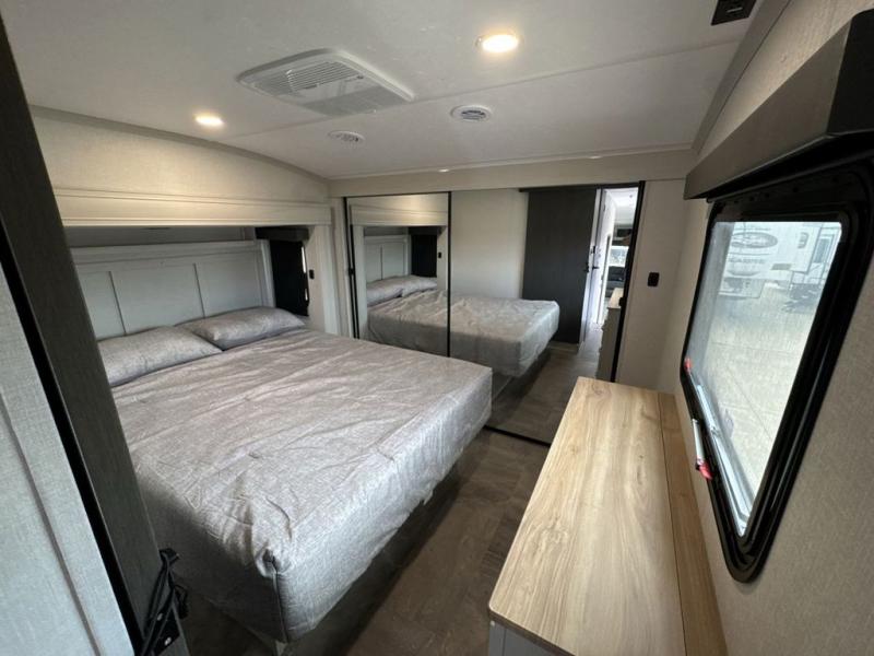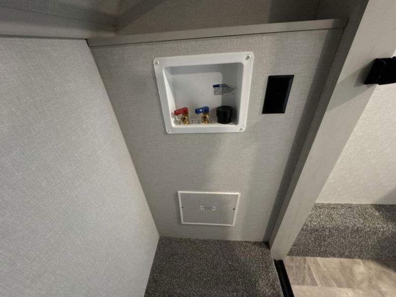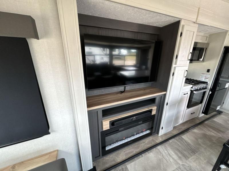 What could be better than a camping trip with family and friends? A camping trip in this spacious fifth wheel that can sleep eight people comfortably! There is a private middle bunkhouse with double-size bunks and overhead cabinets to store belongings, and a front private bedroom with a queen bed slide out. You'll find storage space in the large bedroom wardrobe that also includes washer and dryer prep if you plan to go full-time or camp for longer periods of time. Everyone can meet in the main living area that includes dual opposing slides, theatre seating, a free-spanning table, plus a tri-fold hide-a-bed sofa! And we didn't even mention the fully-equipped kitchen with stainless steel appliances, an extra deep single basin sink, plus tons of counter space with overhead cabinets for more storage!