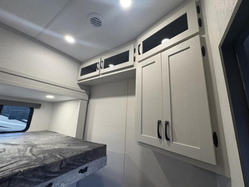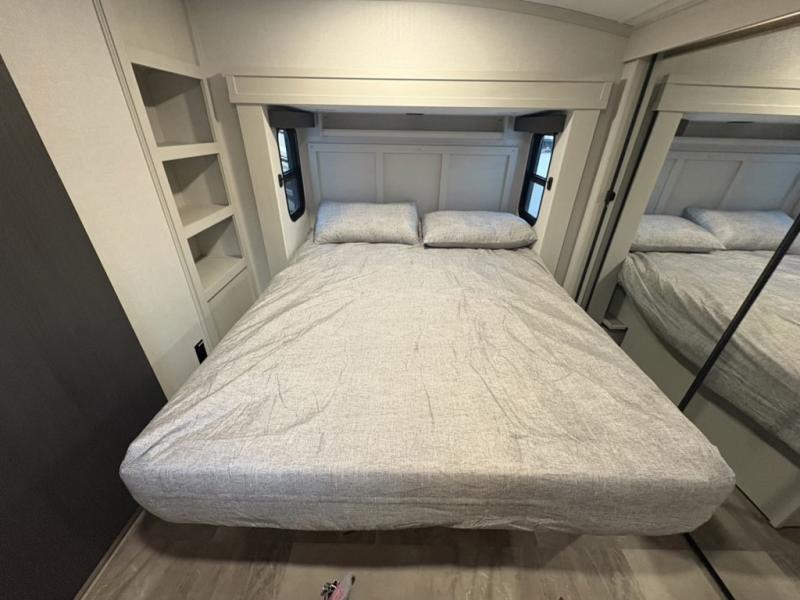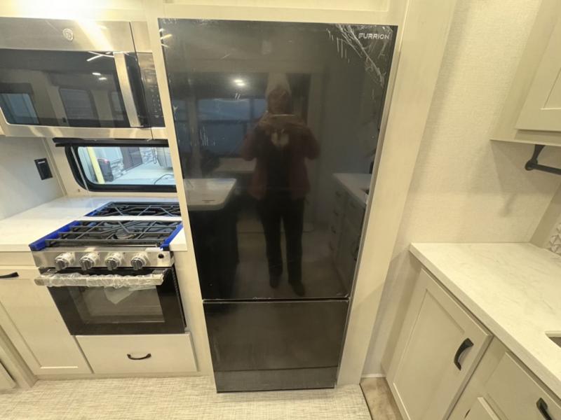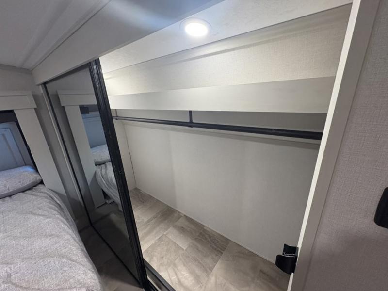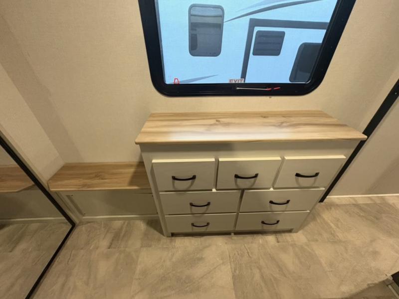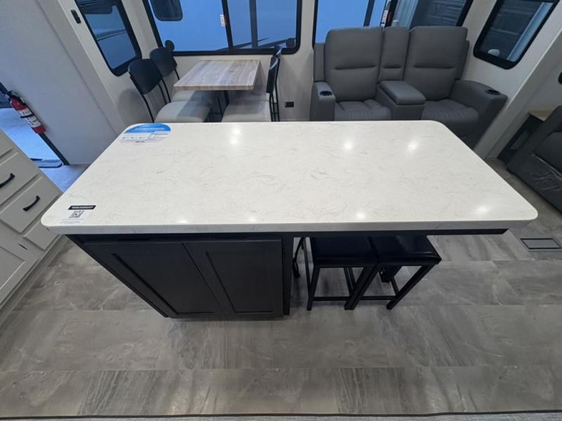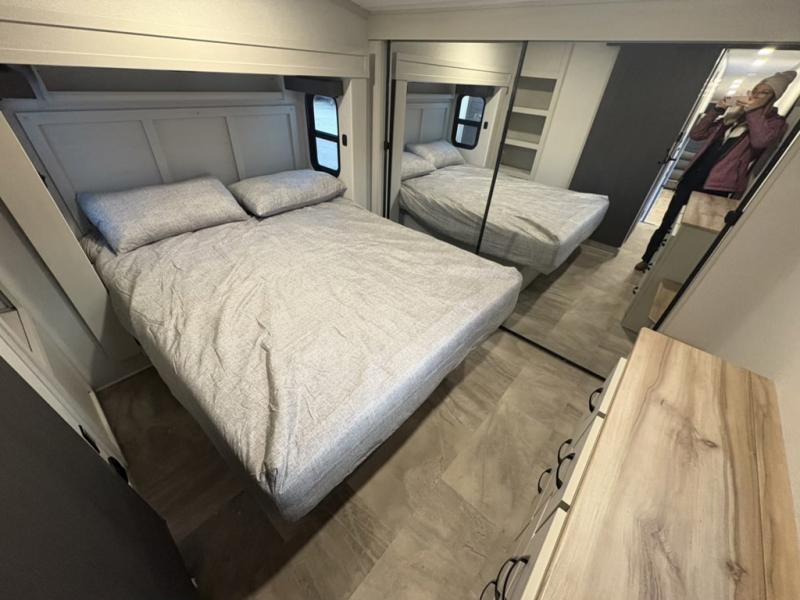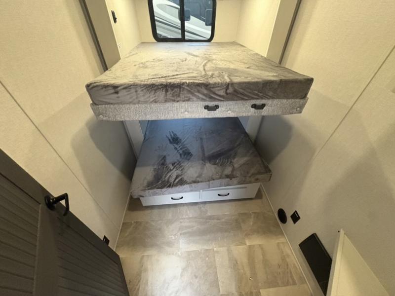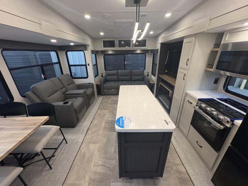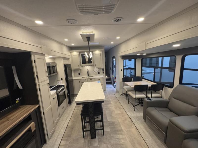 What could be better than a camping trip with family and friends? A camping trip in this spacious fifth wheel that can sleep eight people comfortably! There is a private middle bunkhouse with double-size bunks and overhead cabinets to store belongings, and a front private bedroom with a queen bed slide out. You'll find storage space in the large bedroom wardrobe that also includes washer and dryer prep if you plan to go full-time or camp for longer periods of time. Everyone can meet in the main living area that includes dual opposing slides, theatre seating, a free-spanning table, plus a tri-fold hide-a-bed sofa! And we didn't even mention the fully-equipped kitchen with stainless steel appliances, an extra deep single basin sink, plus tons of counter space with overhead cabinets for more storage!